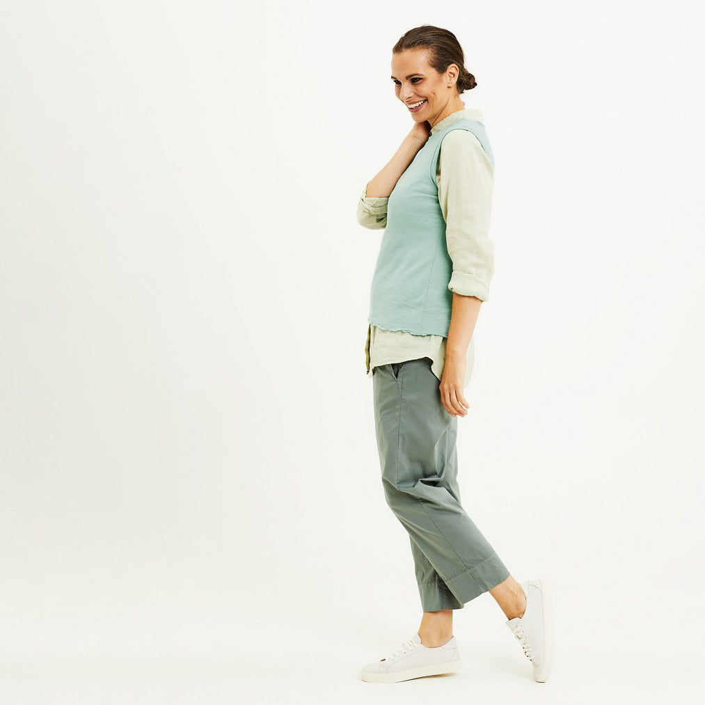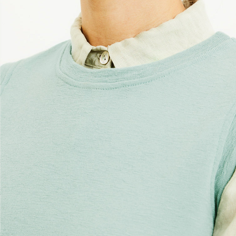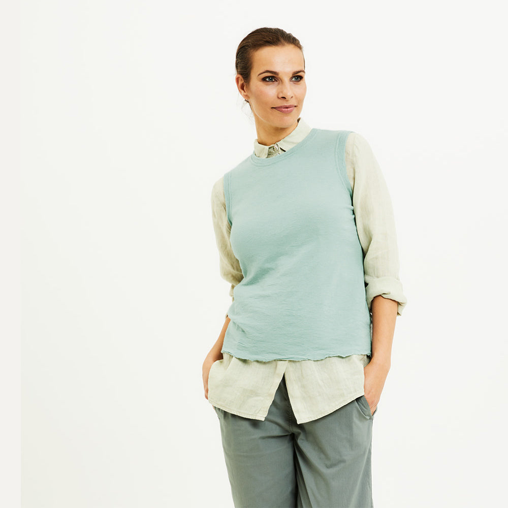 Slipover/väst i 100 % merinoull från danska Blusbar by basics. Tunn och underbart mjuk merinoull. Plagget har rå kant nertill och ganska hög rund hals. Kanten skapas på ett sätt som gör att den inte fransar eller repar upp sig.