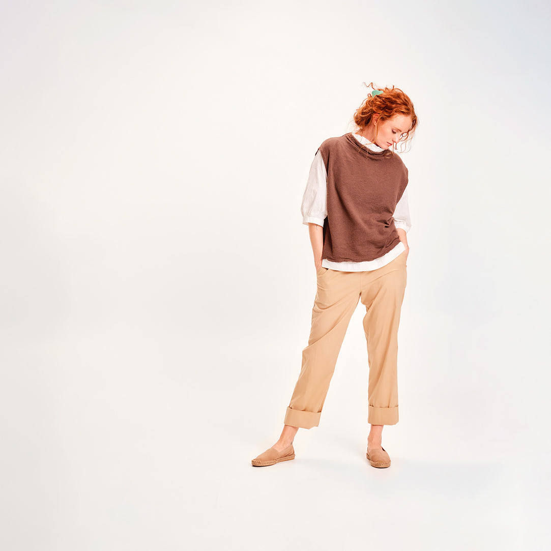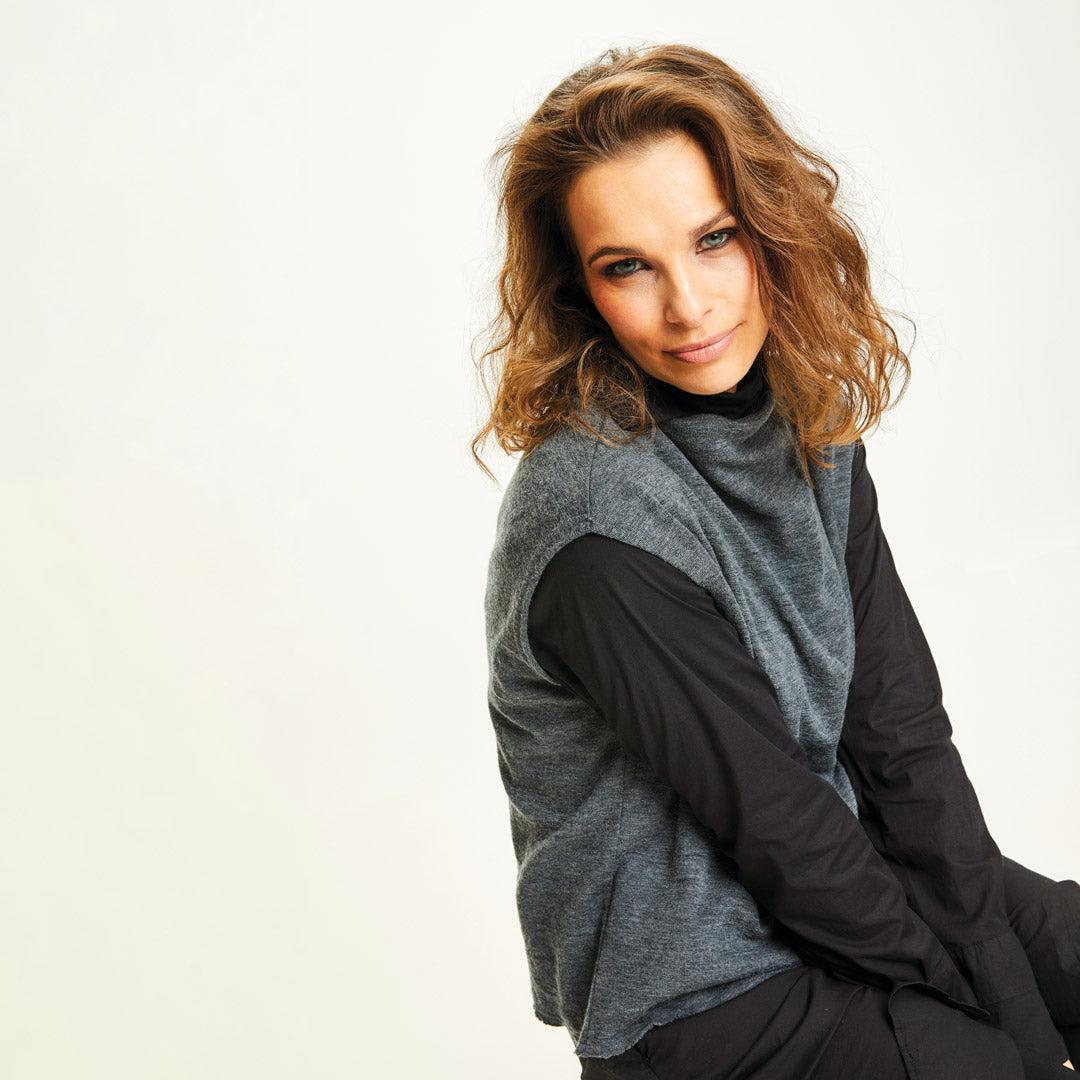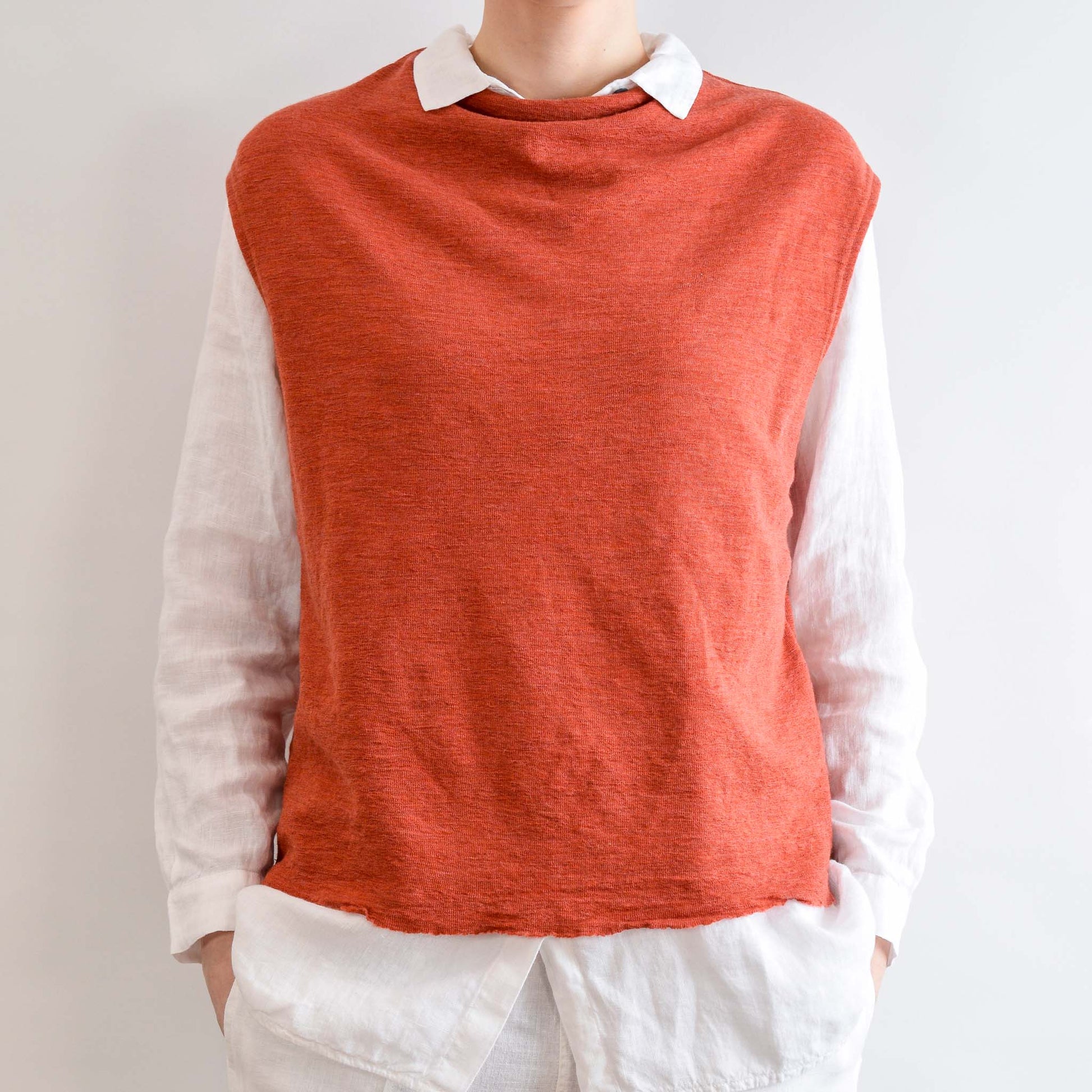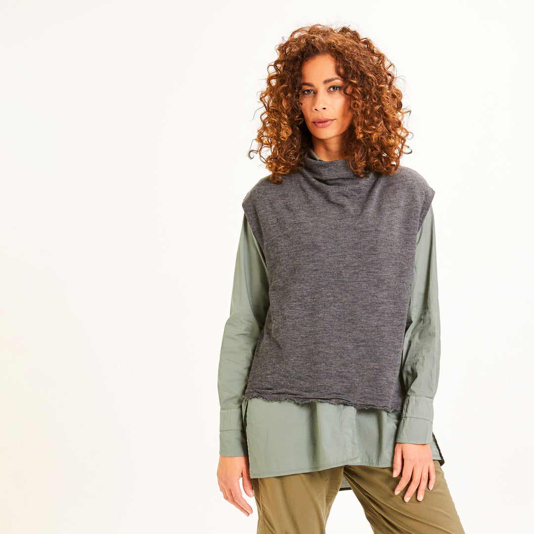 Slipover/väst i 100 % merinoull från danska Blusbar by basics. Tunn och underbart mjuk merinoull. Plagget har rå kant nertill och dubbelvikt draperad hals. Kanten skapas på ett sätt som gör att den inte fransar eller repar upp sig.