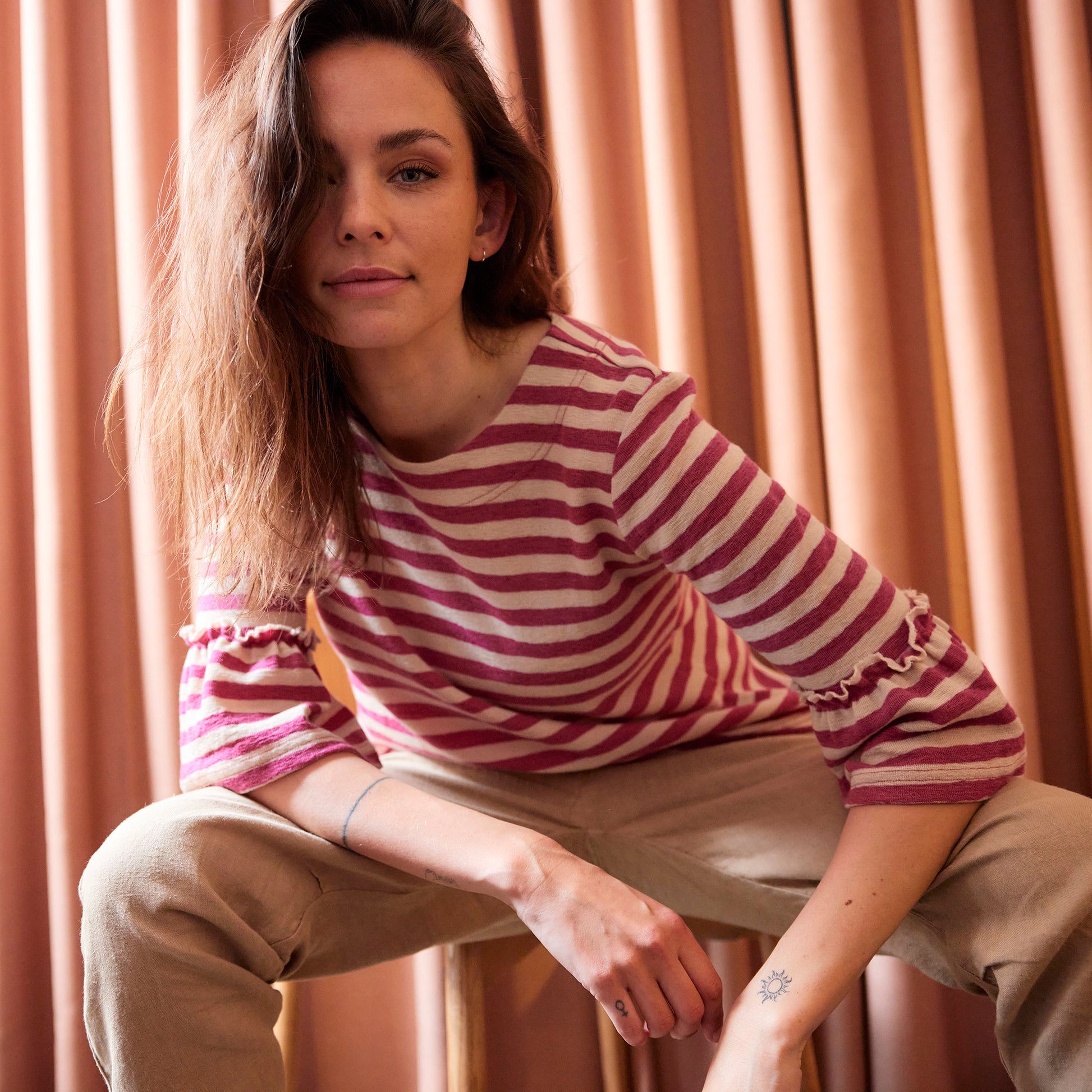 Välarbetad tröja i 100% merinoull från by basics. Trekvartsärm som avslutas med en fint rynkad volang som ger den i övrigt sparsmakade tröjan något extra.
