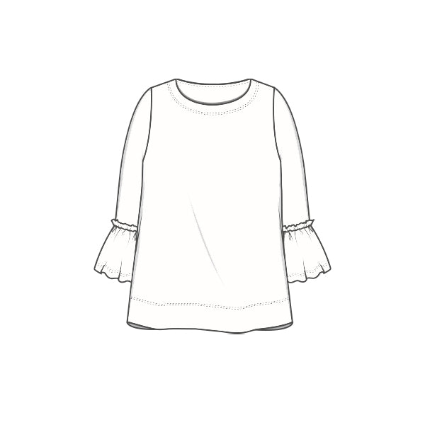- Fållad kant längs halsringningen, ärmarna och nertill.