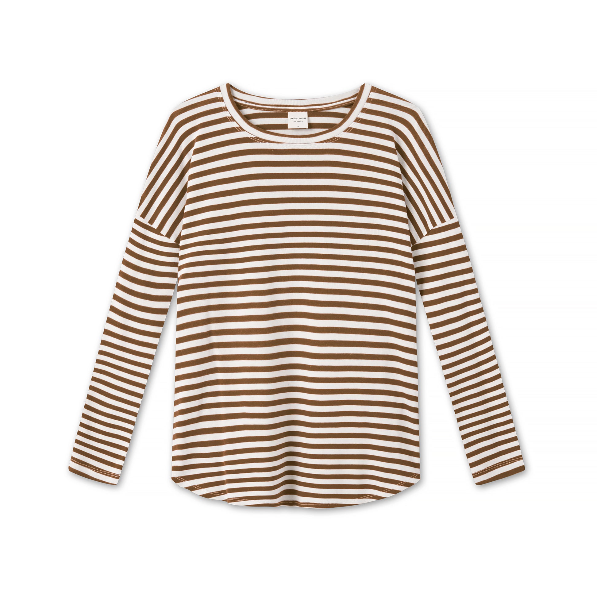"Loose" (lätt oversize) t-shirt i 100% bomullstrikå. Rak och lös modell med lång ärm och nedhasad axelsöm. Något rundad nedtill.