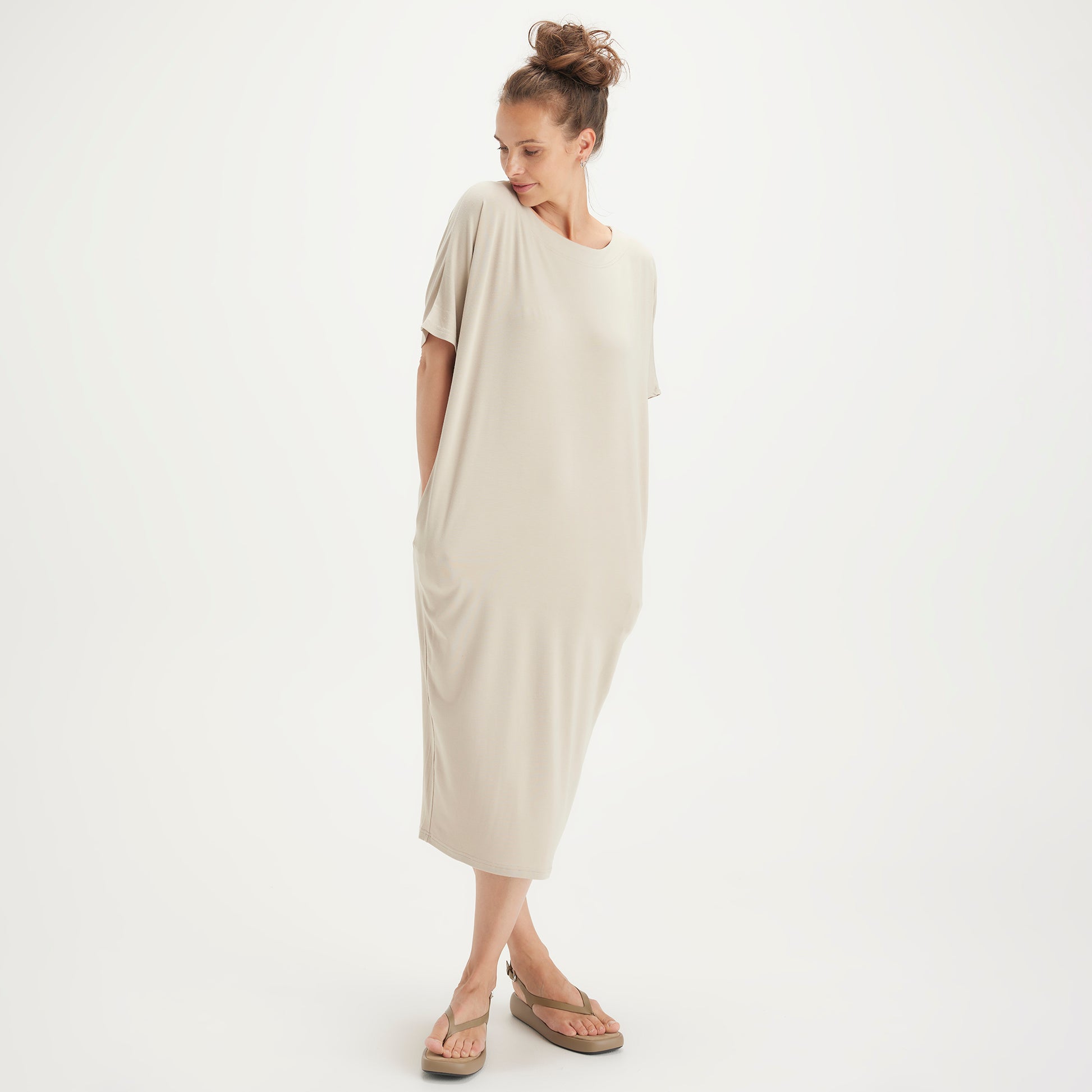Båtringad klänning med kort ärm i otroligt mjuk och följsam bambulyocell, 100% oeko-tex certifierad, från bamboo by basics. Bambu andas och är temperaturreglerande och känns mjukt och svalt mot huden.