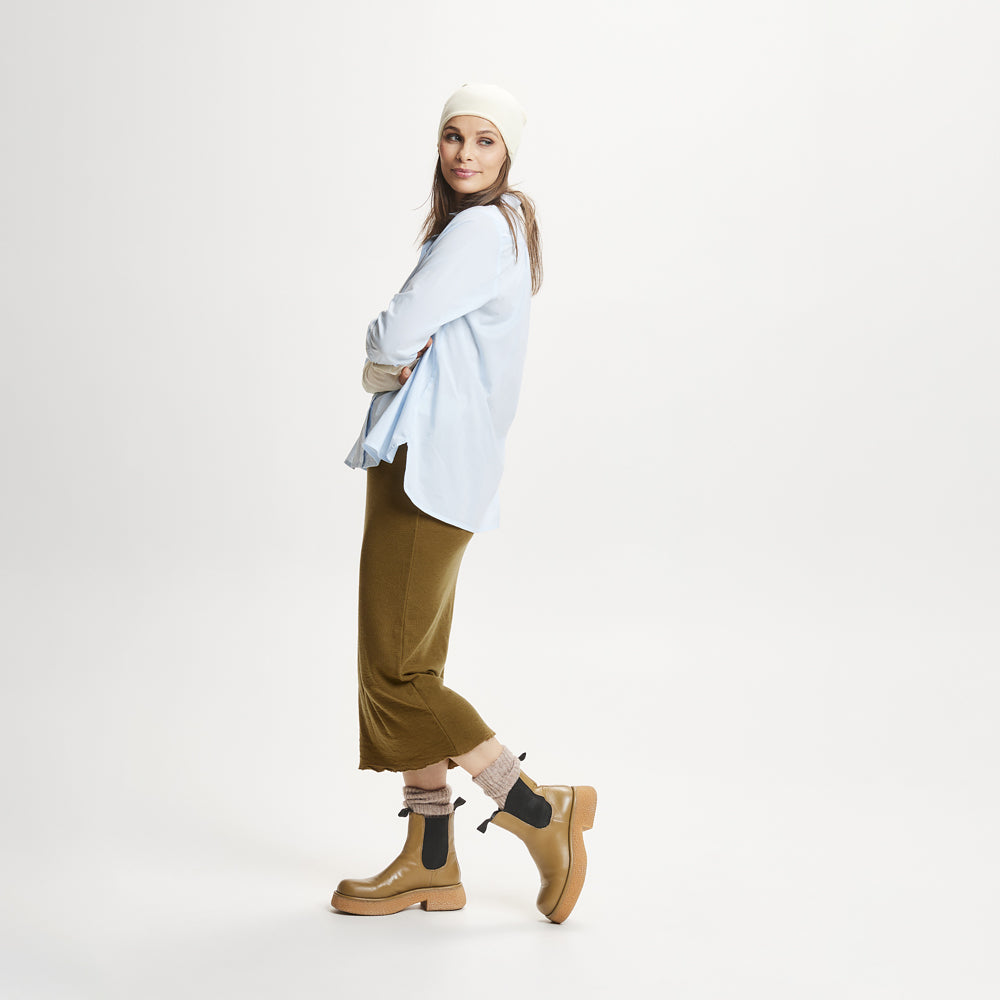 Snäv vadlång kjol i 100 % merinoull från danska Blusbar by basics. Tunn och underbart mjuk merinoull. Kjolen har "råa" kanter längs nederkanten.