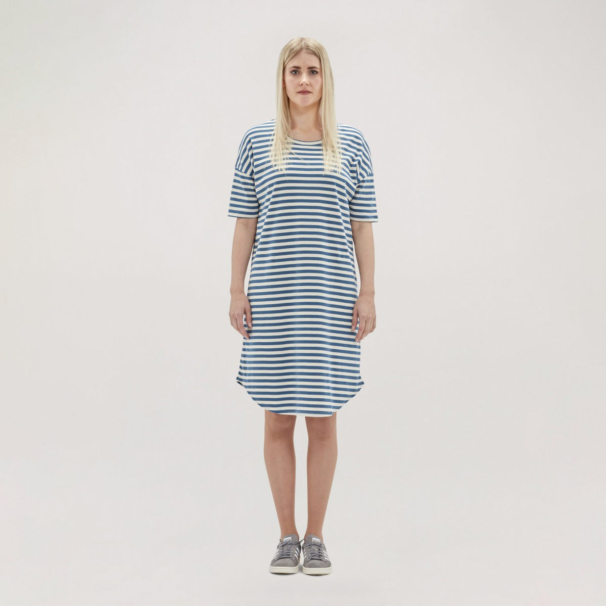 "Loose" (lätt oversize) klänning i 100% bomullstrikå. Rak och lös modell, rundad nedtill med kort ärm och nedhasad axelsöm.