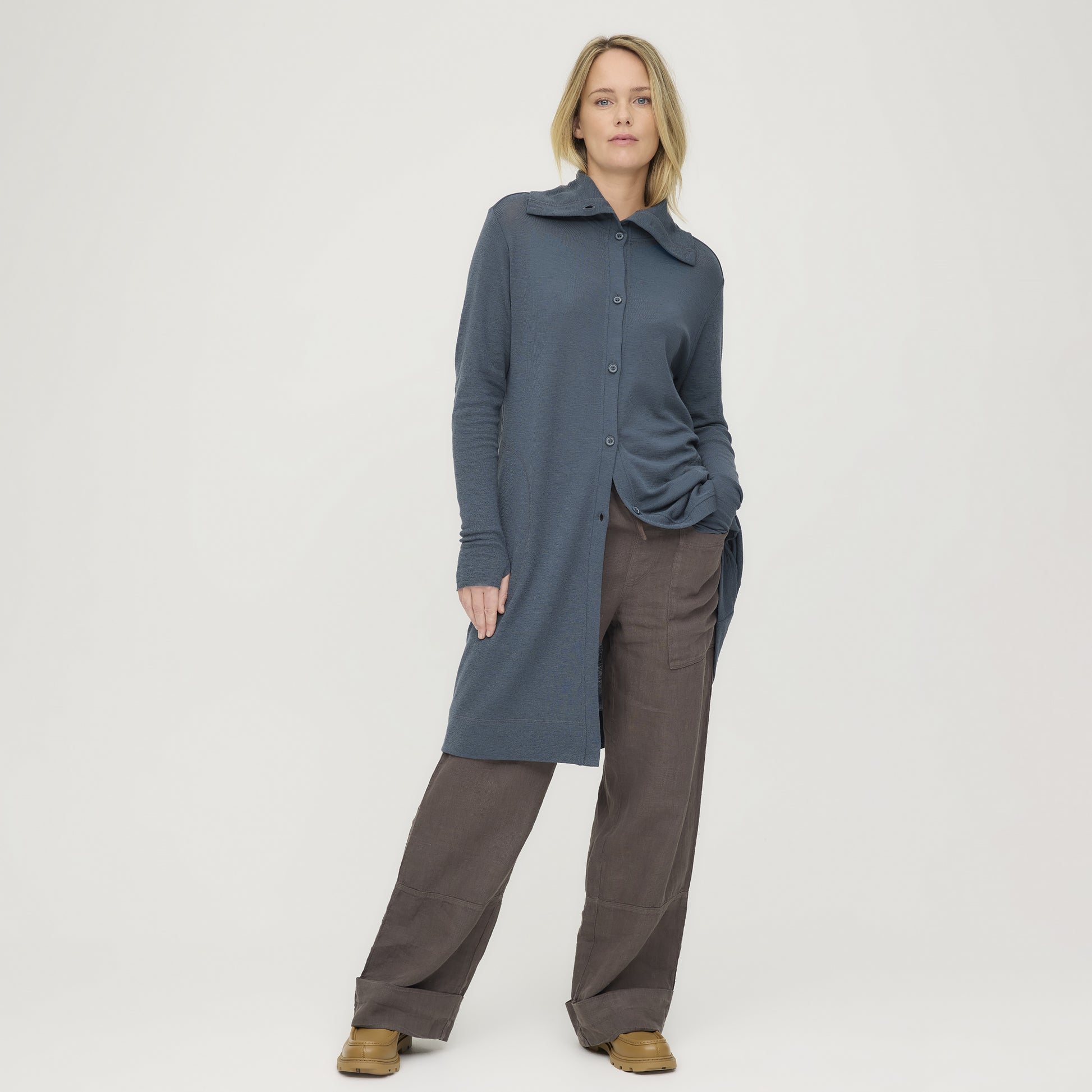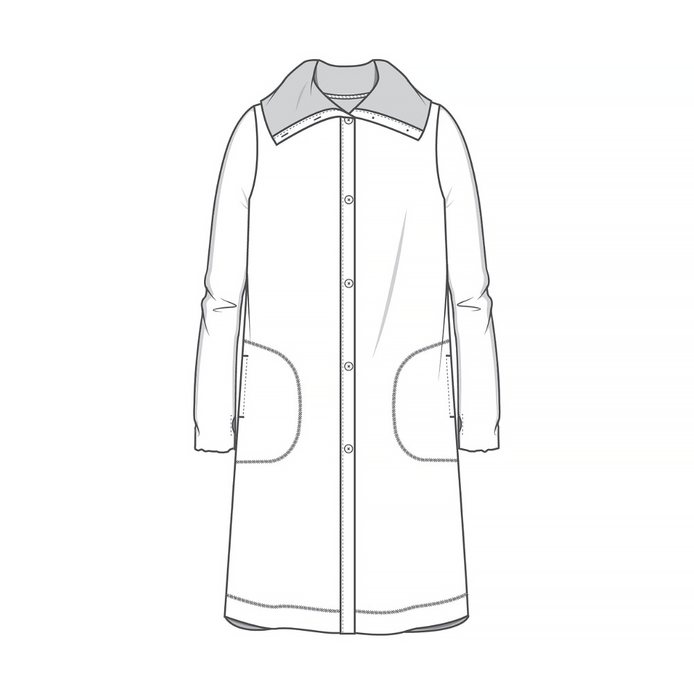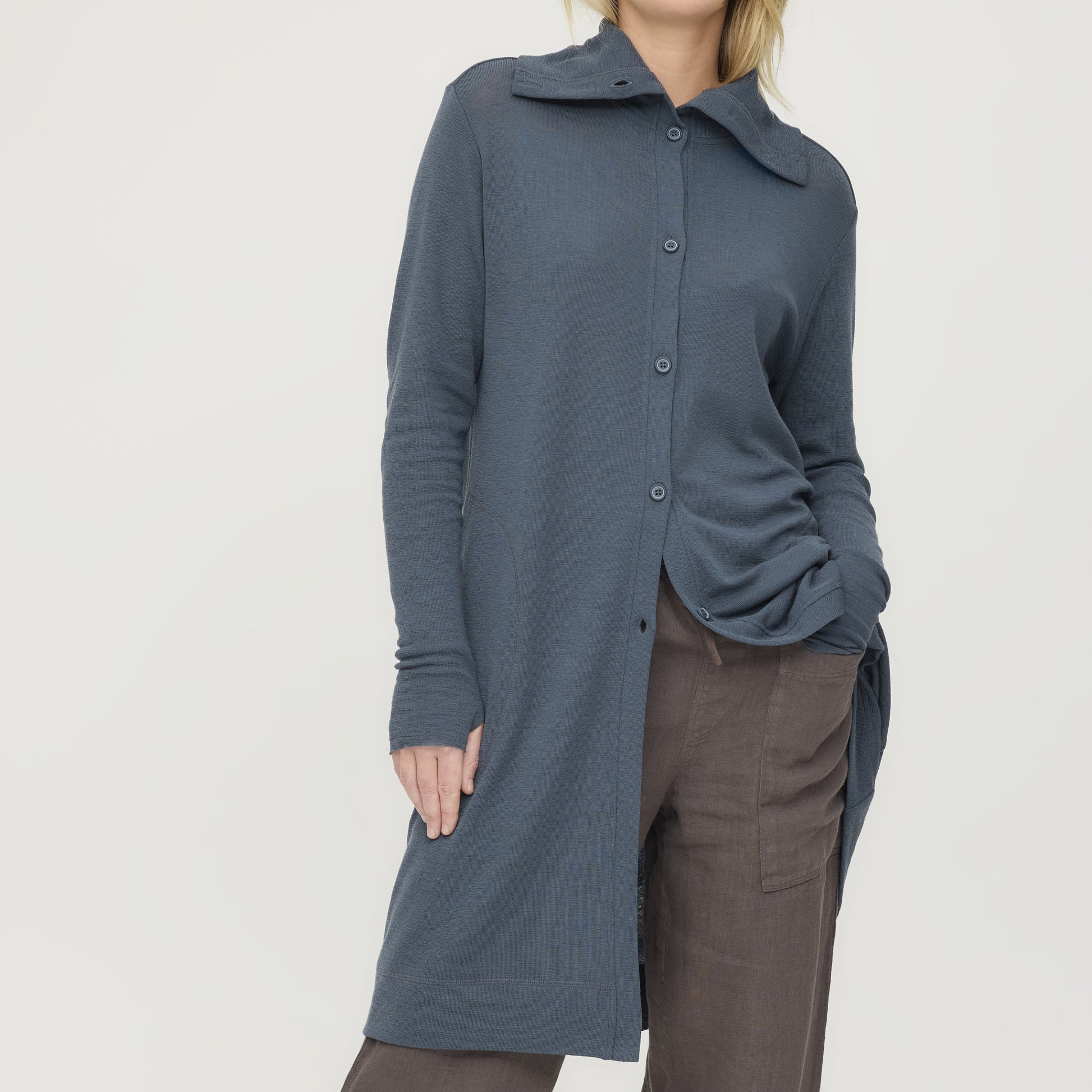 8019 - Knälång kofta med hög krage, fickor och tumhål