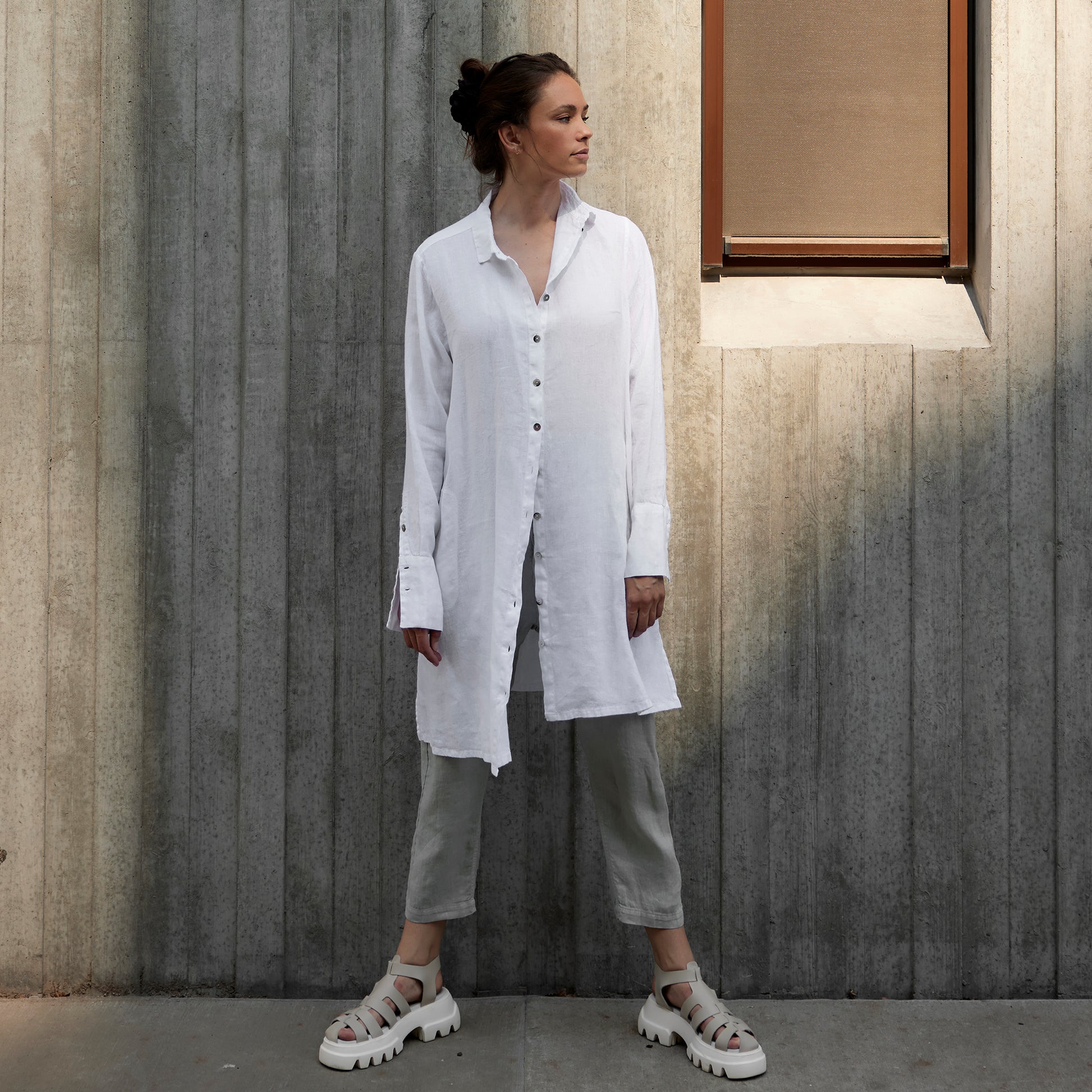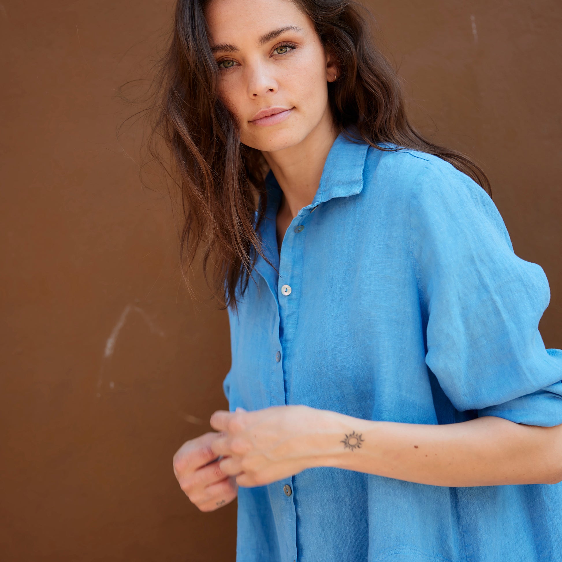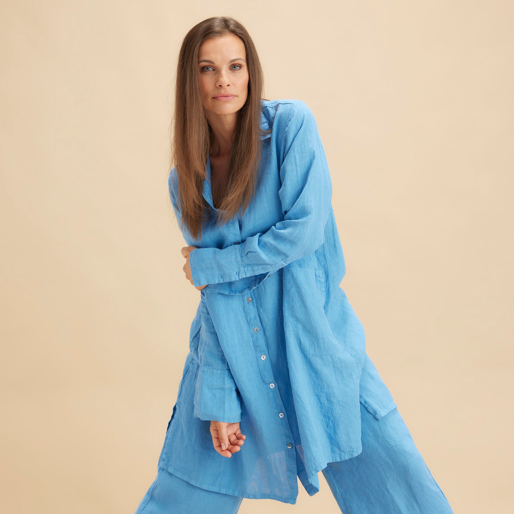 Plagget är färgat, tvättat och tumlat efter sömnad vilket innebär att linnet är mjukt och har ett lätt tvättat utseende.