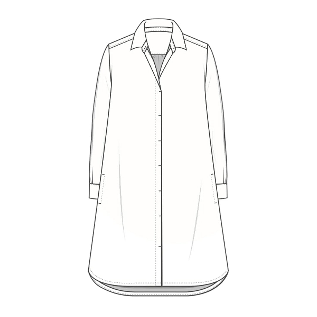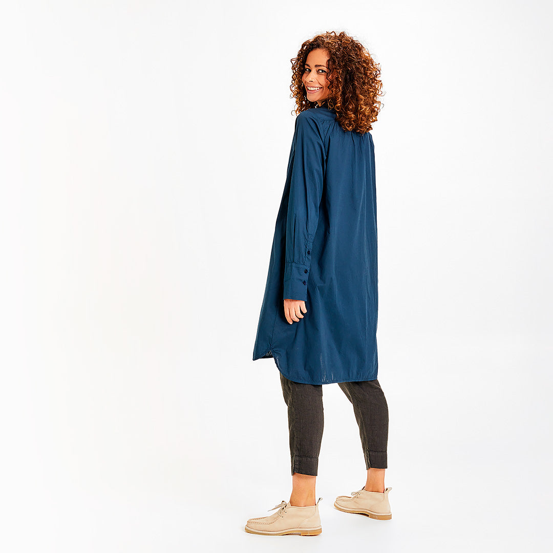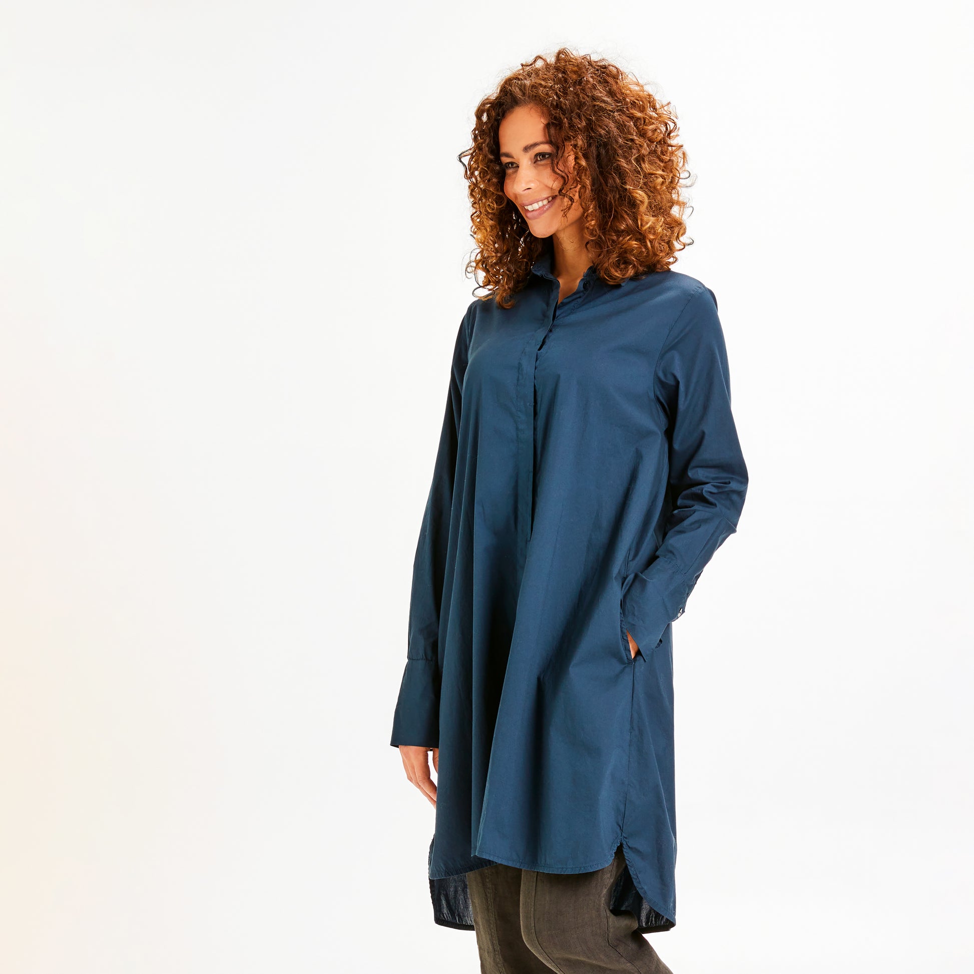 Snyggt A-ställd skjortklänning i lätt och mjuk bomullspoplin, från OWN by basics. Mycket klädsam modell även på en lite rundare kropp. Använd knäppt som klänning eller öppen som långskjorta över tröja och byxor.