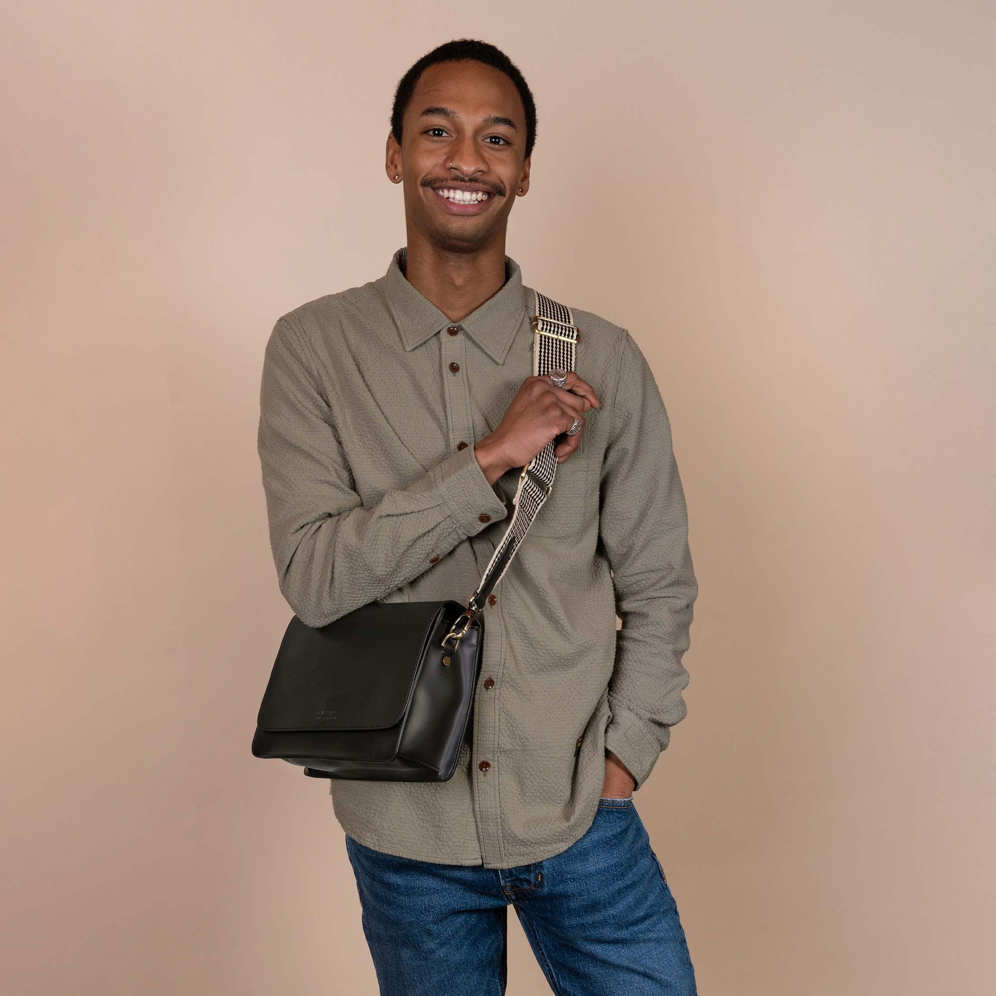 Audrey kommer med två olika justerbara axelremmar: en bredare vävd svart-vit rutig textilrem och en smalare i matchande äppelläder.