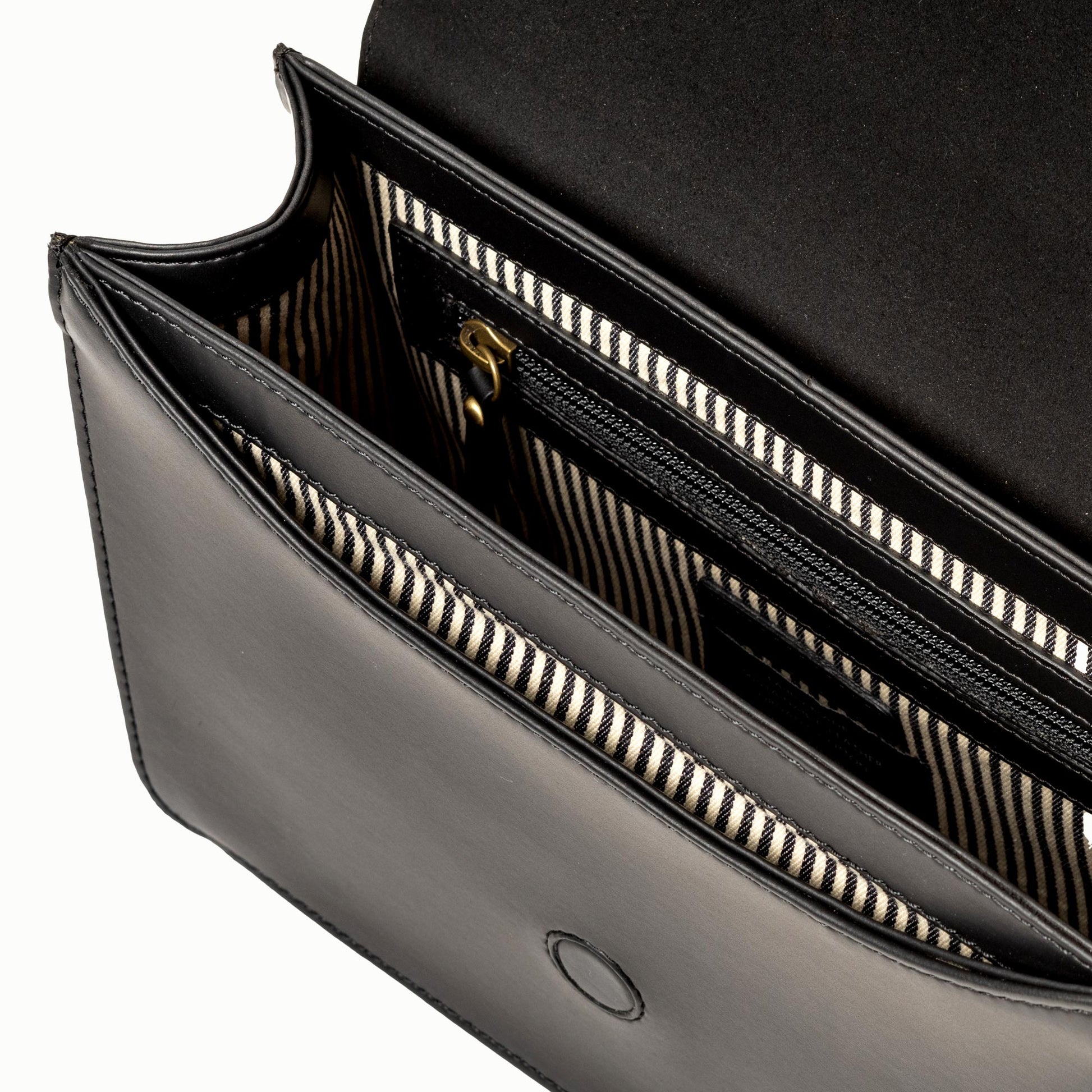 Väskan Audrey är slät utvändigt och insidan är fodrad med randigt canvastyg i svart och vitt. Väskan har lock som knäpps med dold magnetisk tryckknapp. Ett större fack rymmer allt det nödvändiga och lite till. Väskan har även ett praktiskt yttre fack och en inre ficka med dragkedja.