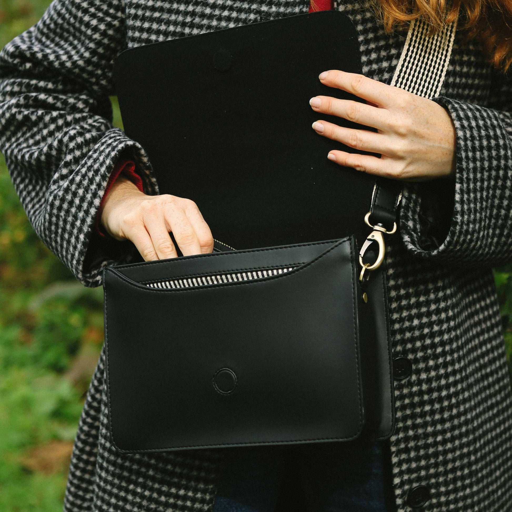 Klassisk handväska i minimalistisk design tillverkad av äppelläder, ett veganskt alternativ till traditionellt läder. Från O My Bag, Amsterdam.