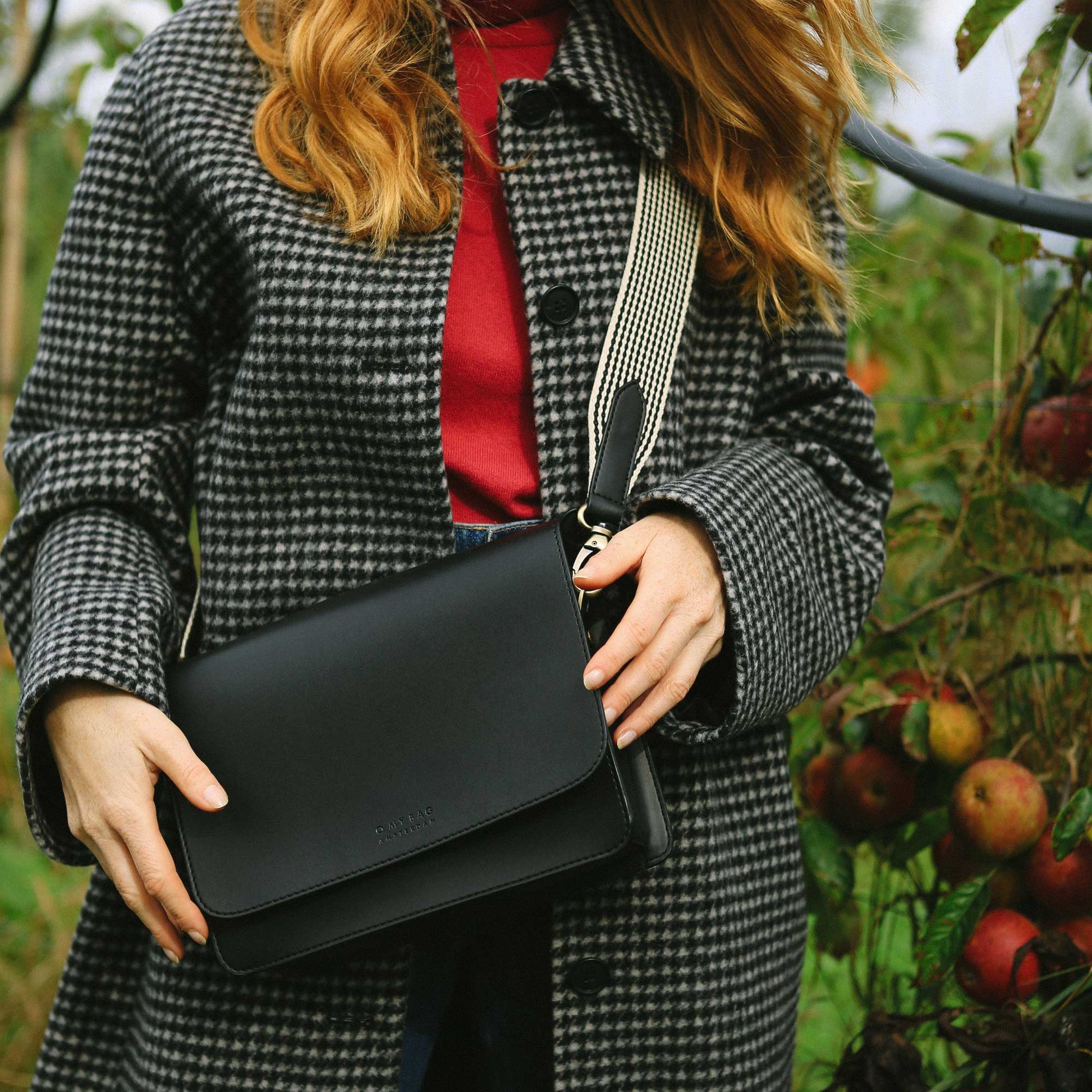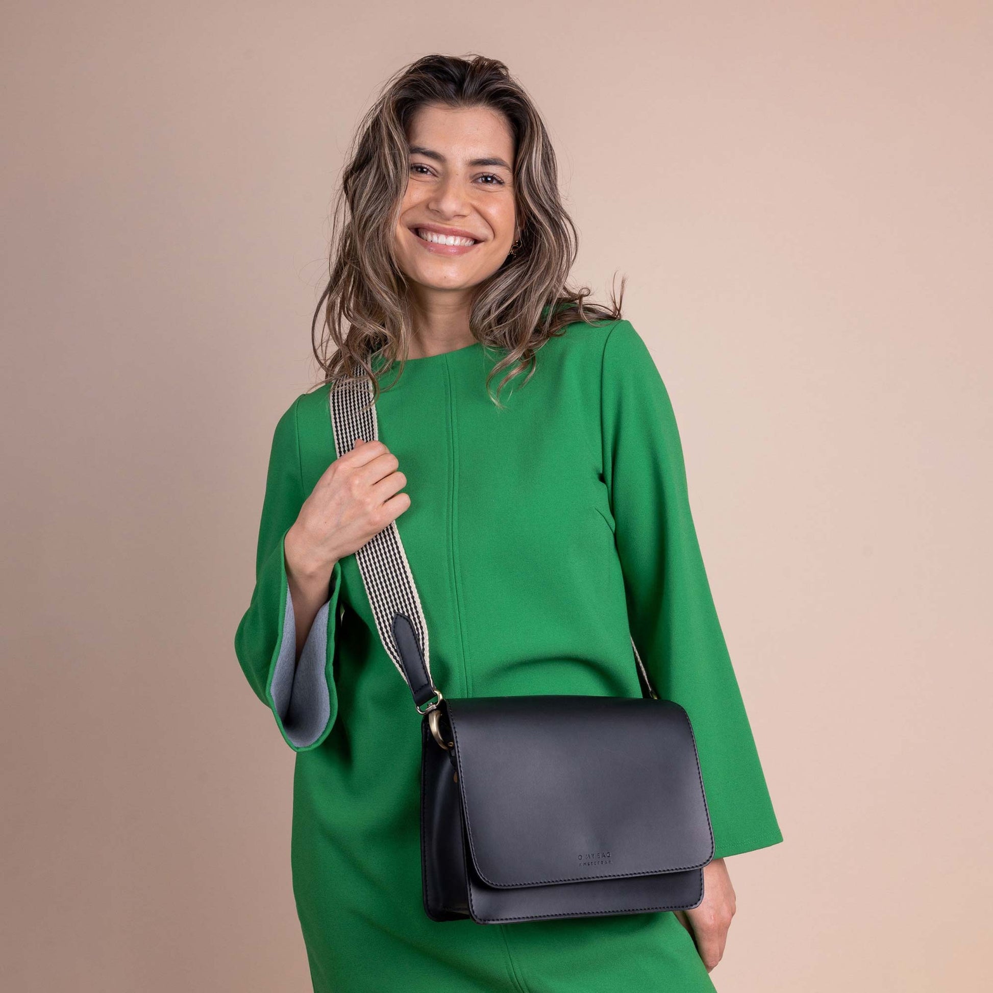 Audrey kommer med två olika justerbara axelremmar: en bredare vävd svart-vit rutig textilrem och en smalare i matchande äppelläder.