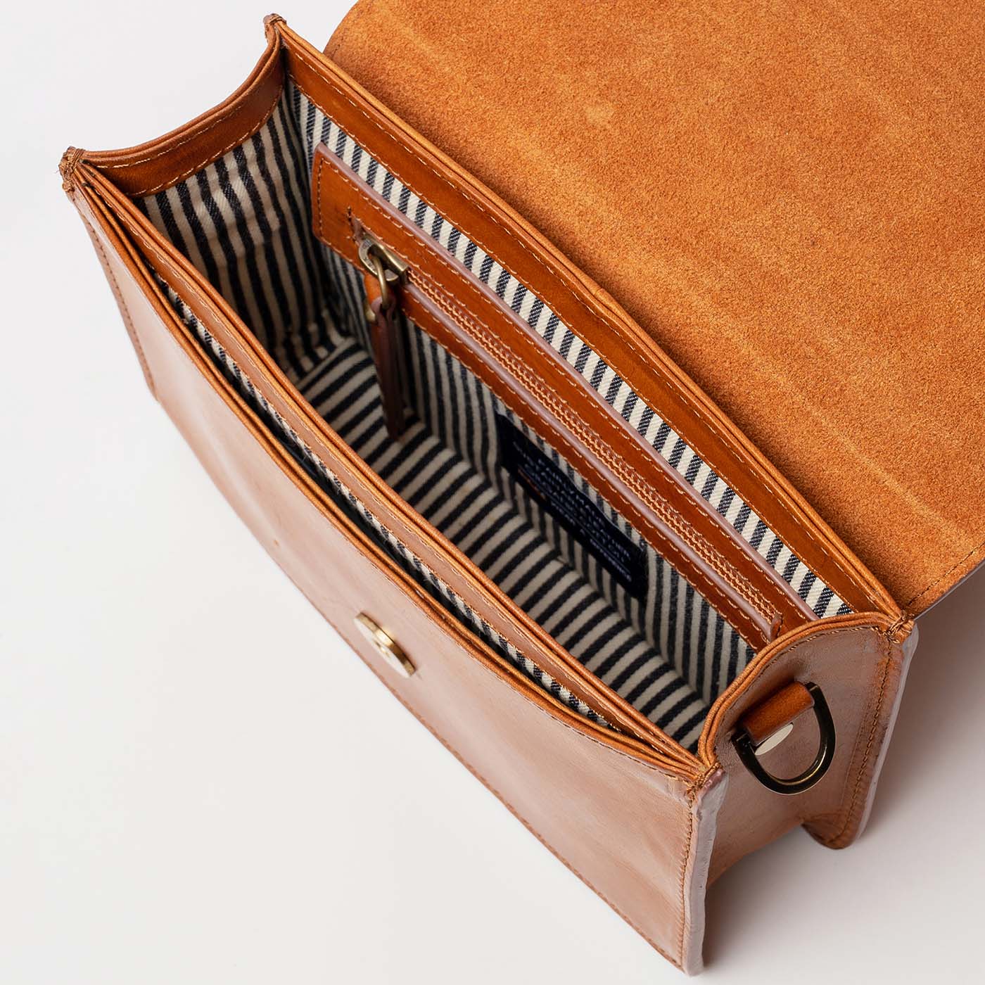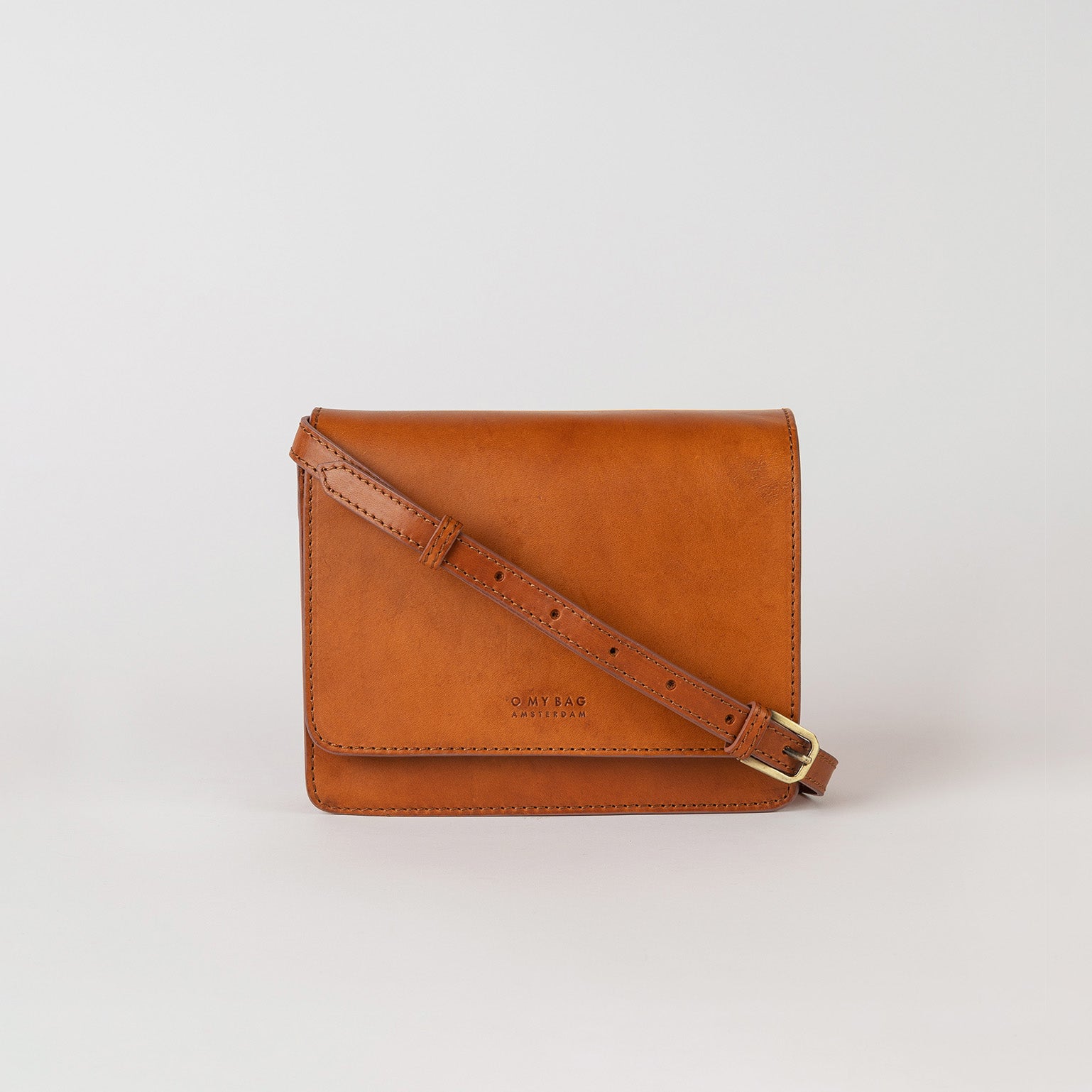 Klassisk mindre handväska i minimalistisk design i vackert cognacsfärgat äkta läder. Från O My Bag, Amsterdam.