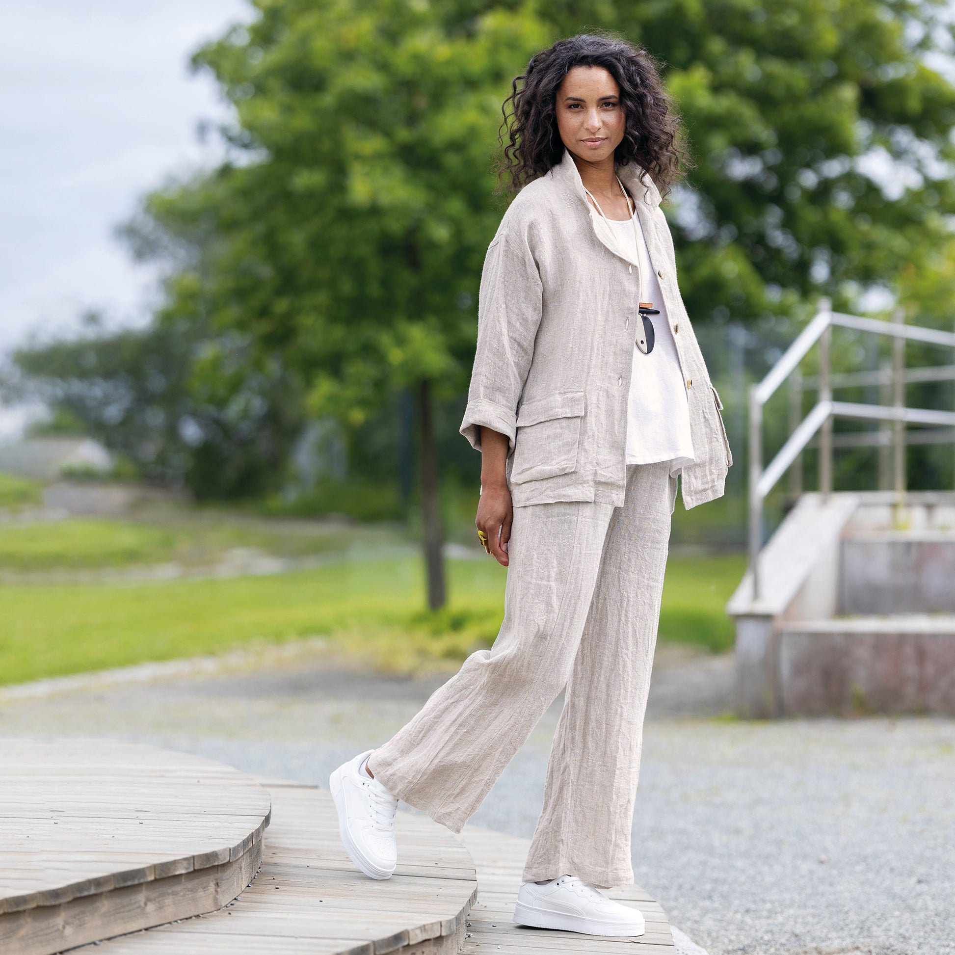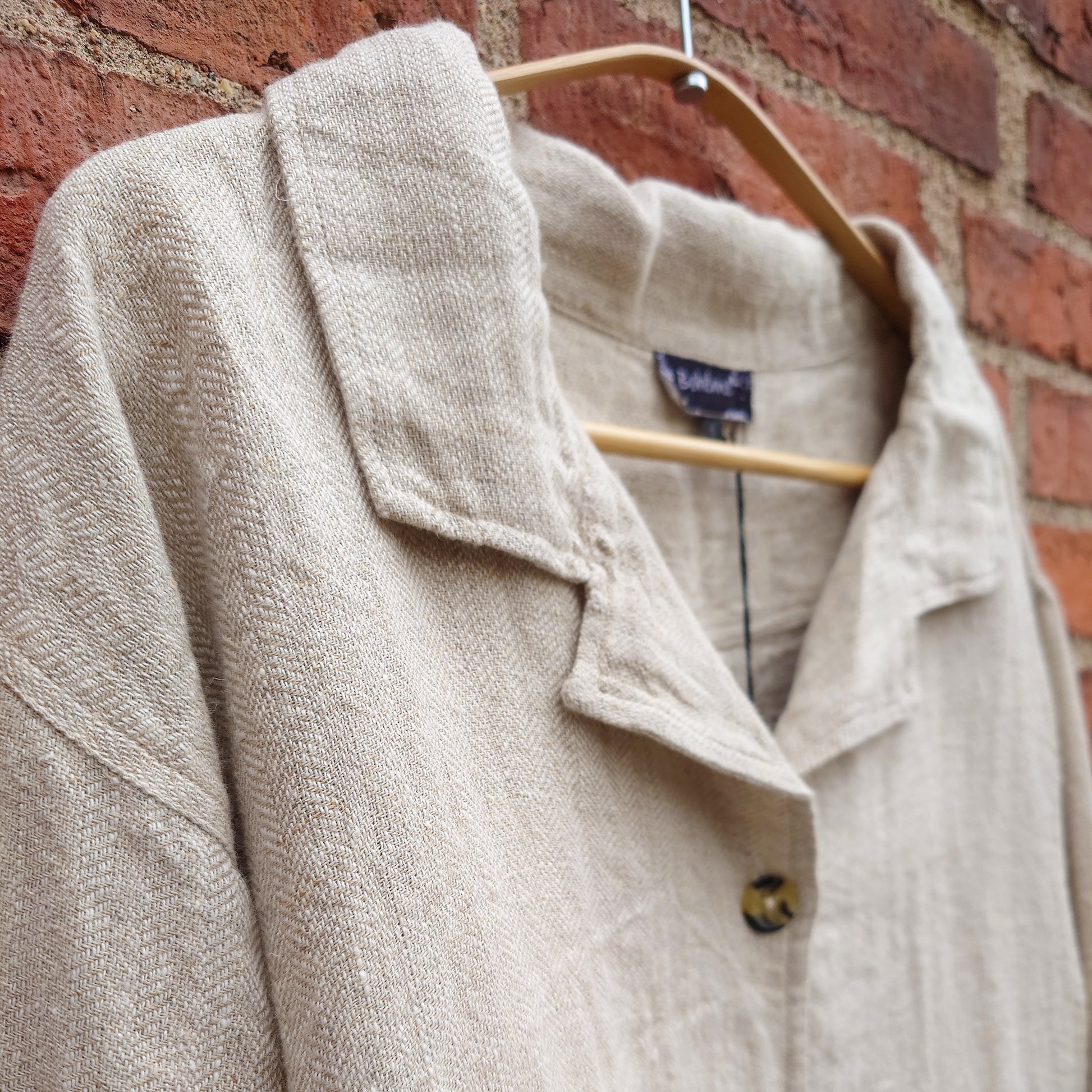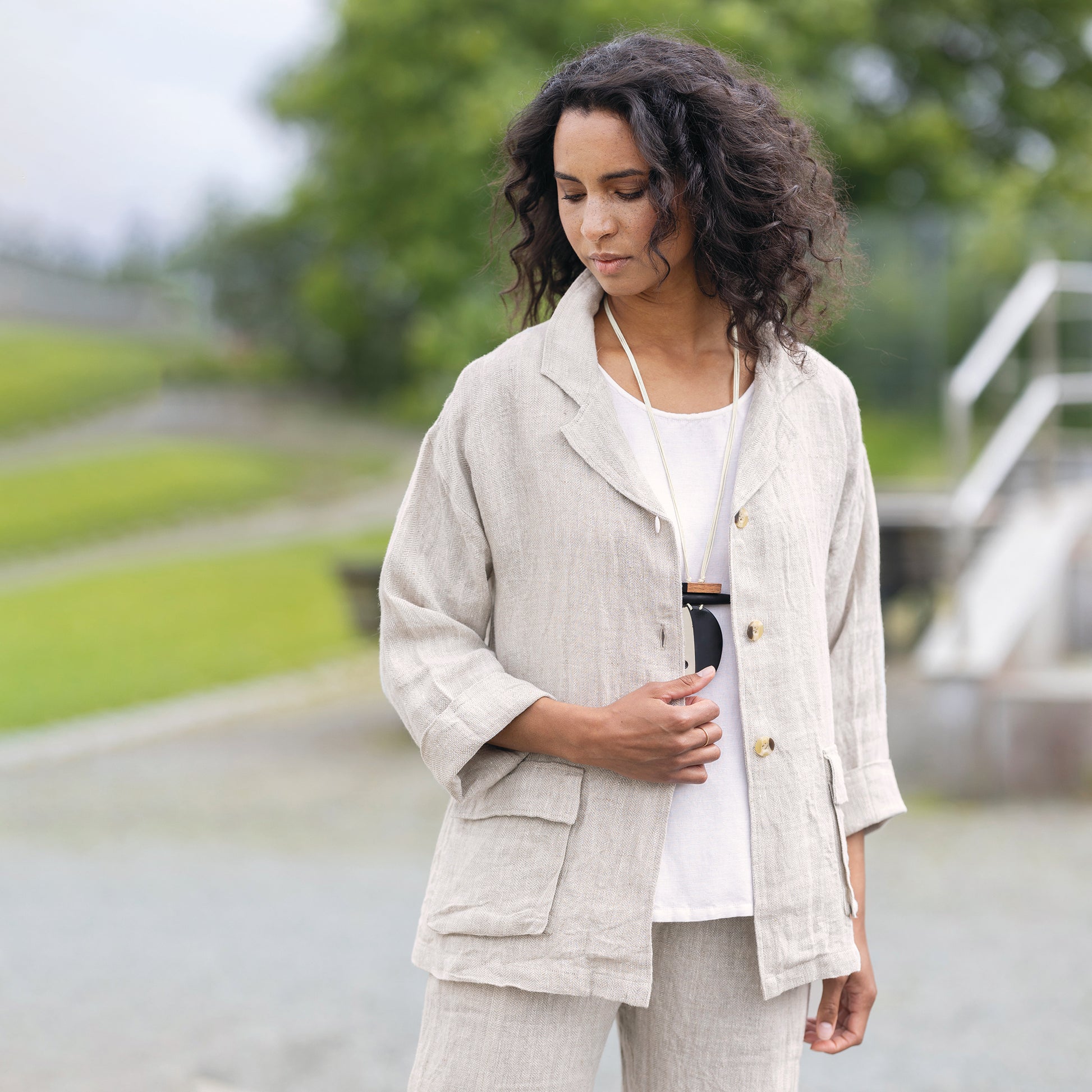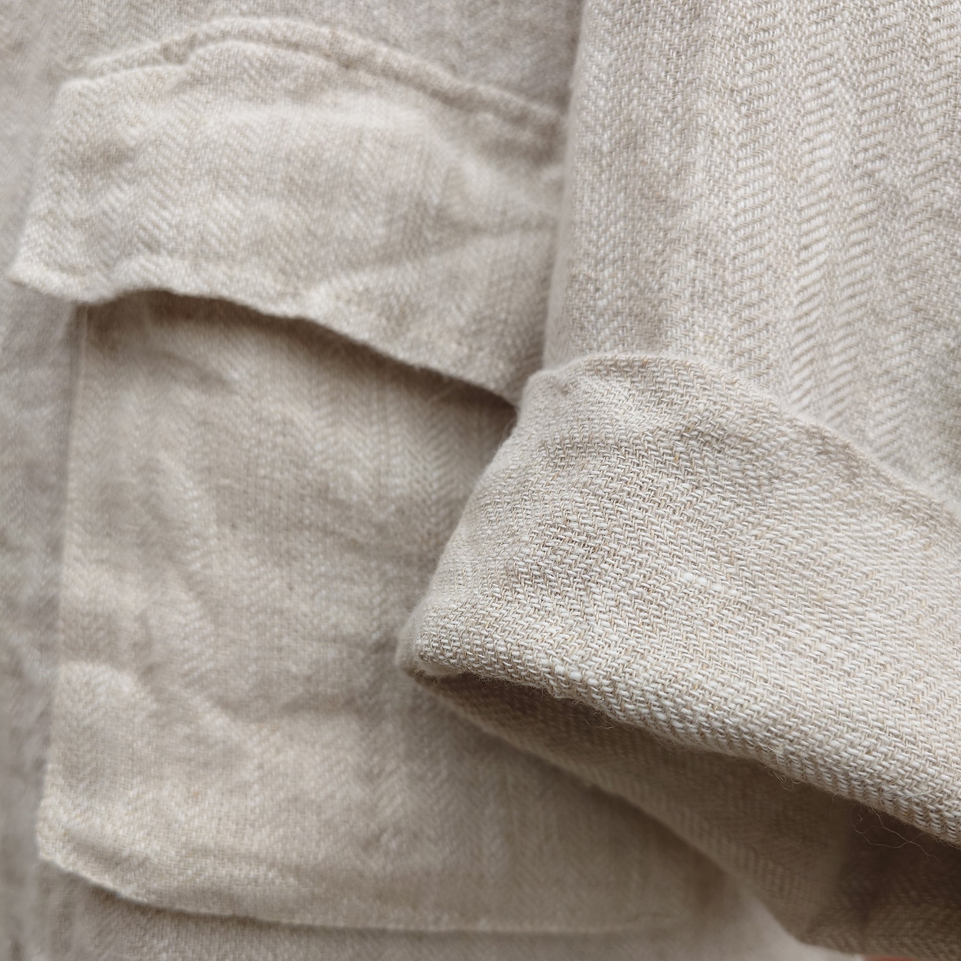 Ljust naturfärgad jacka i grovt fiskbensmönstrat linne. Från norska märket Boheme.