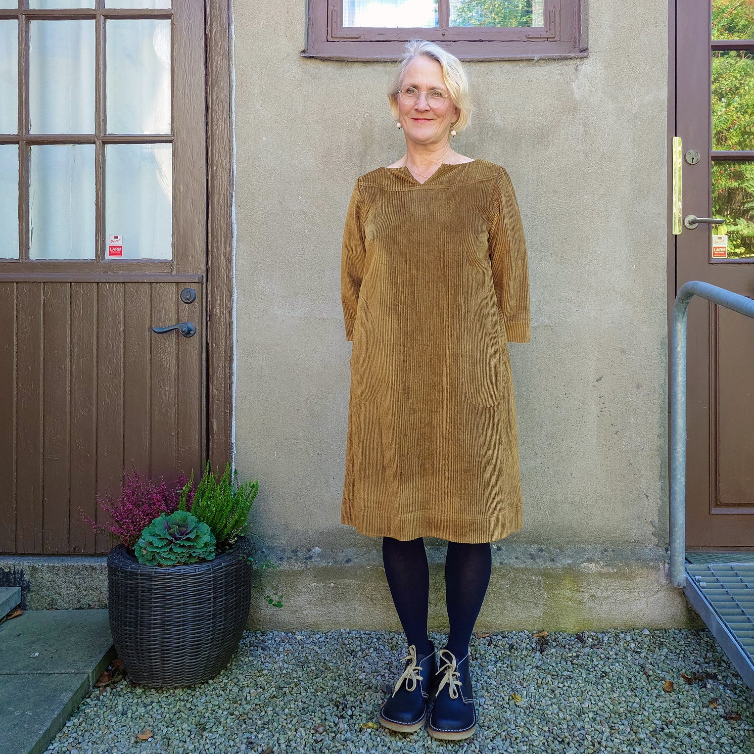 Formen, längden och de stora rundade fickorna tillsammans med den bredspåriga manchestern skapar en härlig retrokänsla. En riktigt fin höst- och vinterklänning.