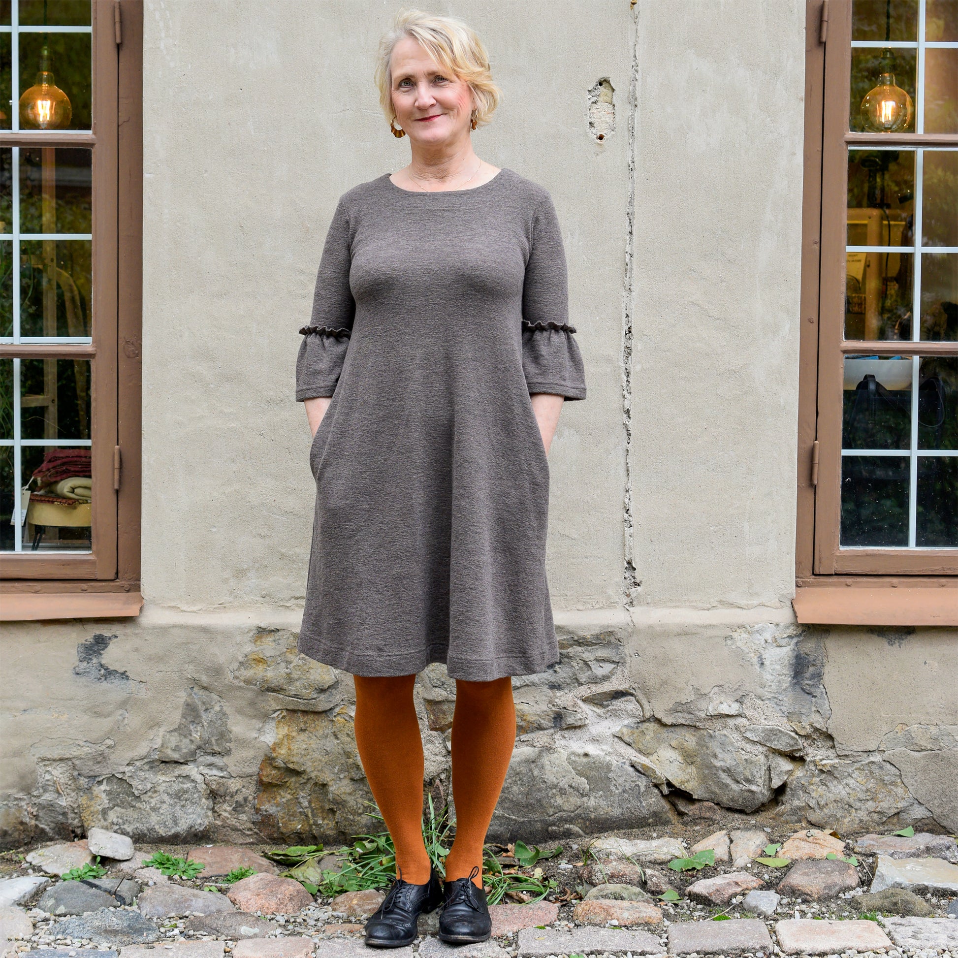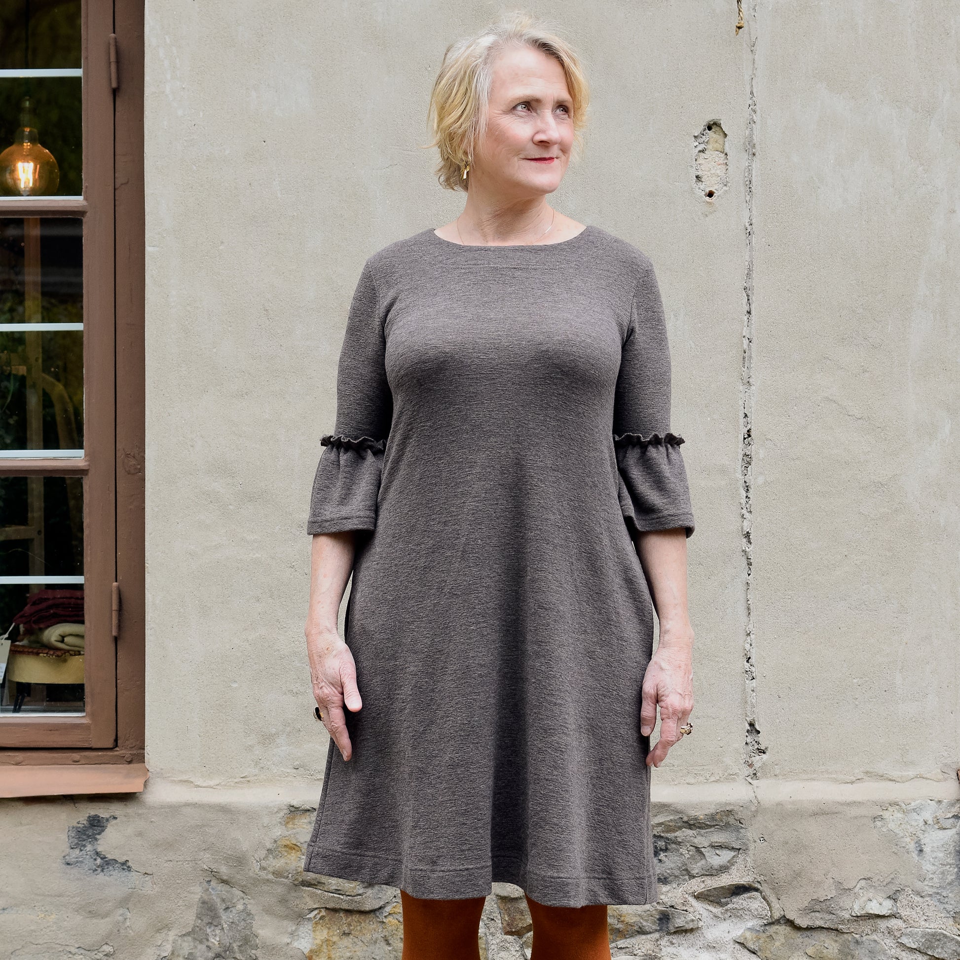 by basics klänning i merinoull med volangärm - Earth Melange