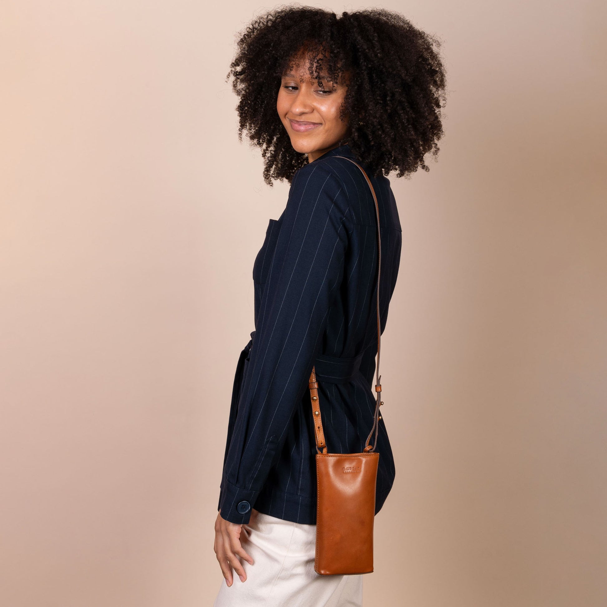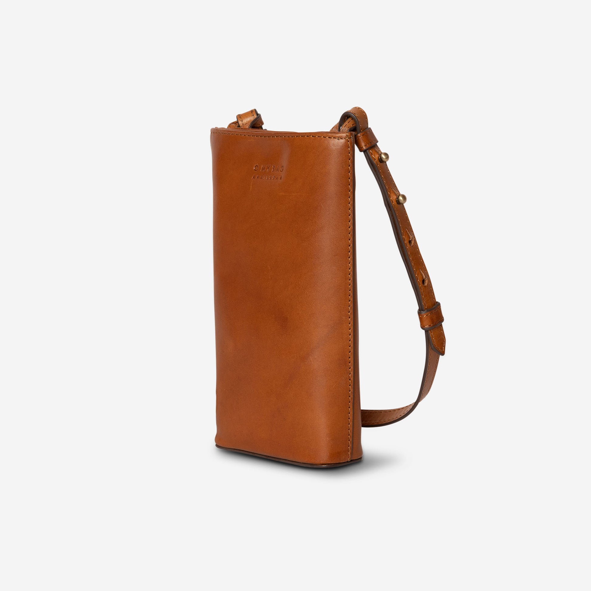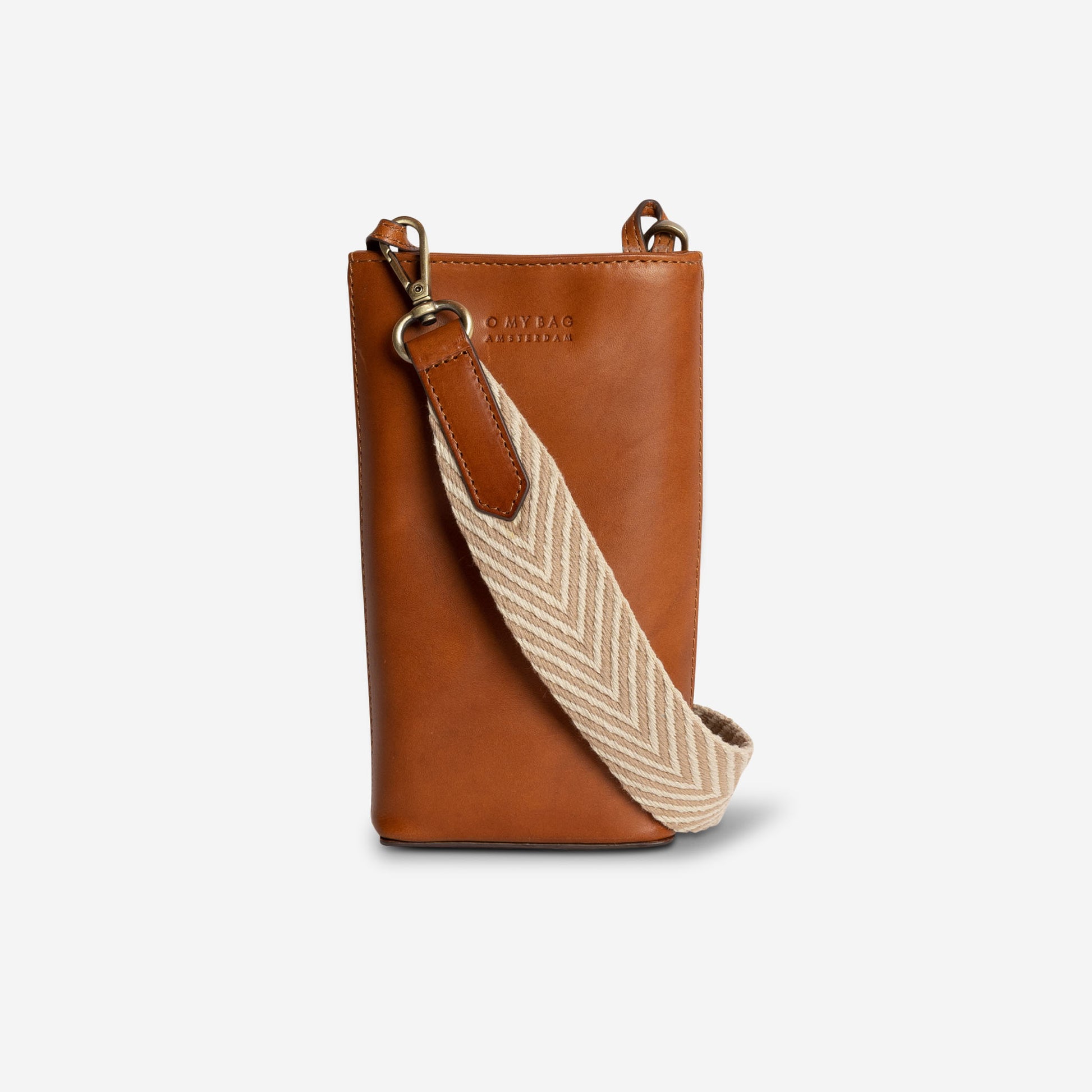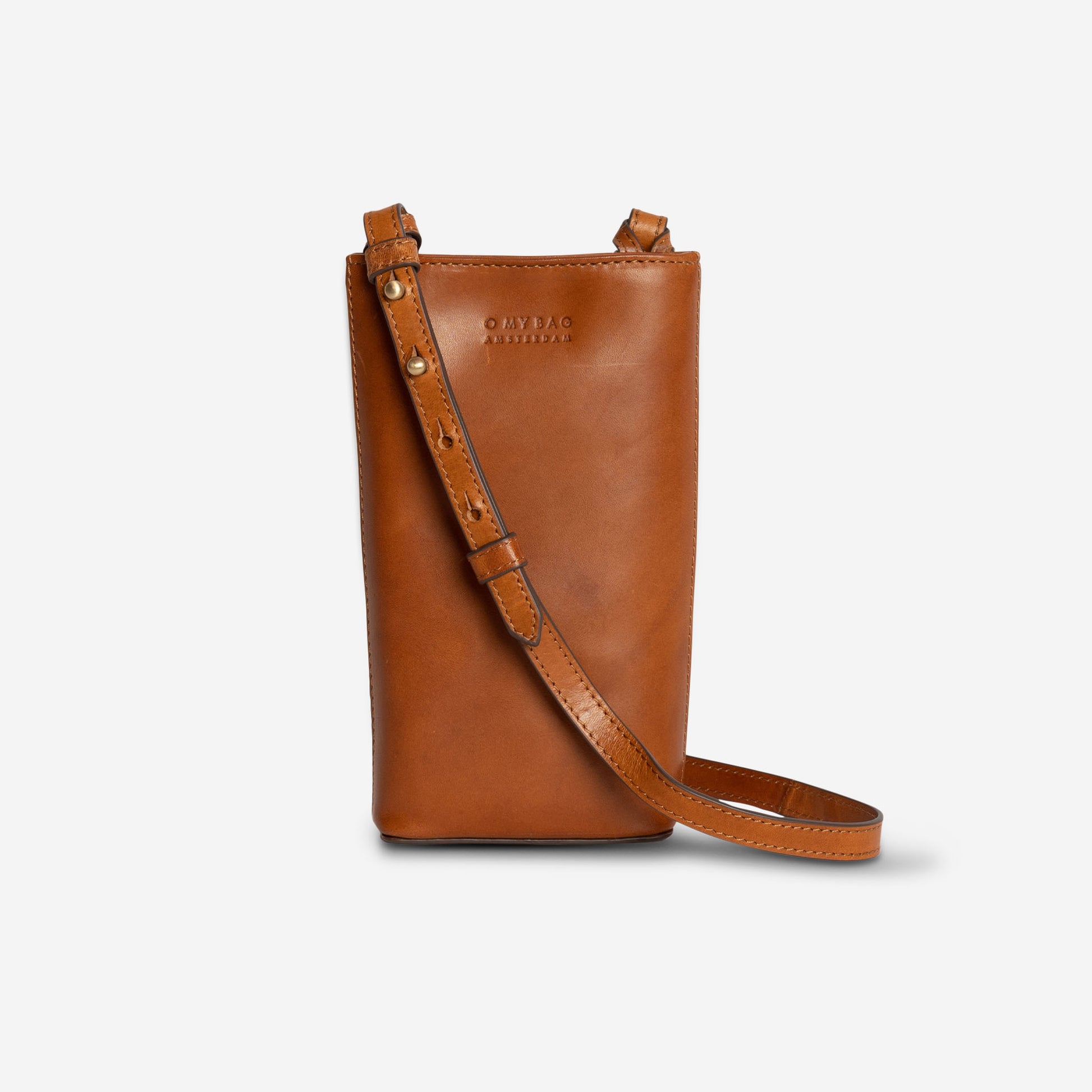 Kompakt mobilväska i minimalistisk design i vackert cognacsfärgat äkta läder. Från O My Bag, Amsterdam.