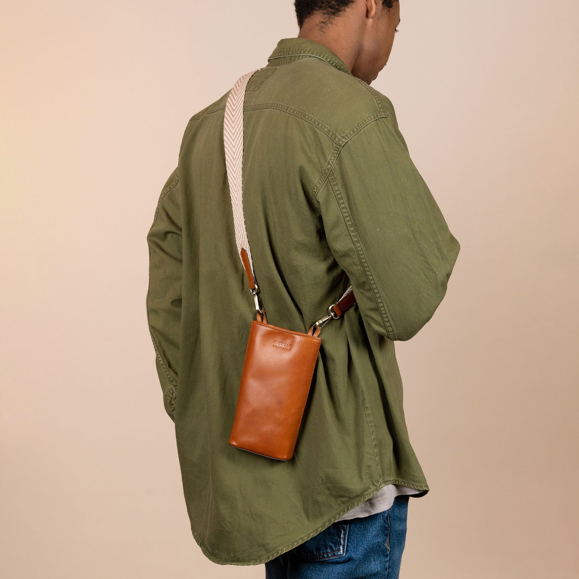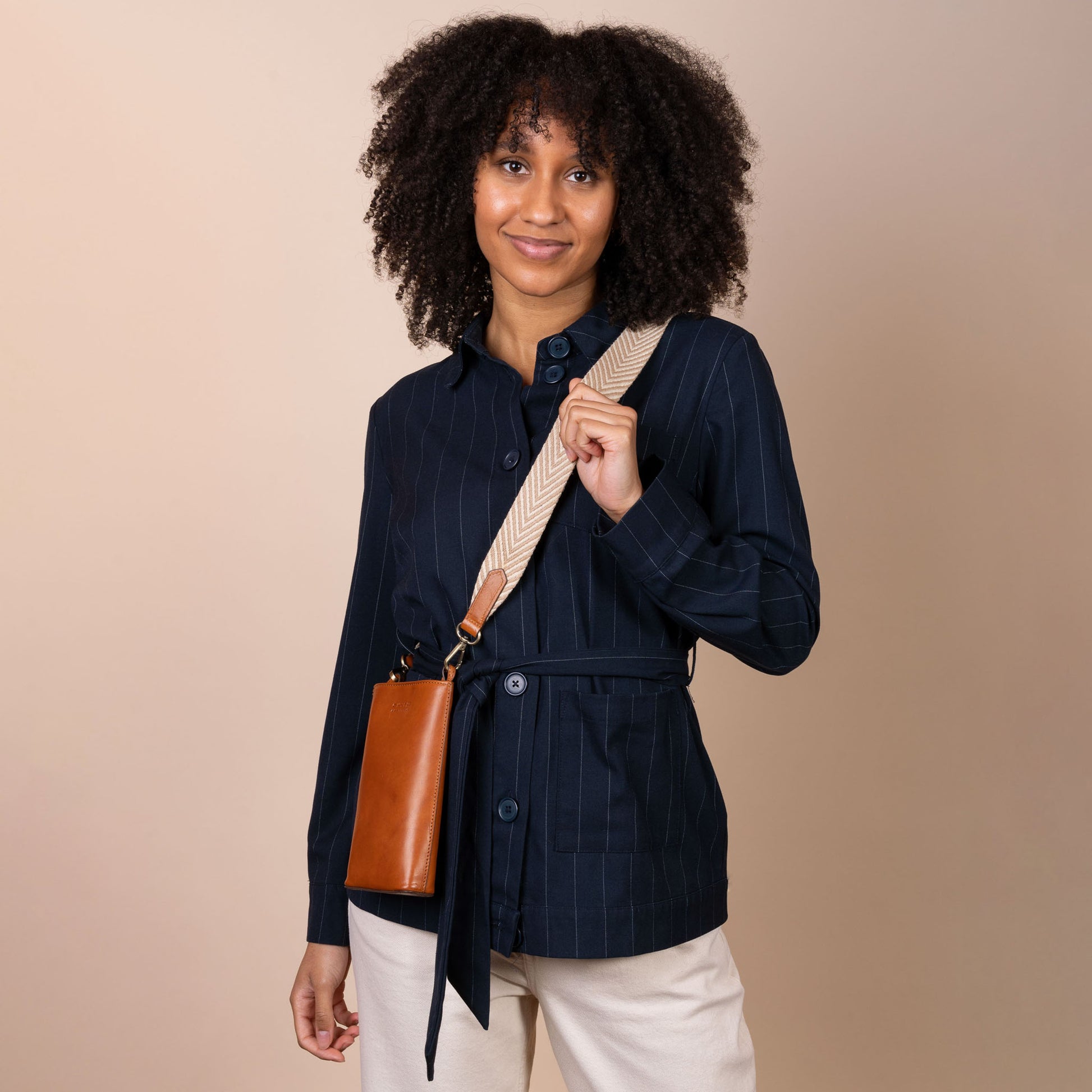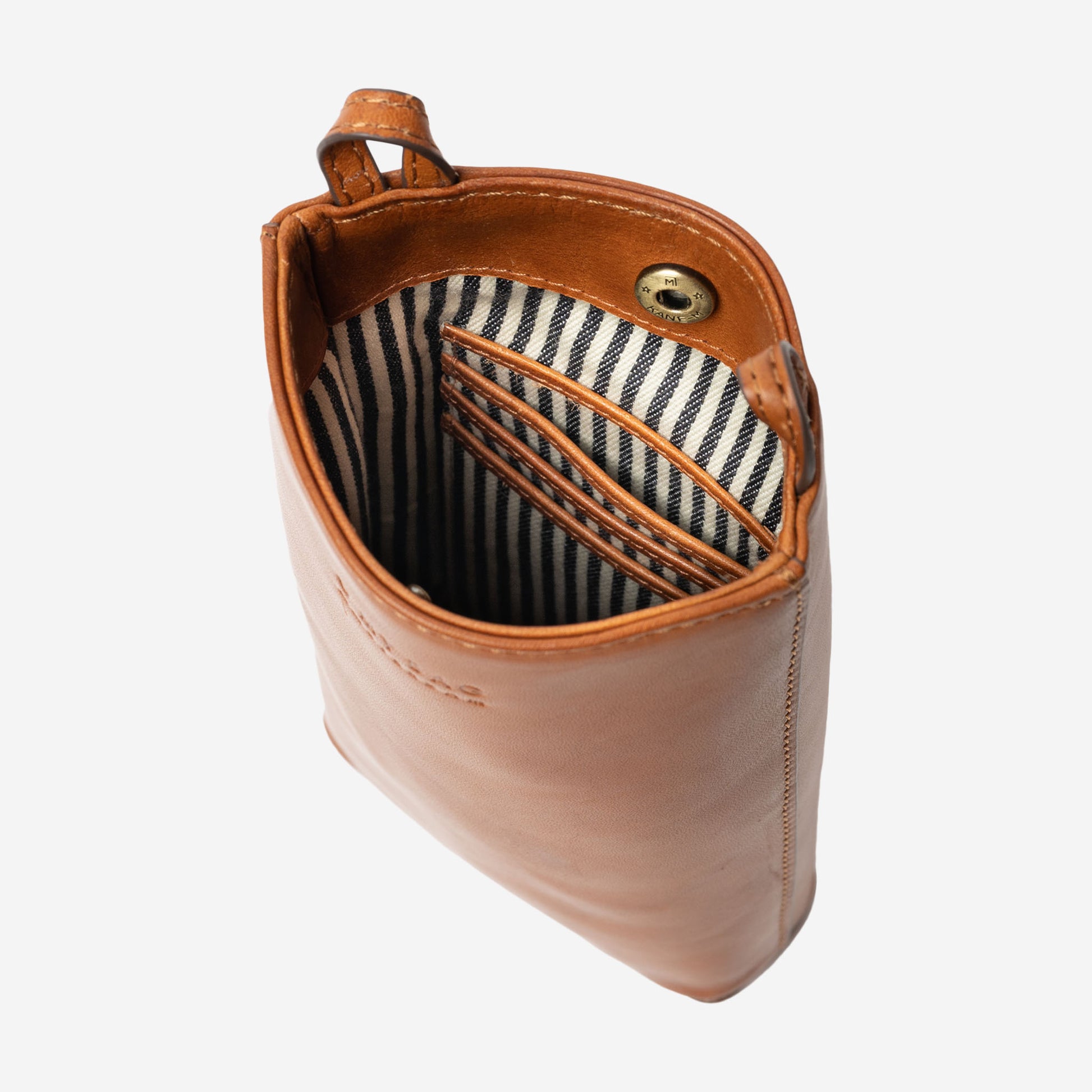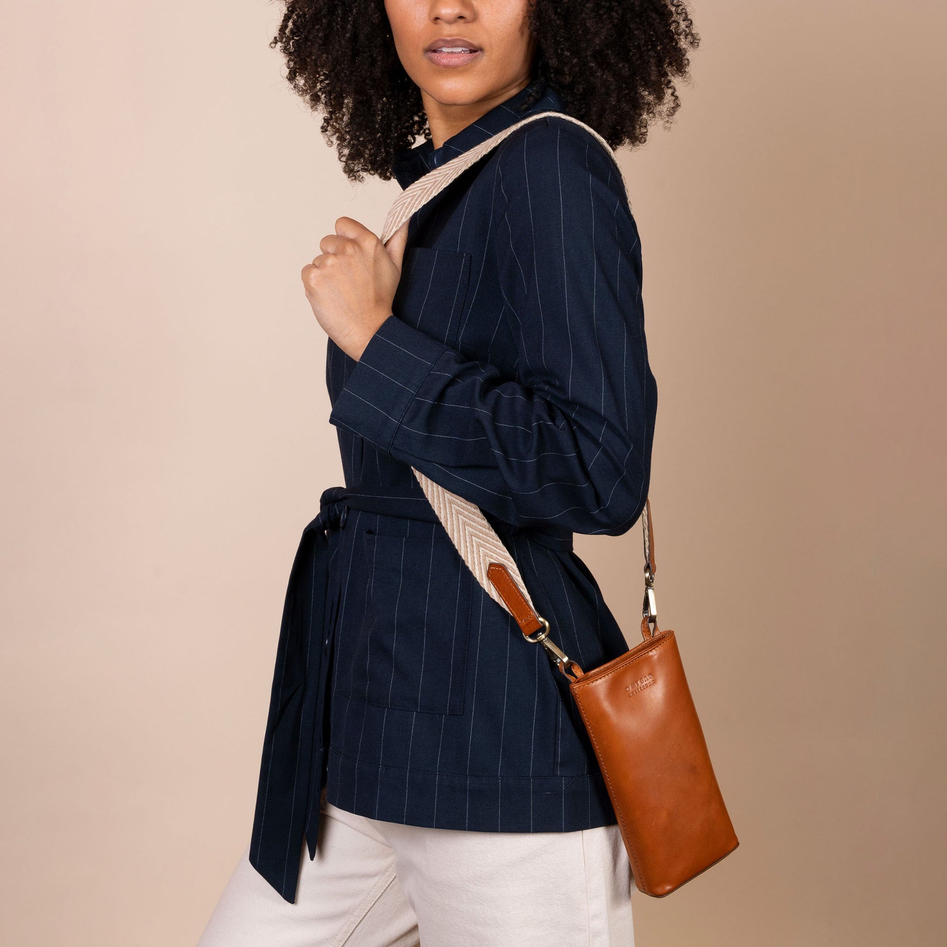 Kompakt mobilväska i minimalistisk design i vackert cognacsfärgat äkta läder. Från O My Bag, Amsterdam.