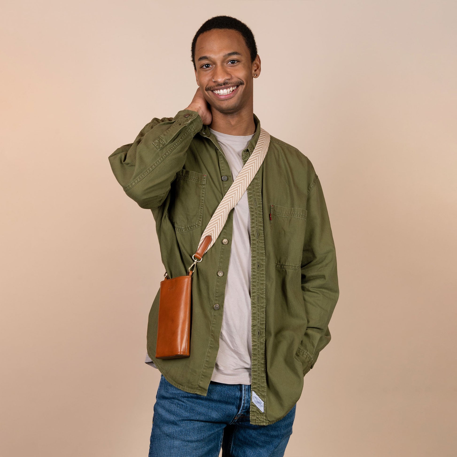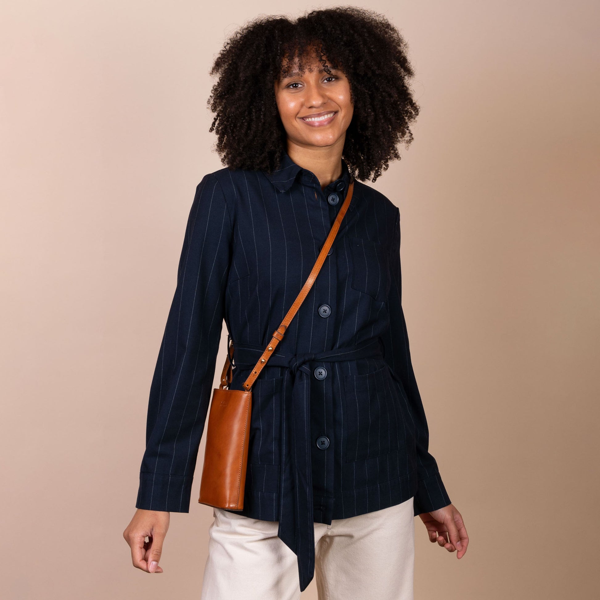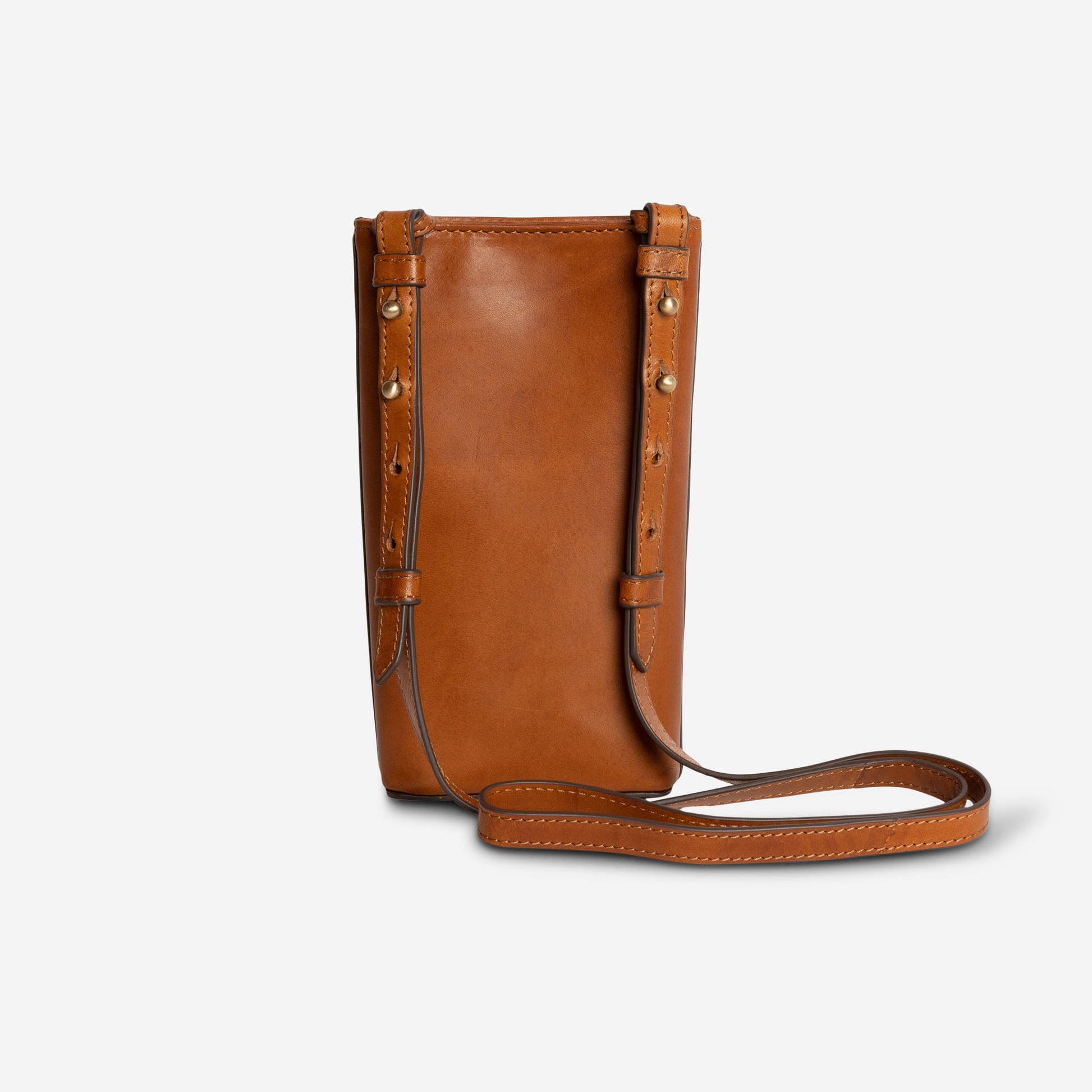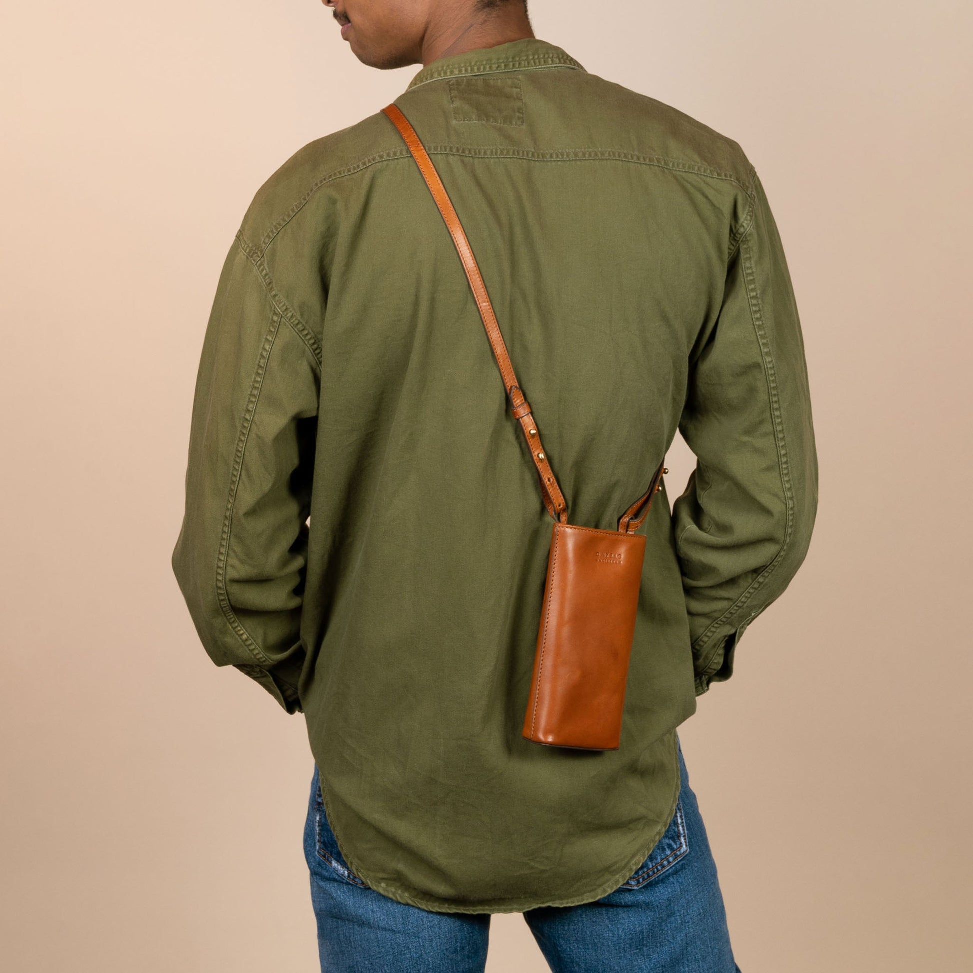 Kompakt mobilväska i minimalistisk design i vackert cognacsfärgat äkta läder. Från O My Bag, Amsterdam.