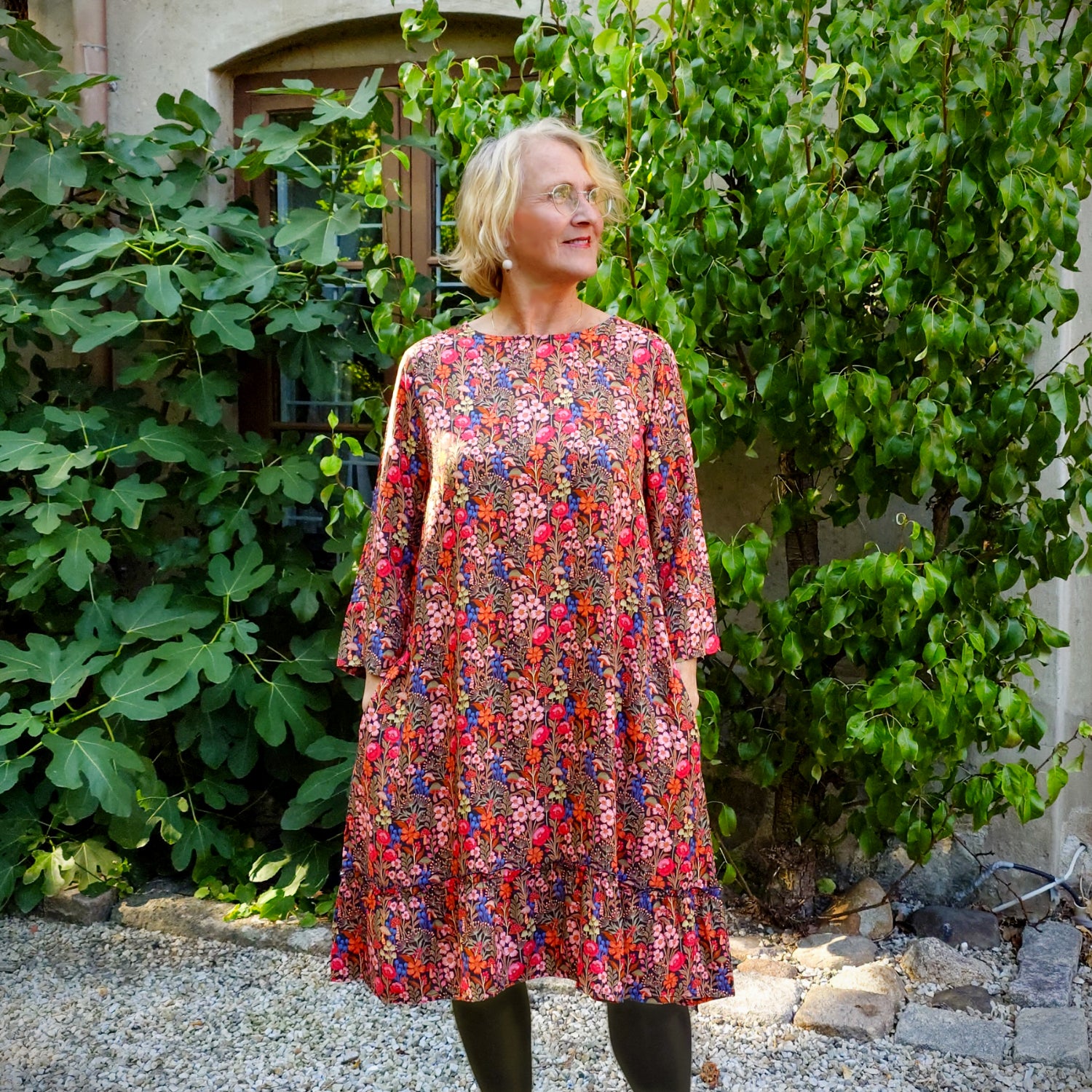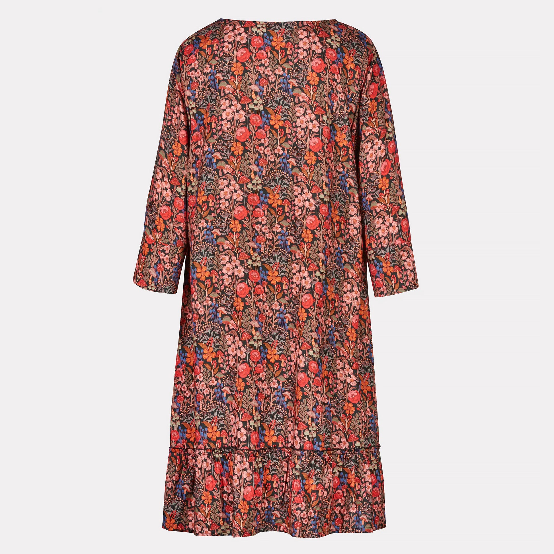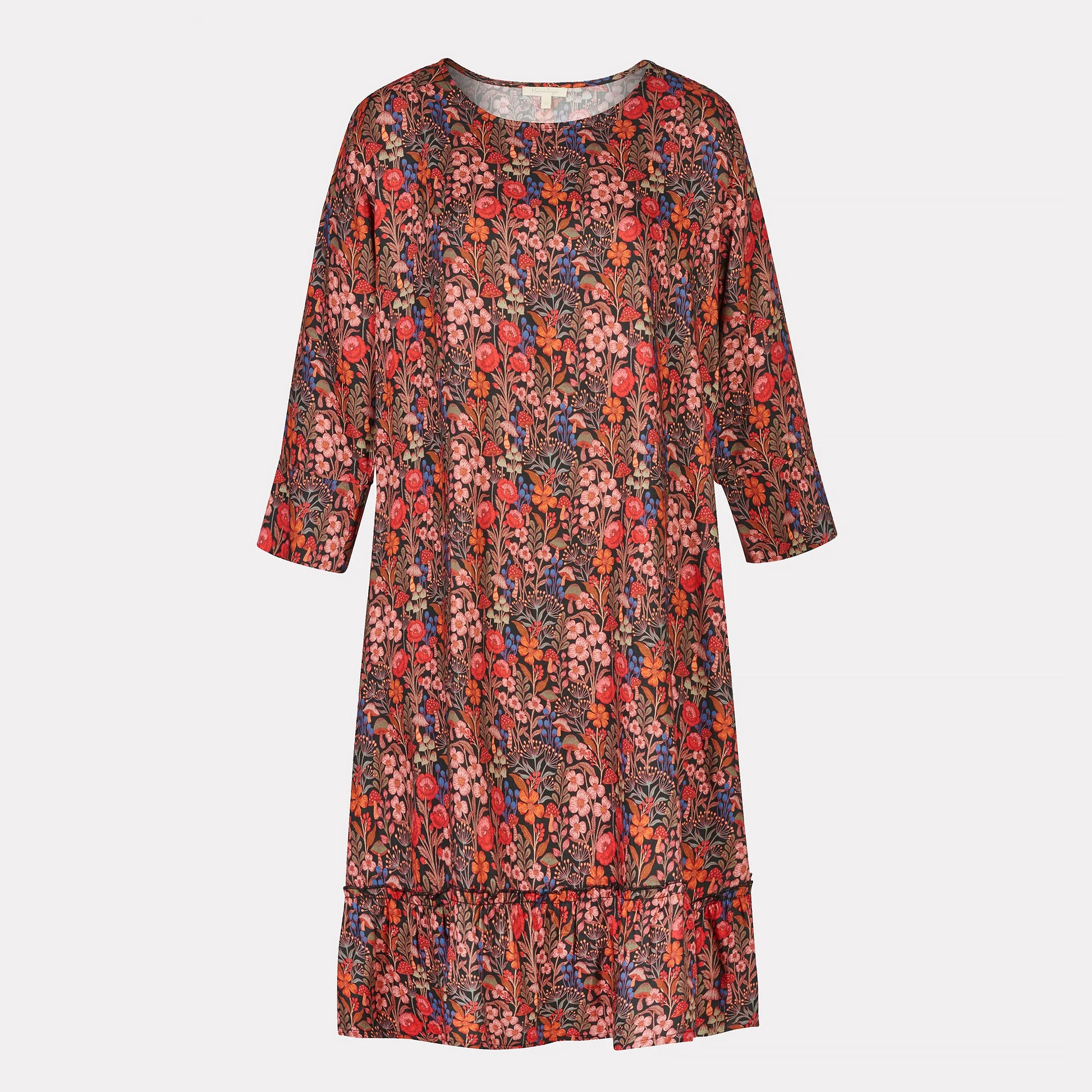 Klänning i mönstrad Ecovero-viskos, en mjuk och följsam kvalitet, från Himalaya Clothing. Vackert blommönster i höstfärger på svart botten.