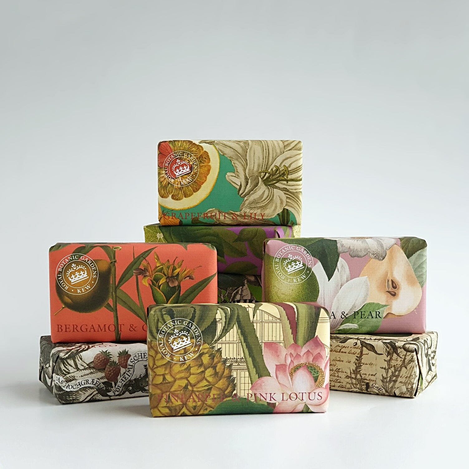 KEW Gardens underbara väldoftande tvålar är inspirerade av växterna och dofterna i Royal Botanic Gardens, KEW. Tvålen är vackert inslagna i papper med historiska blommotiv från Kew Gardens arkiv och blir en extra fin present eller julklapp.