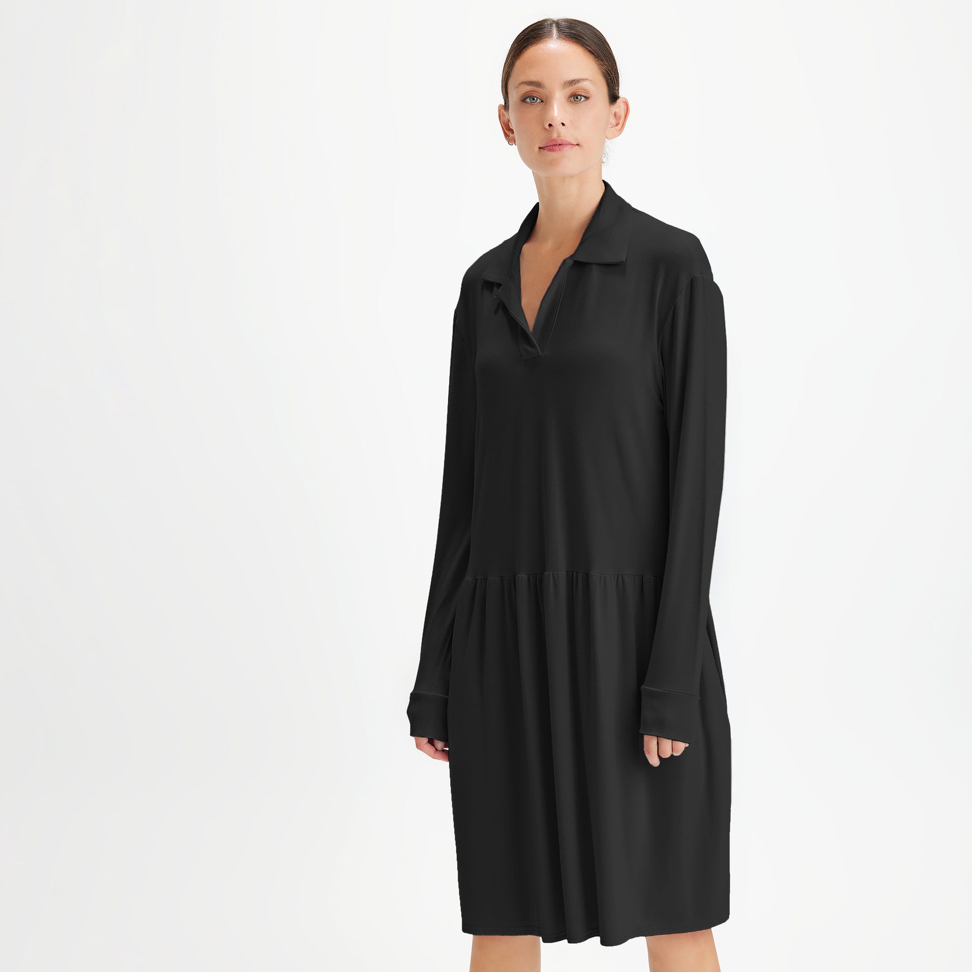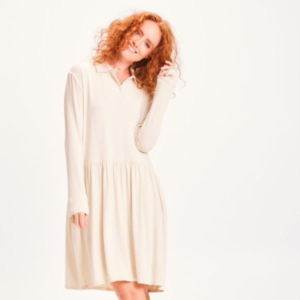 Långärmad klänning med krage i otroligt mjuk och följsam bambulyocell, 100% oeko-tex certifierad, från bamboo by basics. Den mjuka bambun har en skön tyngd som gör att plagget får ett mycket fint fall.