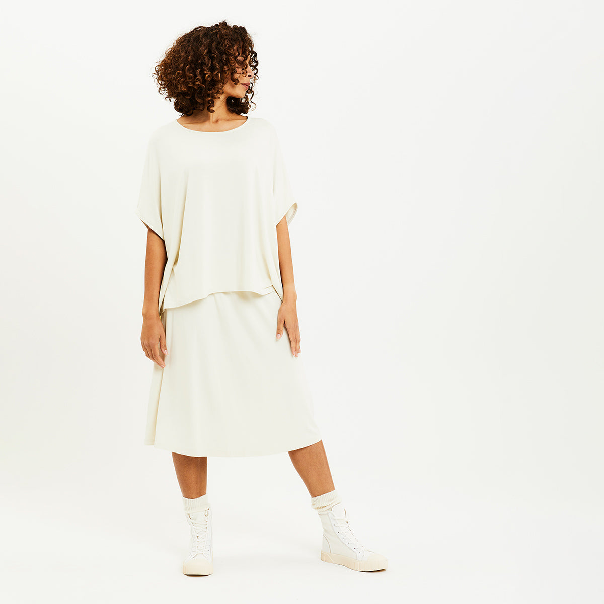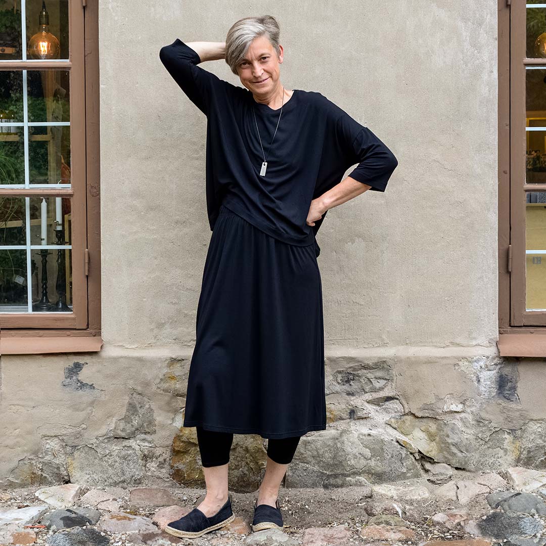 Kjol i otroligt mjuk och följsam bambulyocell. Resår i midjan. Den mjuka bambulyocellen har en skön tyngd som gör att plagget får ett mycket fint fall.