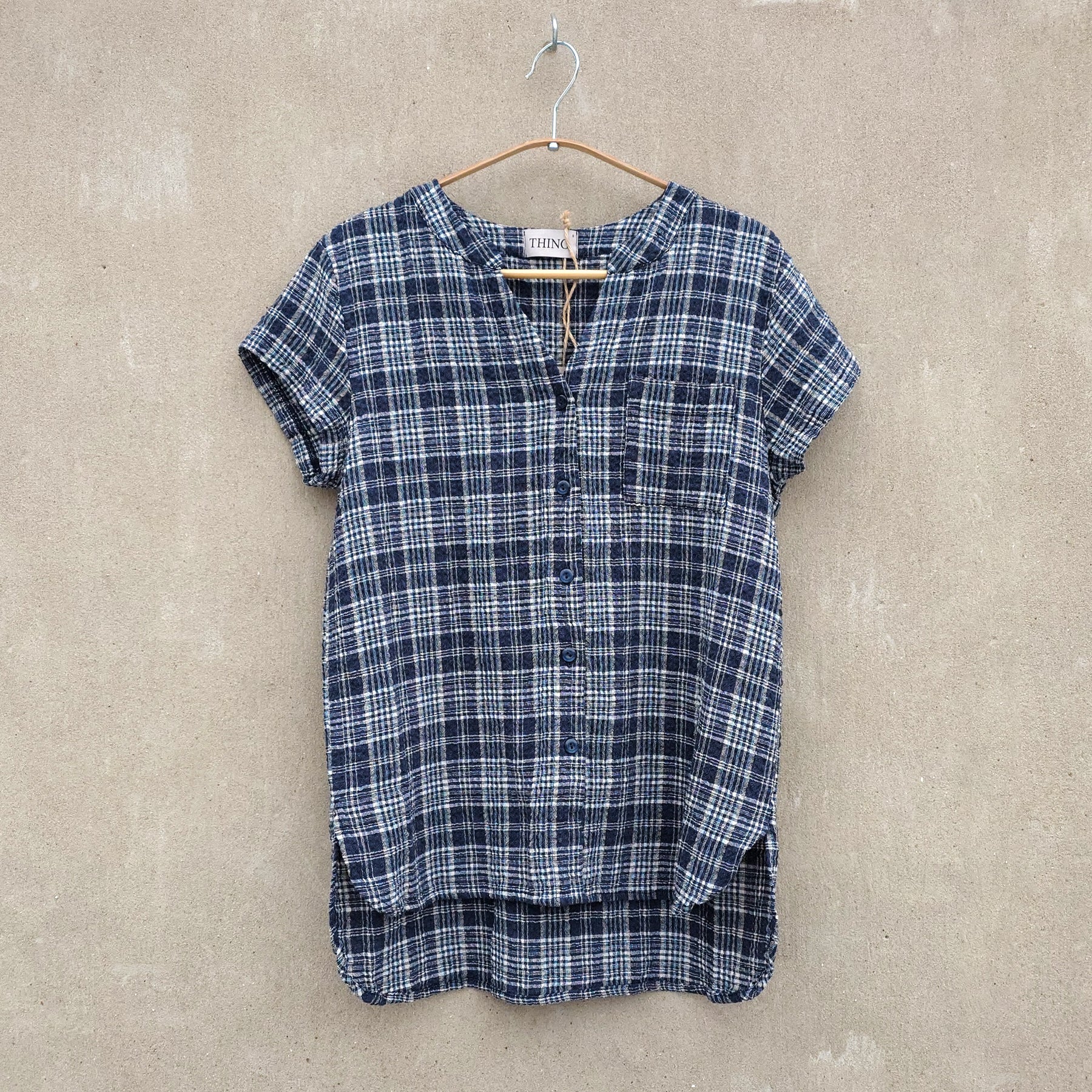 Kortärmad rutig skjorta i bomull/viskos/lin - Navy