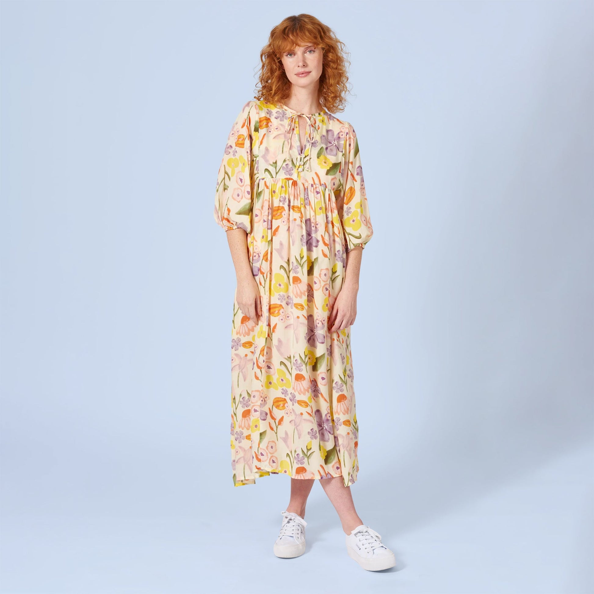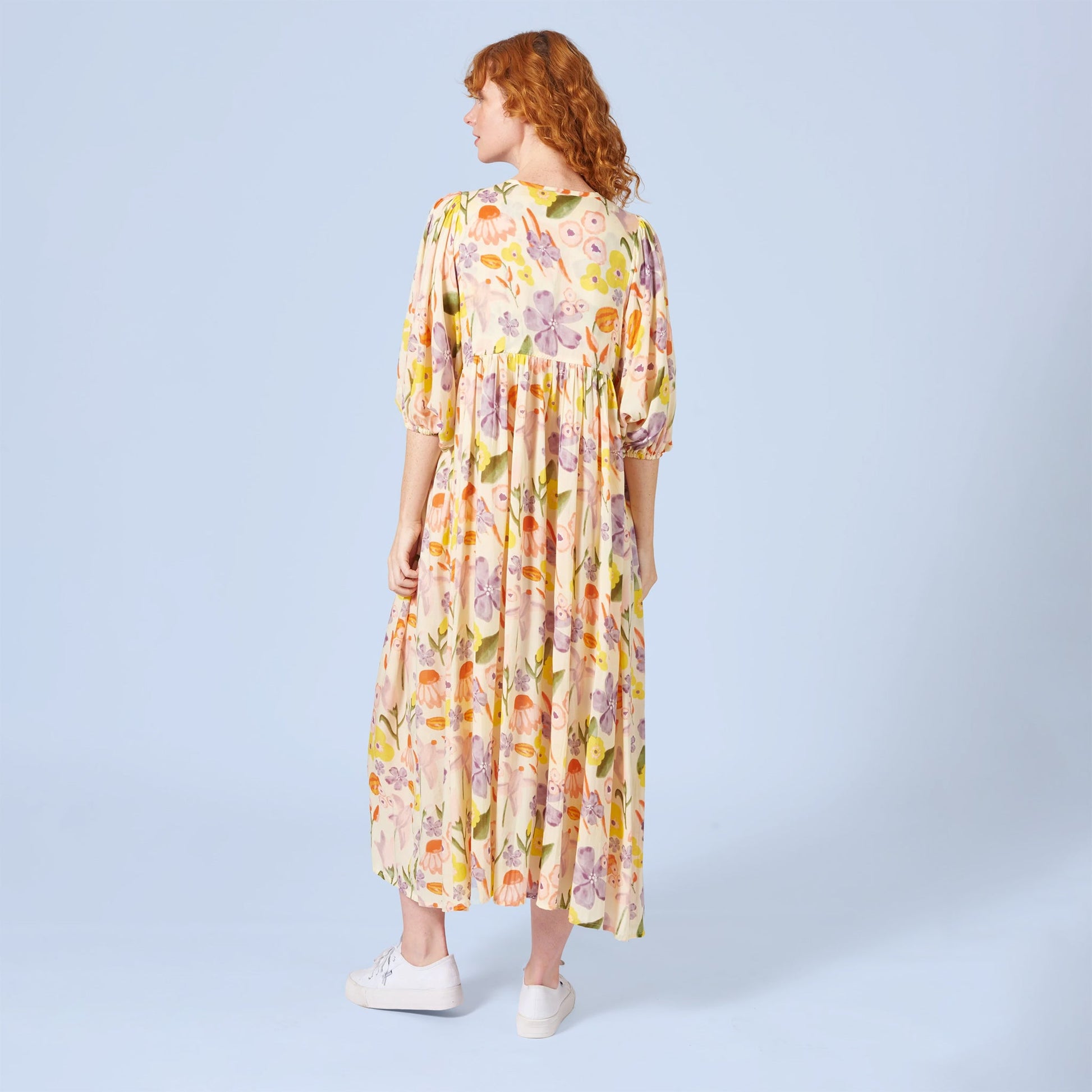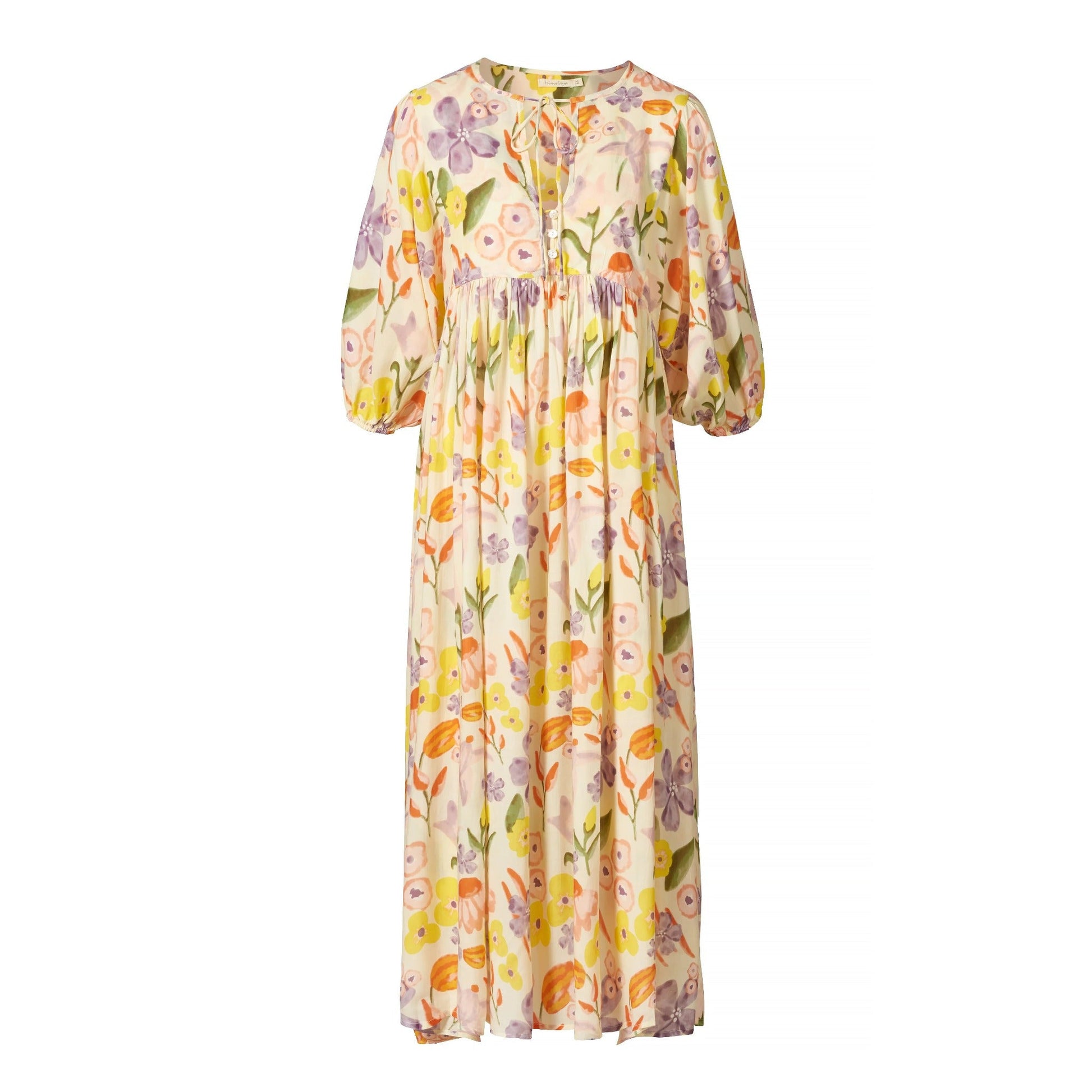 Lång sommarklänning med blommönster i milda ljusa toner i sval Ecovero™ viskos. En perfekt midsommarklänning!