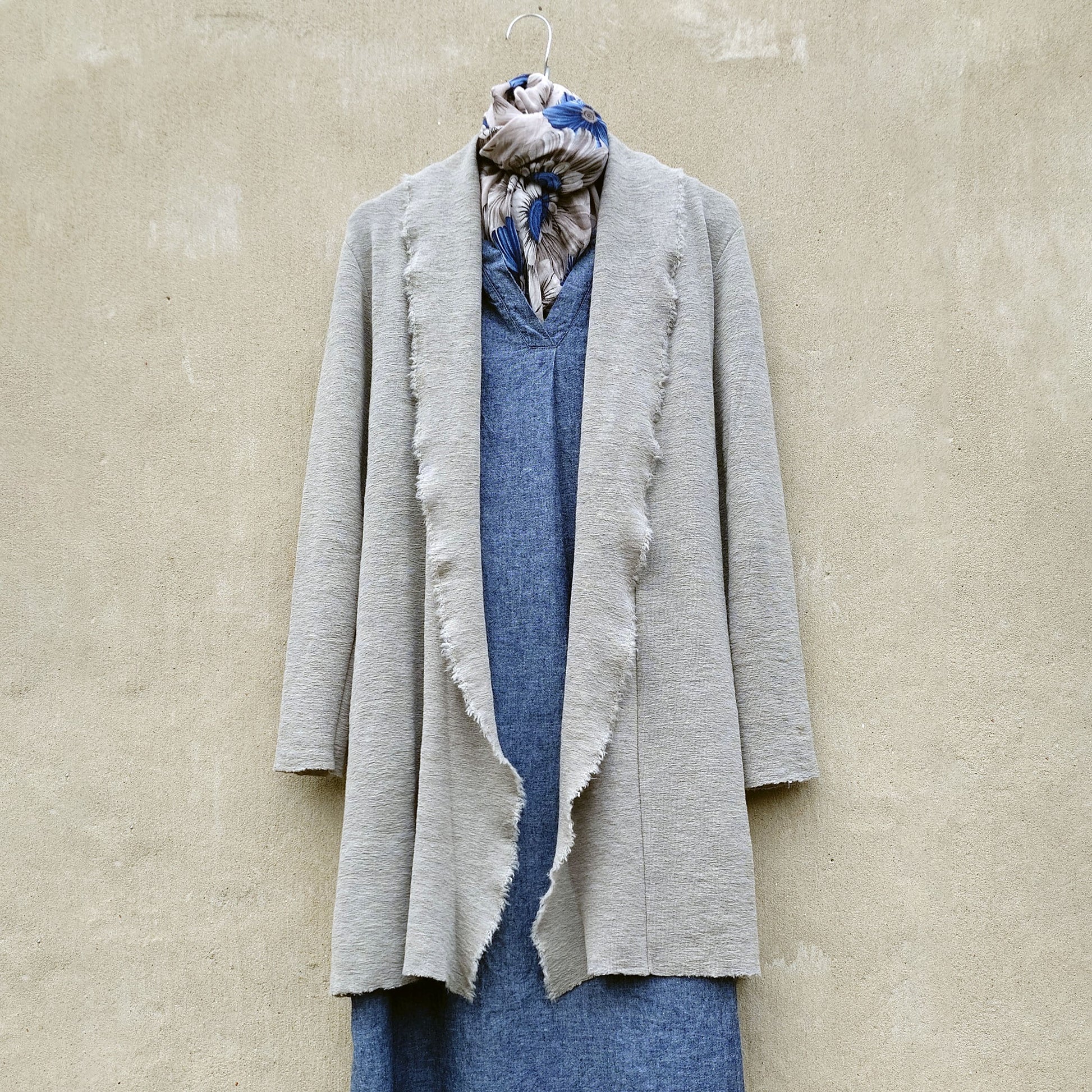 Koftan har sjalkrage med fransad kant och "råa" kanter på ärmar och längs nederkanten. De råa kanterna är behandlade på ett sätt som gör att de inte repar upp sig.
