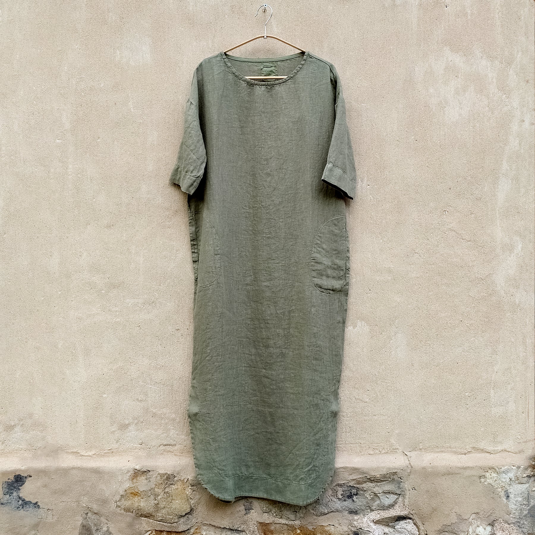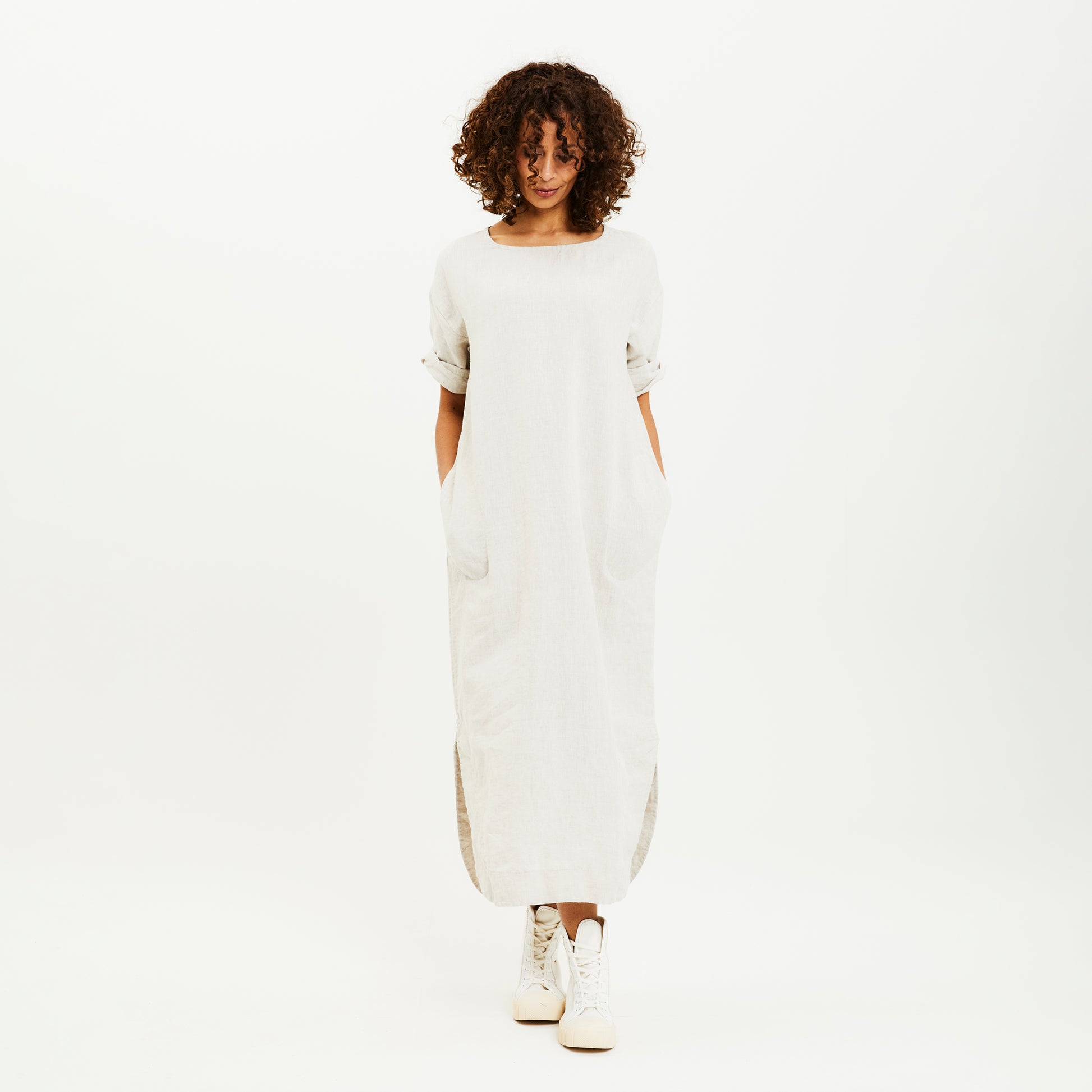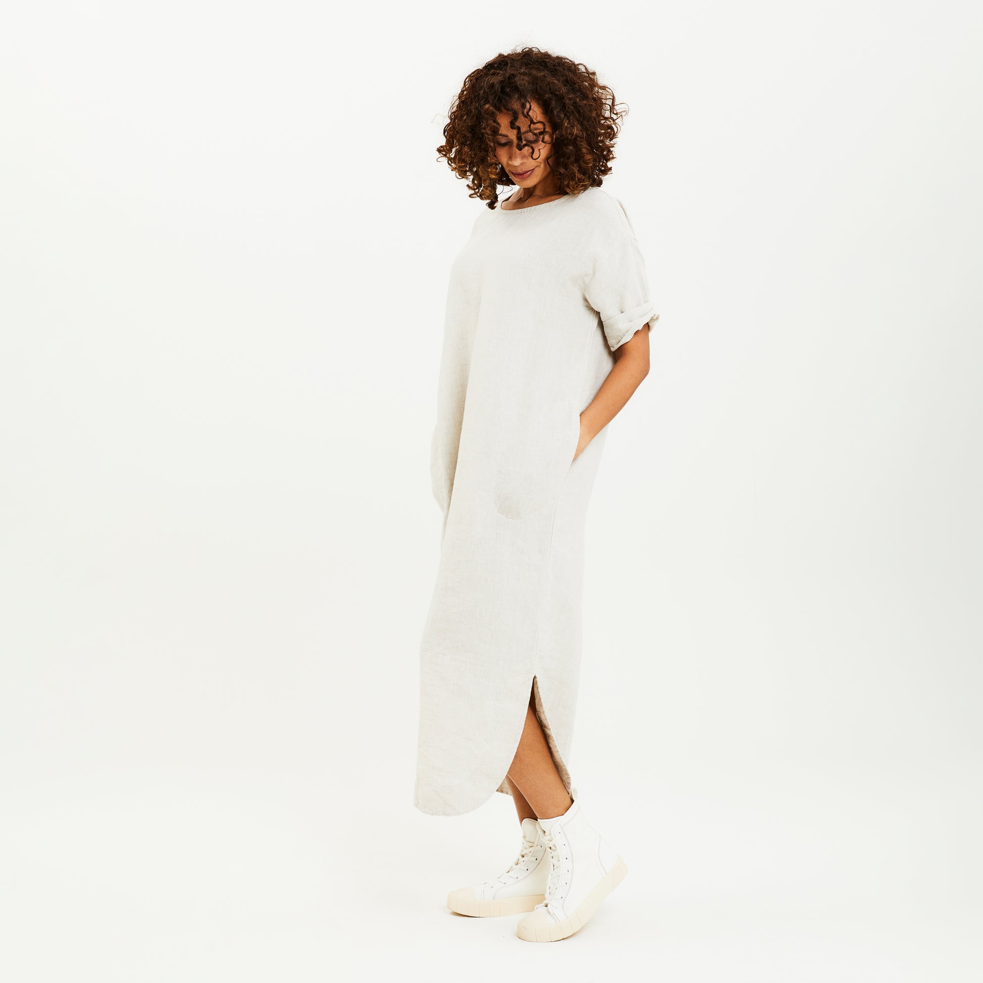 Lång rak linneklänning i mjuktvättat linne från OWN by basics. Med höga rundade sprund i sidorna. En enkel och minimalistisk sommarklänning.
