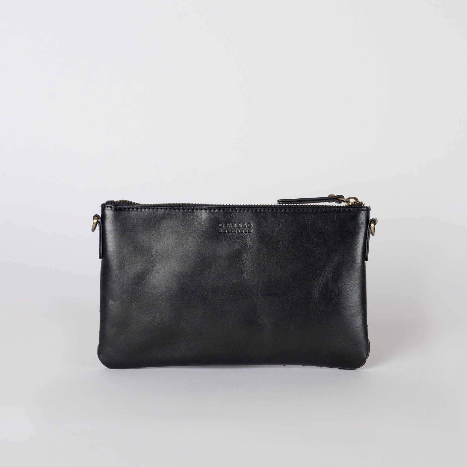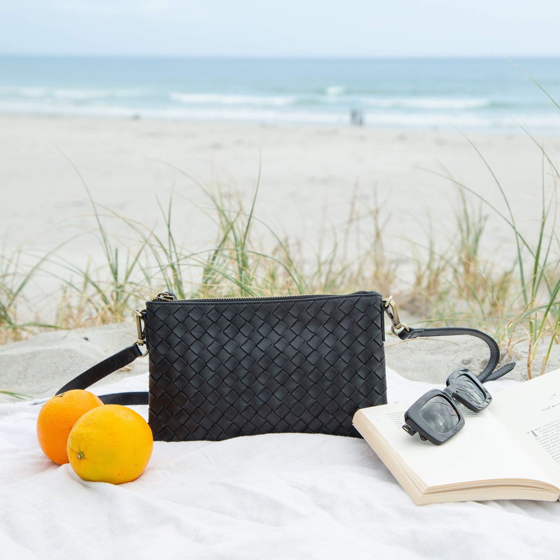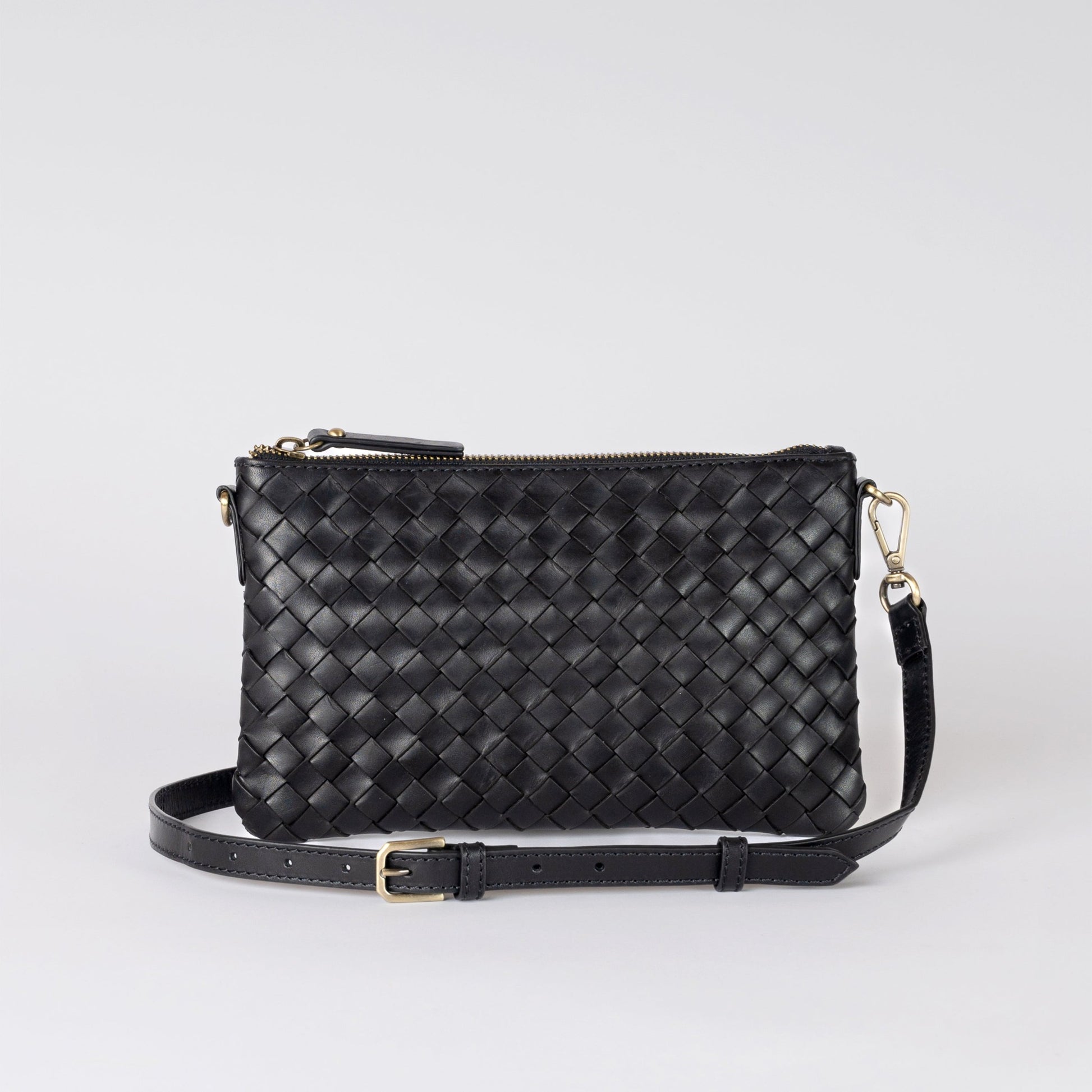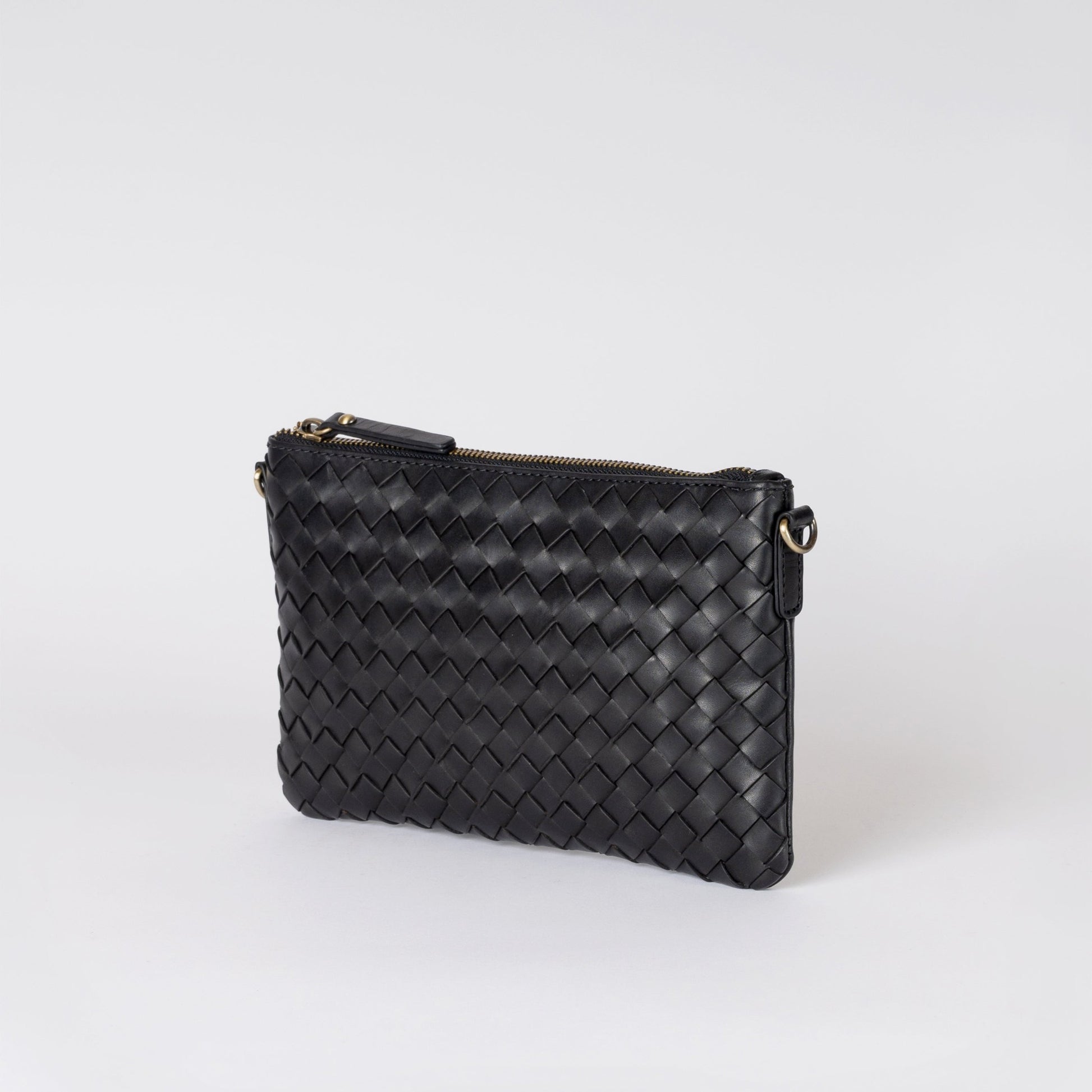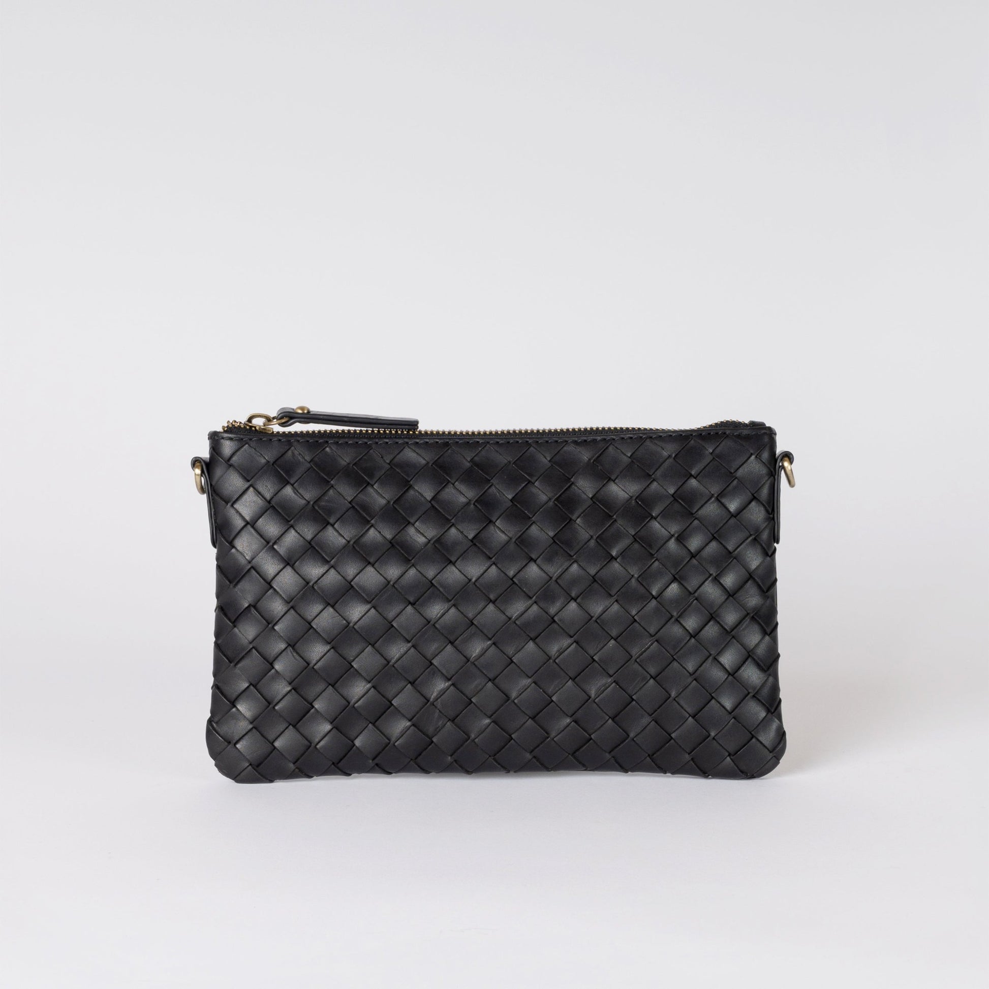 Liten handväska i minimalistisk design i äkta läder. Från O My Bag, Amsterdam. Den ena sidan av väskan är vävd, medan den andra är slät - kan bäras på båda hållen.