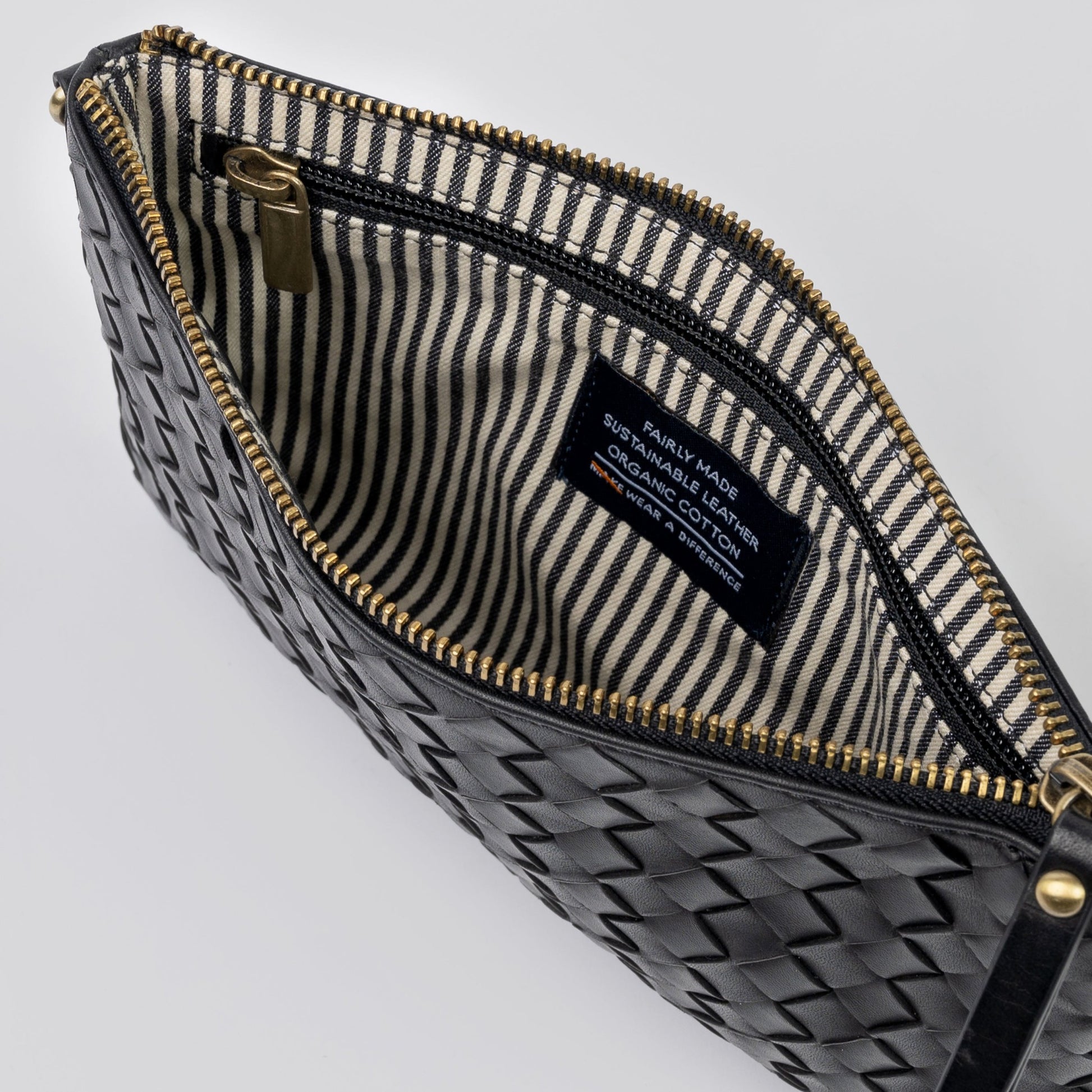 Det vävda lädret tillverkas av en grupp kvinnor i Bilbar, en liten by i utkanten av Kolkata i Indien. Ett 40-tal kvinnor arbetar hemifrån och har på så sätt möjlighet att tjäna en rättvis lön samtidigt som de tar hand om hem och familj.