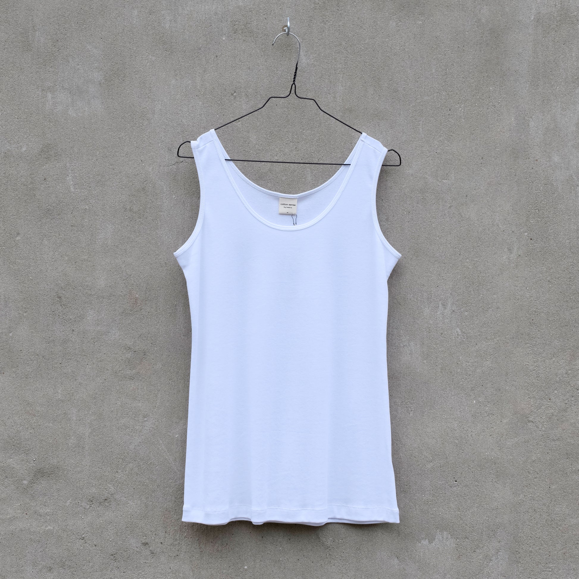 Rundhalsat bomullslinne med breda axelband i 100% ekologisk bomullstrikå, från by basics. A-form med lite vidd över mage och höfter.