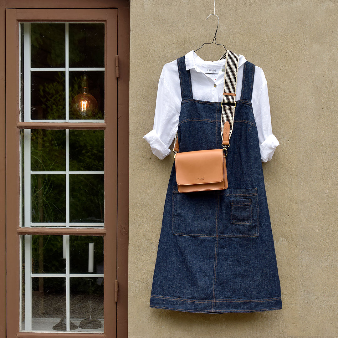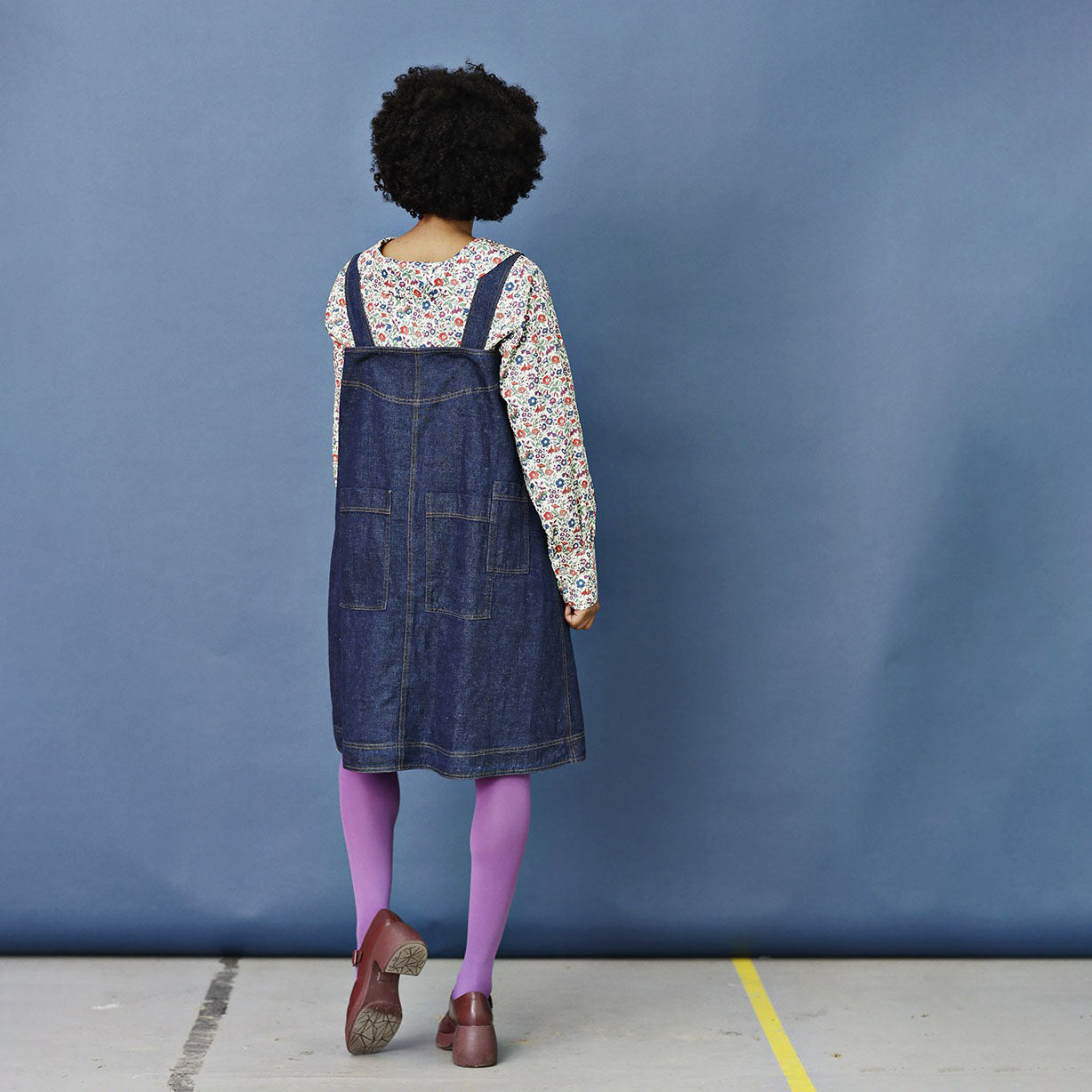 Hängselklänning i ekologisk bomull och hampa, från McVerdi. Klänningen är inspirerad av klassiska arbetskläder med flera påsydda fickor i olika storlek framtill och baktill.