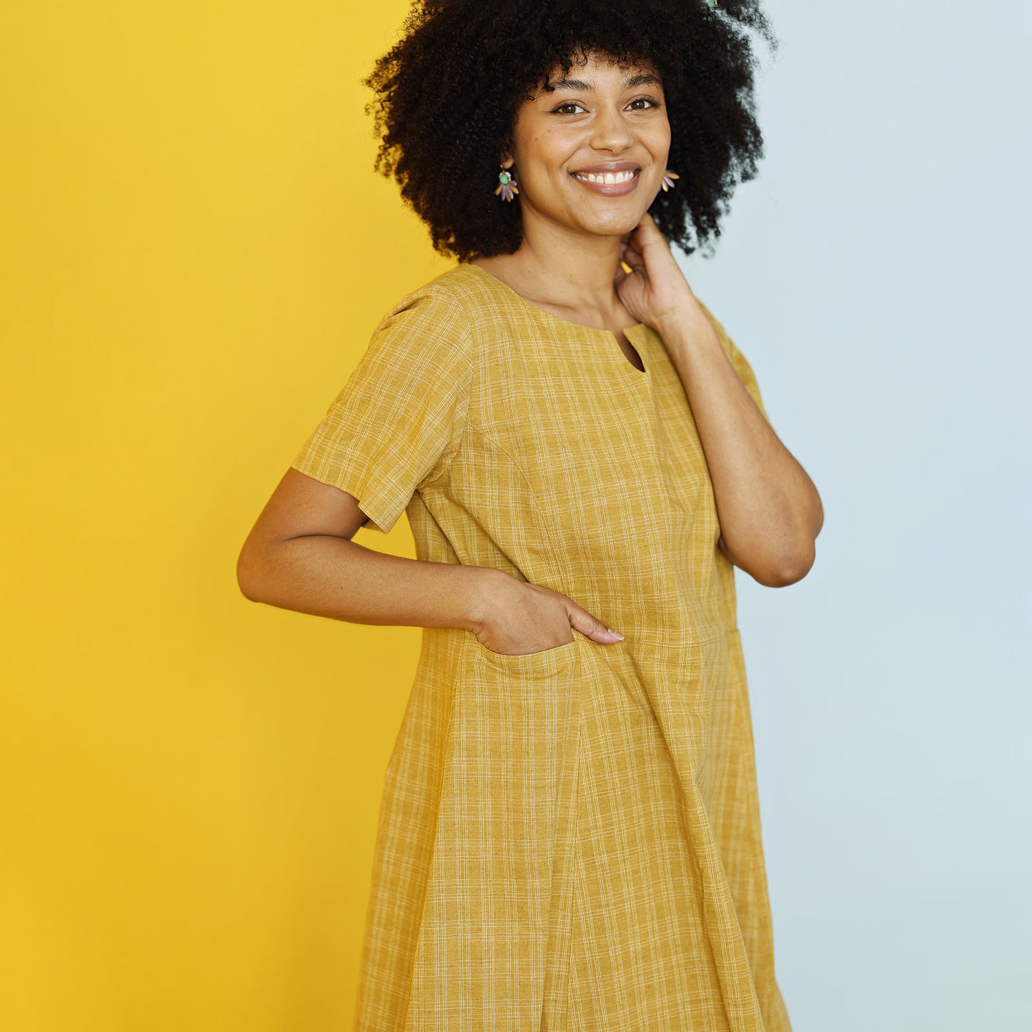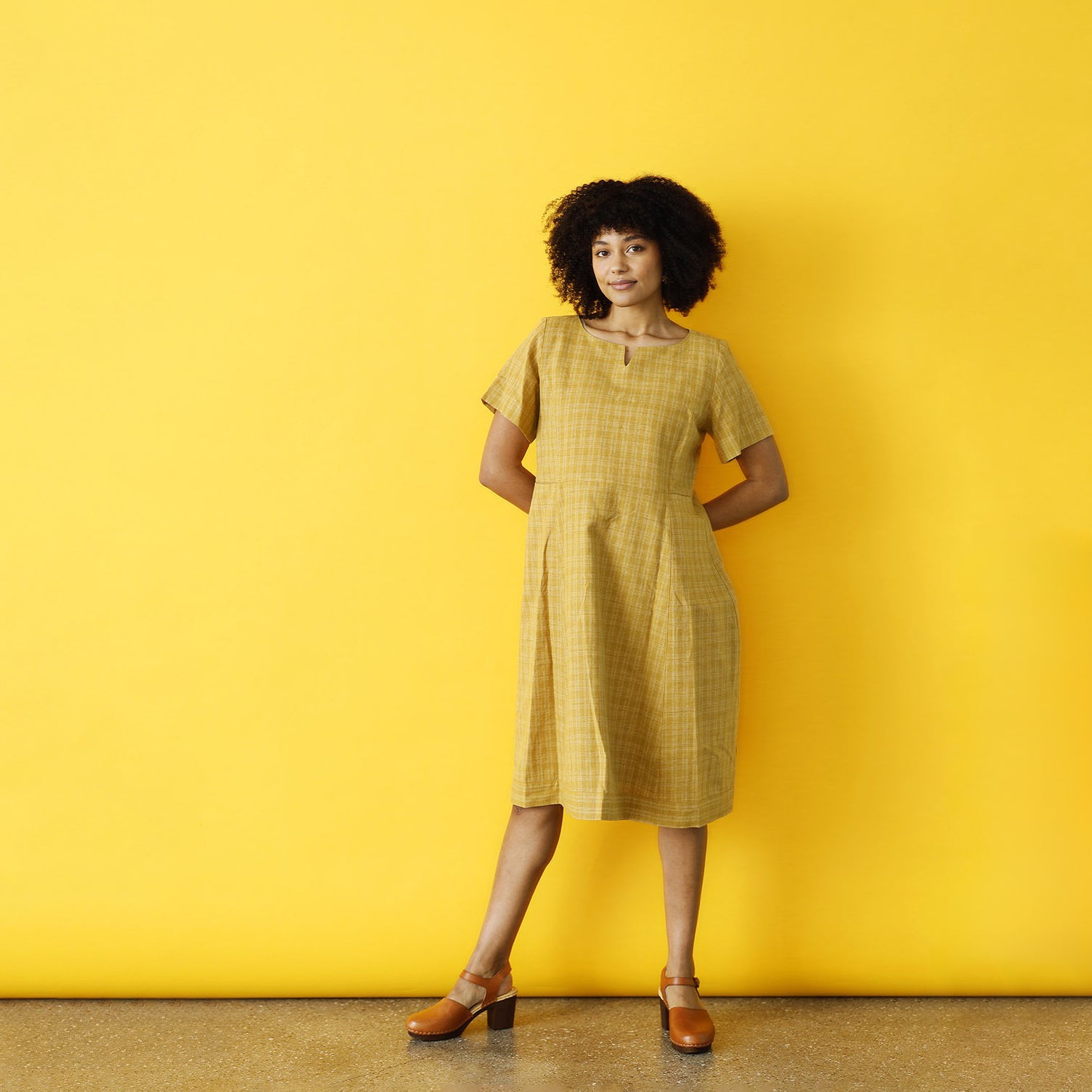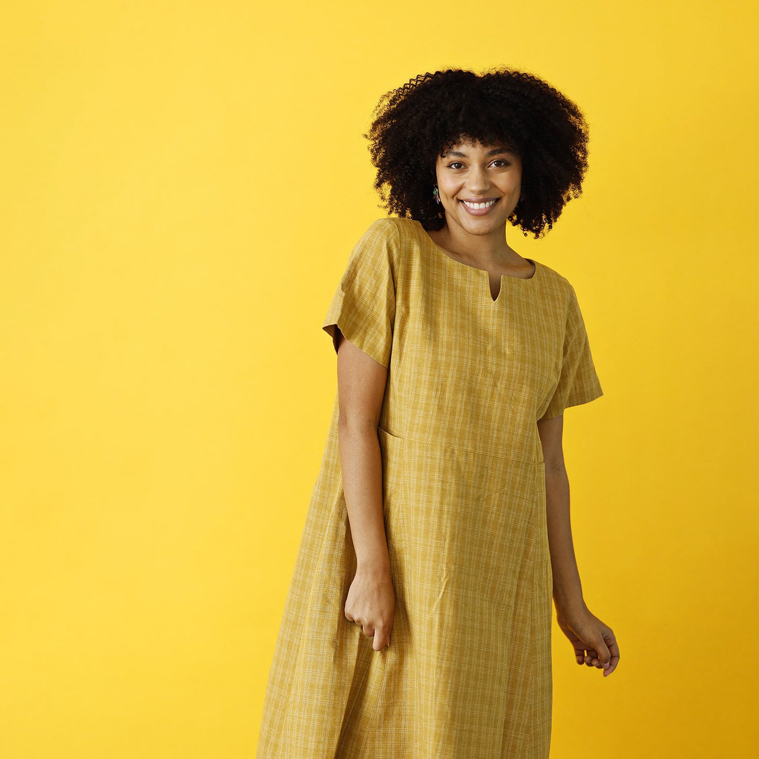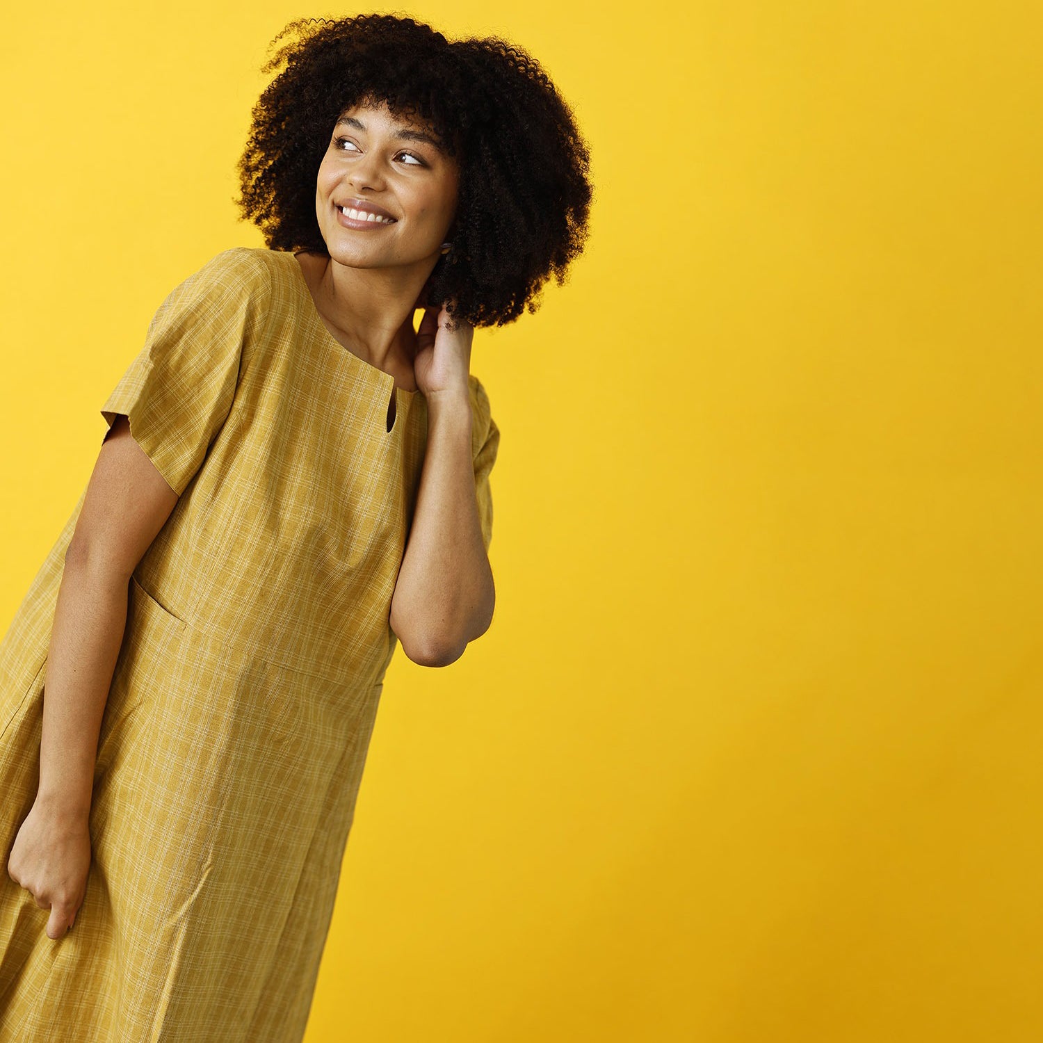 Currygul klänning från McVerdi i en fin lin- och bomullsblandning med ett diskret rutmönster. En enkel men mycket välsittande klänning med en smal silhuett, samtidigt både ledig och elegant i passformen.