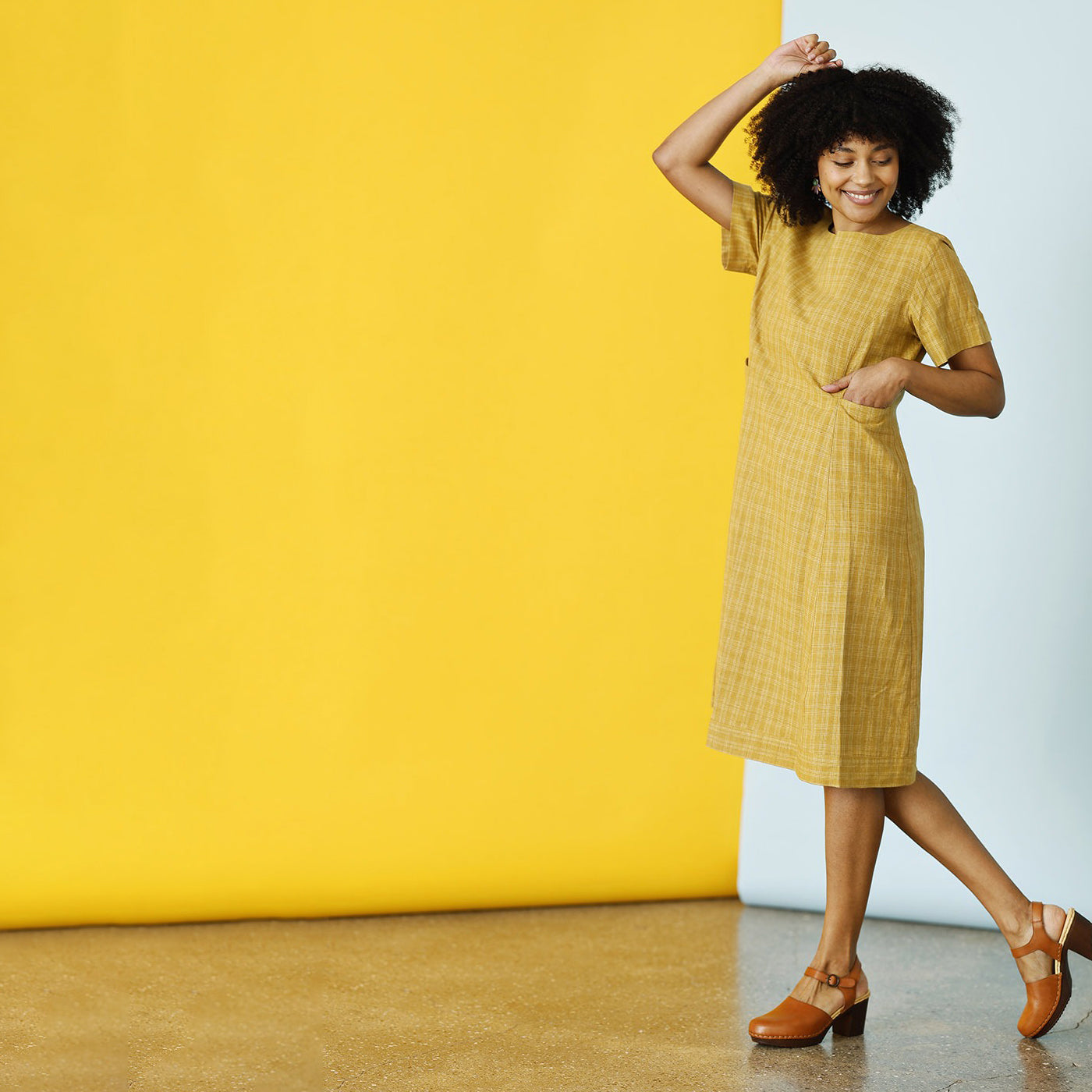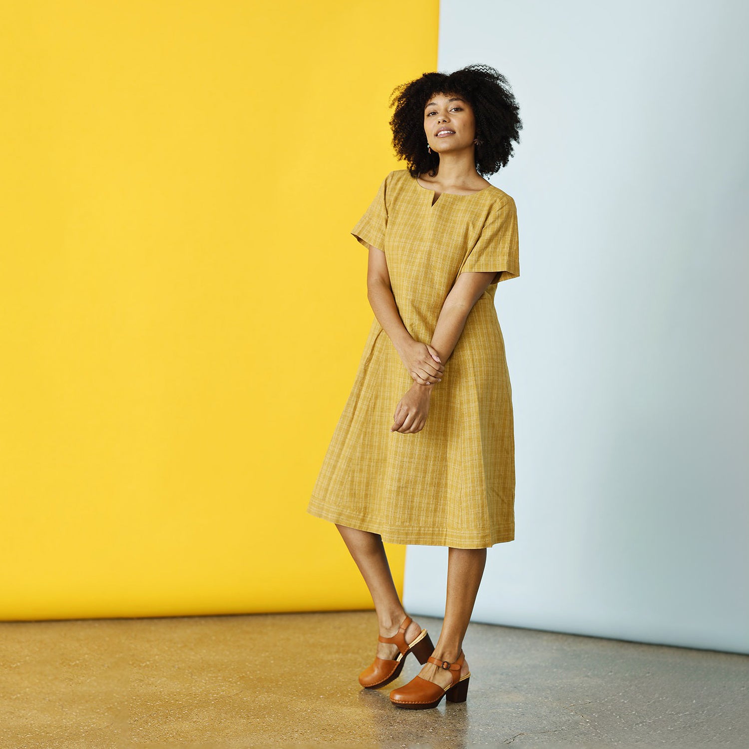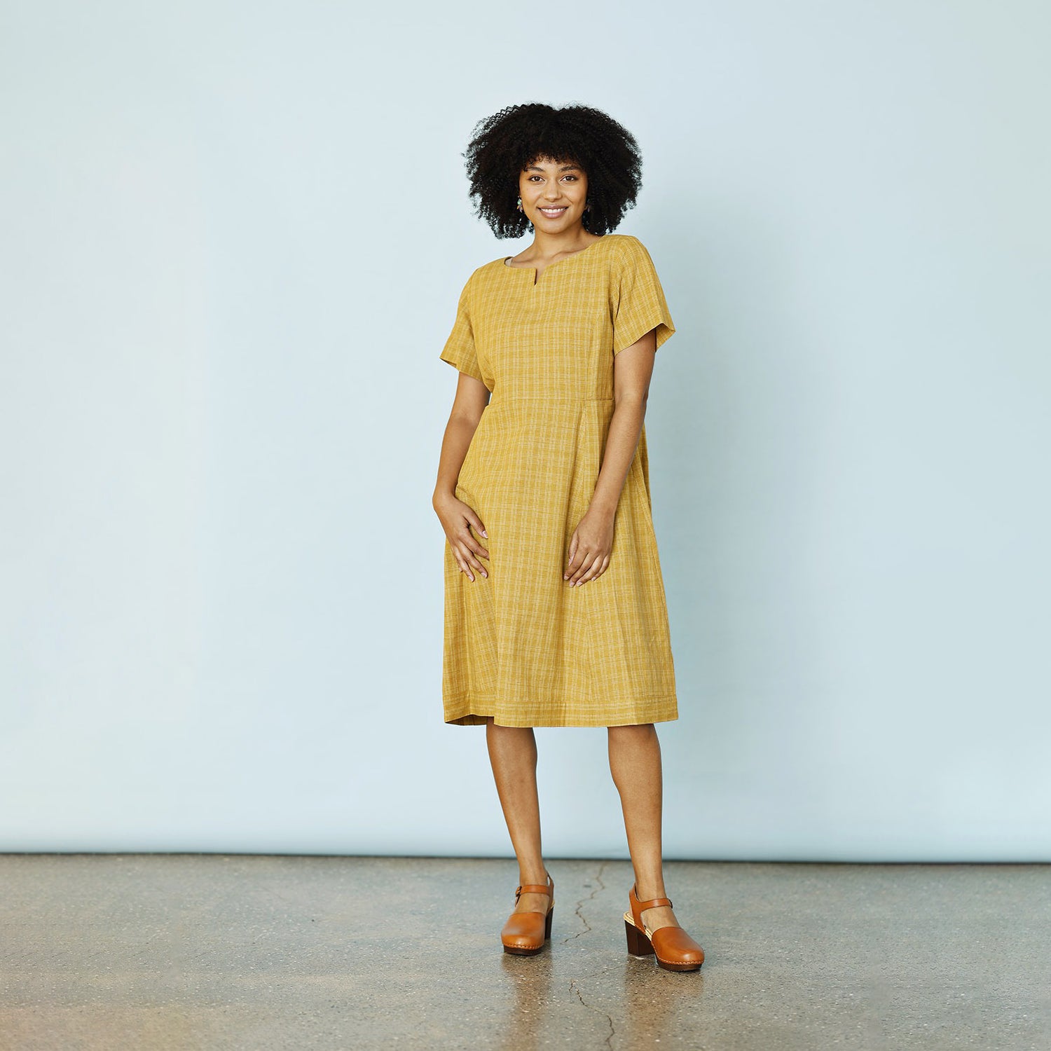 Currygul klänning från McVerdi i en fin lin- och bomullsblandning med ett diskret rutmönster. En enkel men mycket välsittande klänning med en smal silhuett, samtidigt både ledig och elegant i passformen.