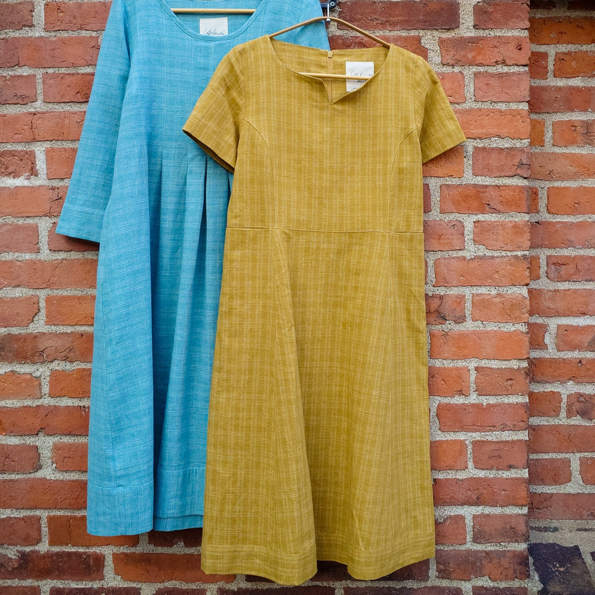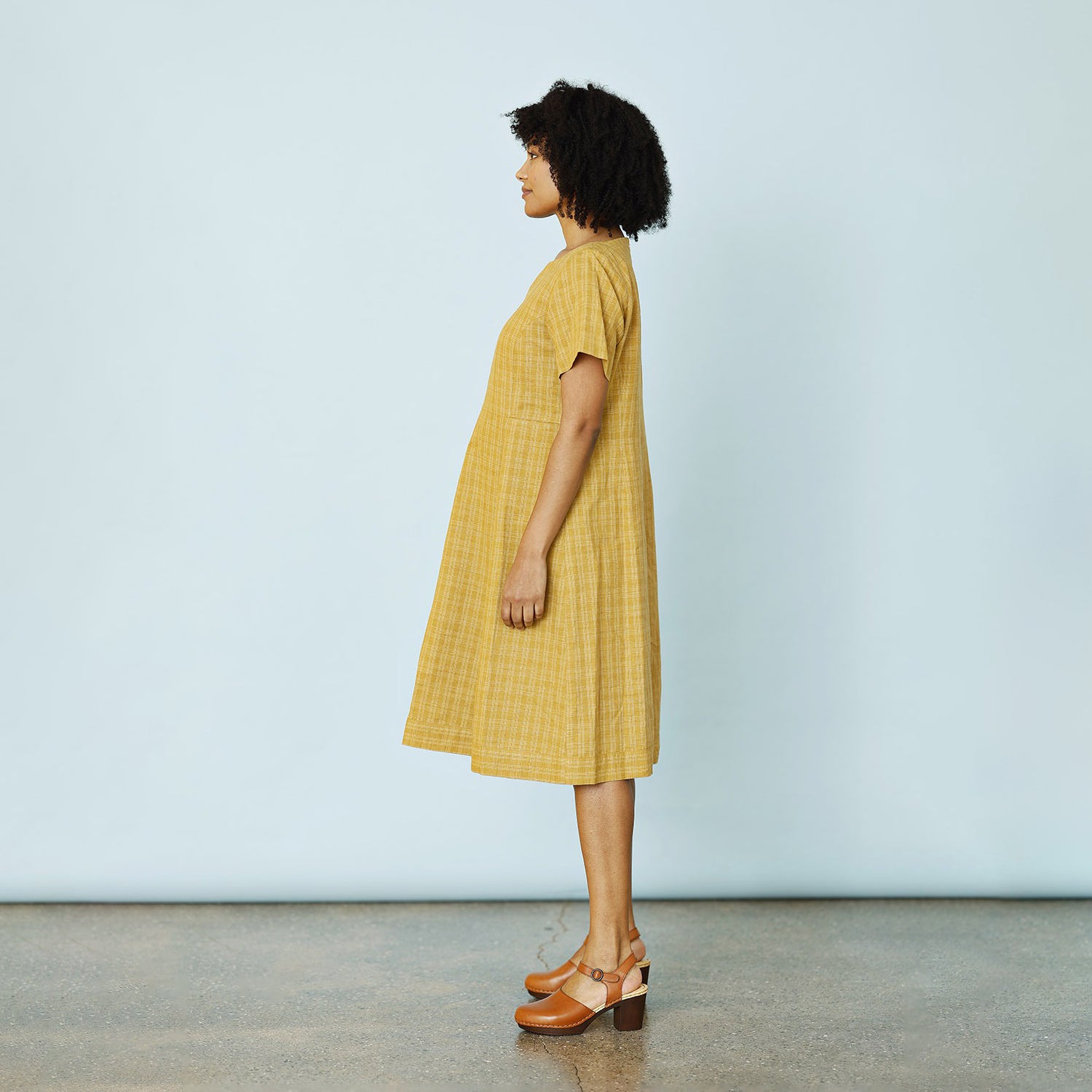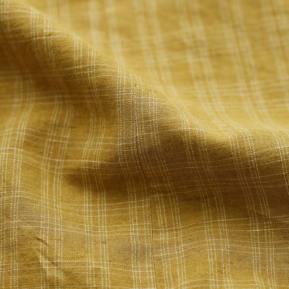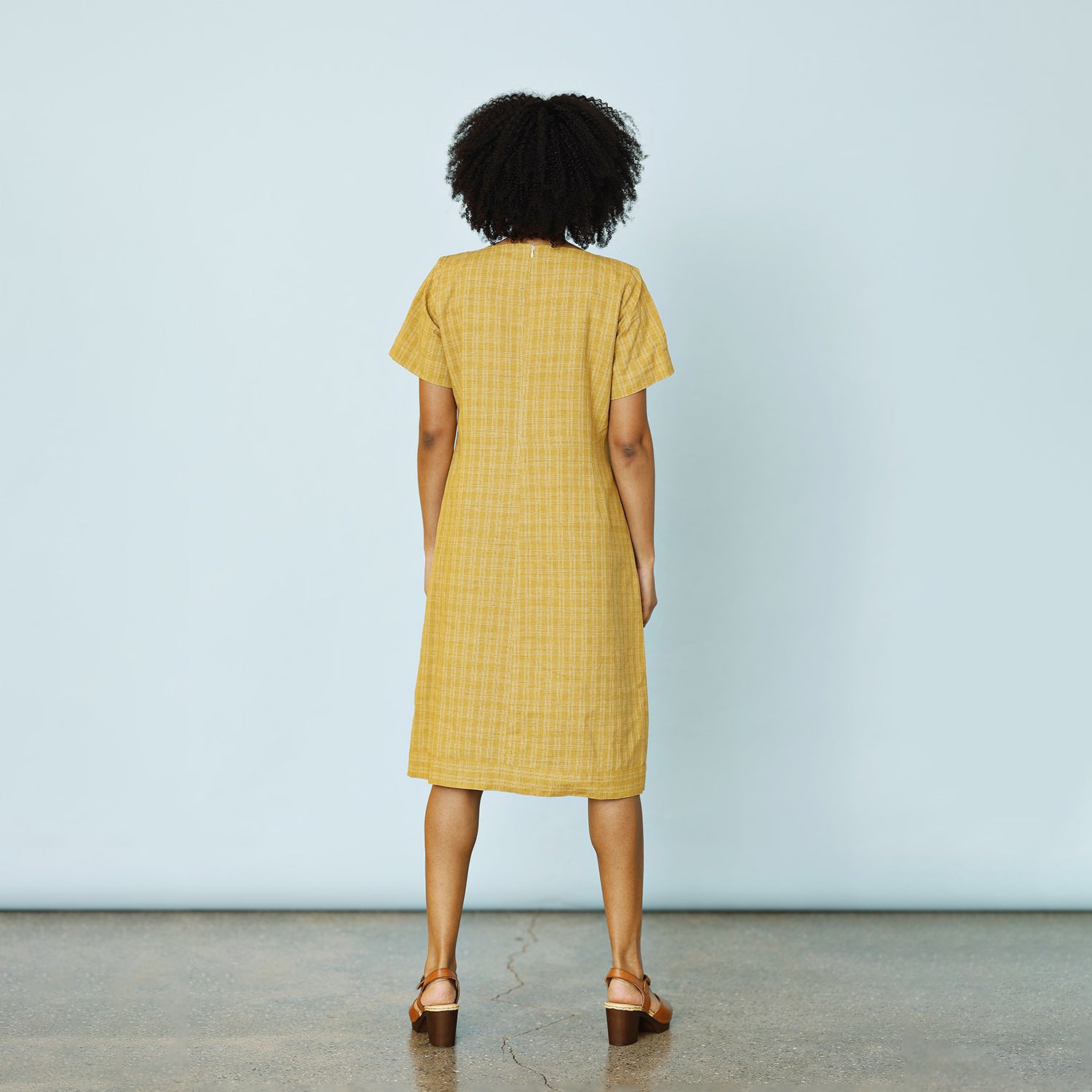 Currygul klänning från McVerdi i en fin lin- och bomullsblandning med ett diskret rutmönster. En enkel men mycket välsittande klänning med en smal silhuett, samtidigt både ledig och elegant i passformen.