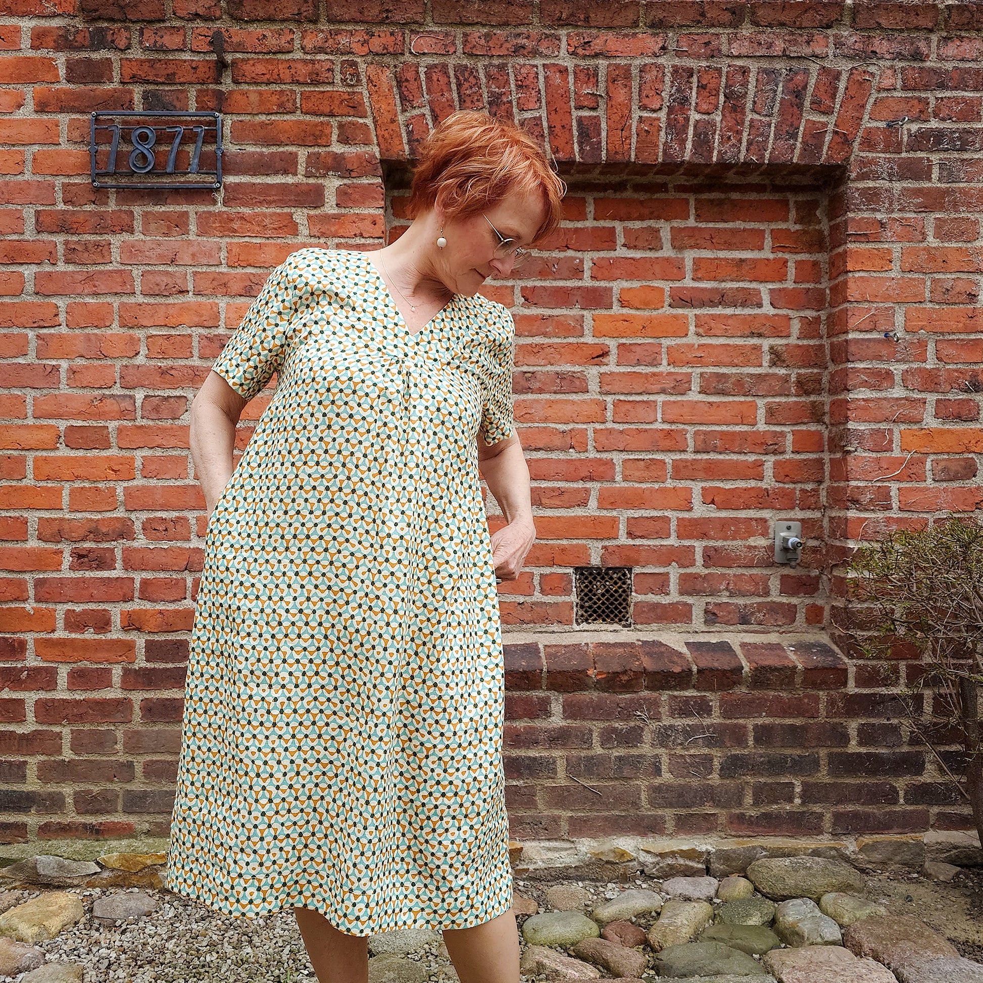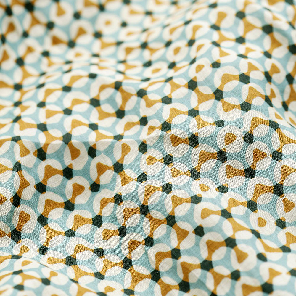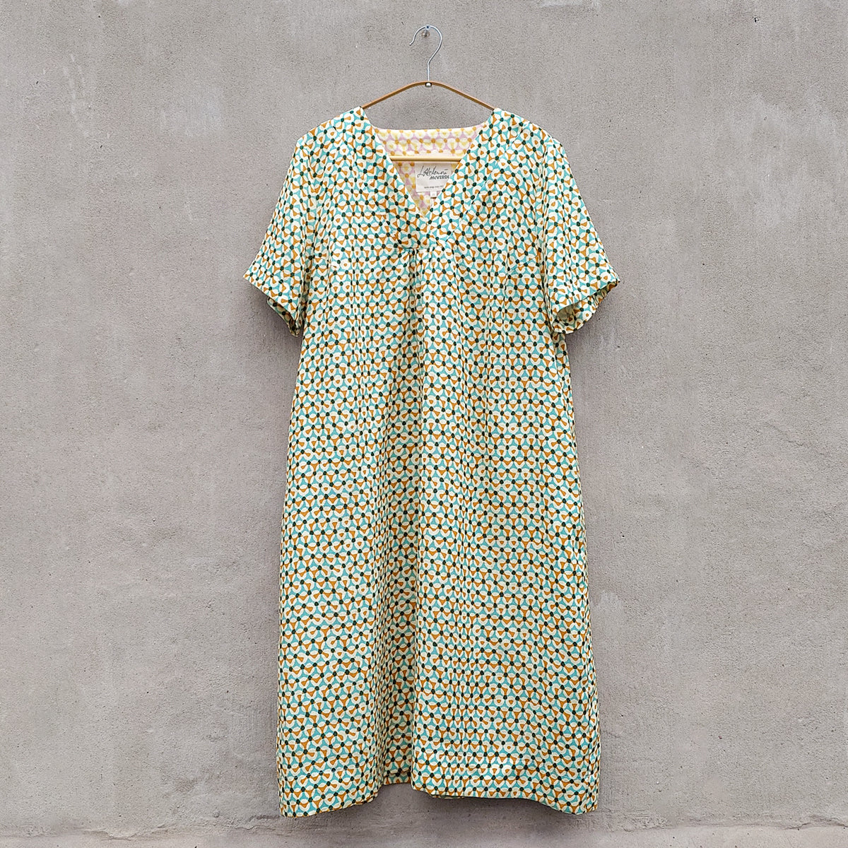 Enkel och tidlös sommarklänning i en fantastisk linnekvalitet med grafiskt tryck i turkos och currygula nyanser. En ledig och bekväm linneklänning för alla tillfällen och som passar de flesta kroppsformer. Från danska märket McVERDI.