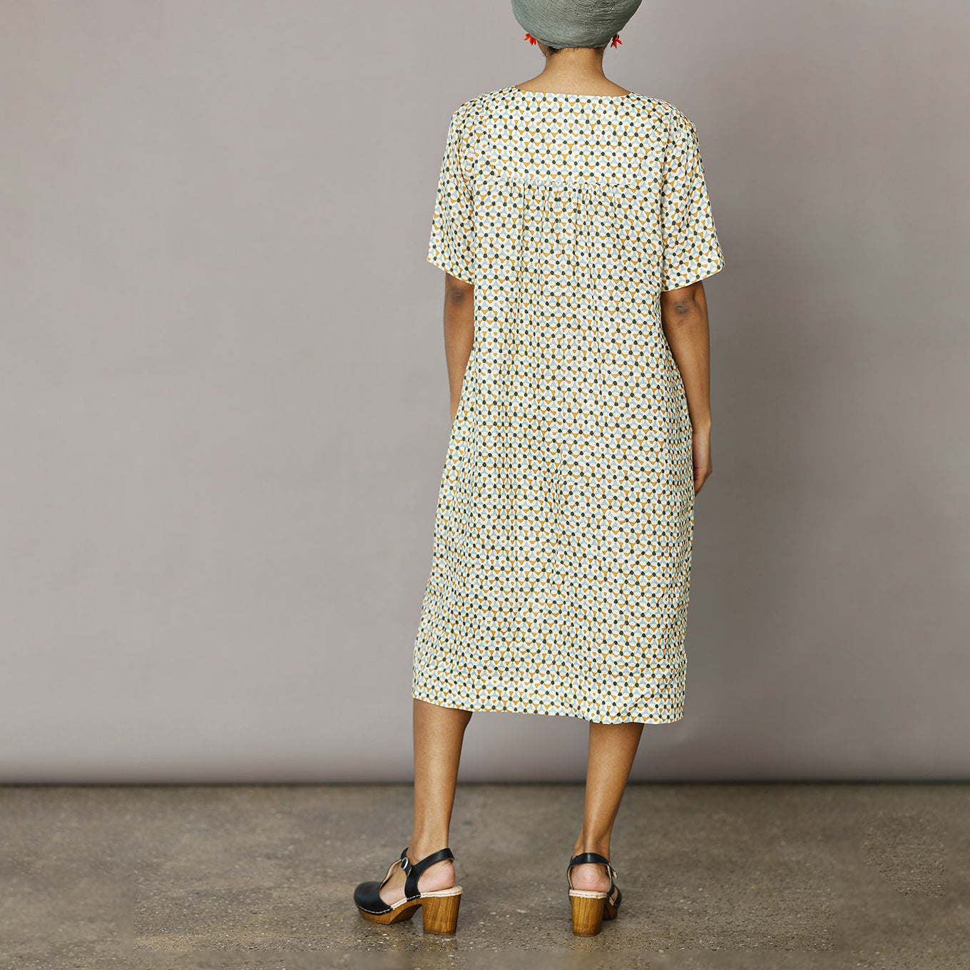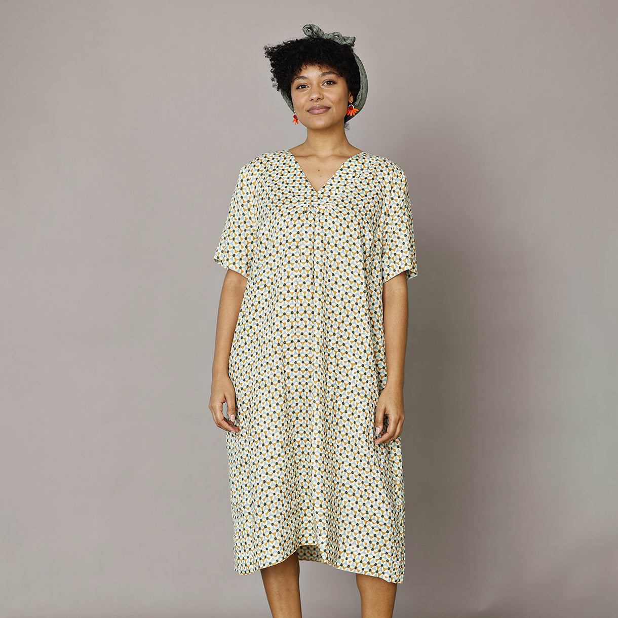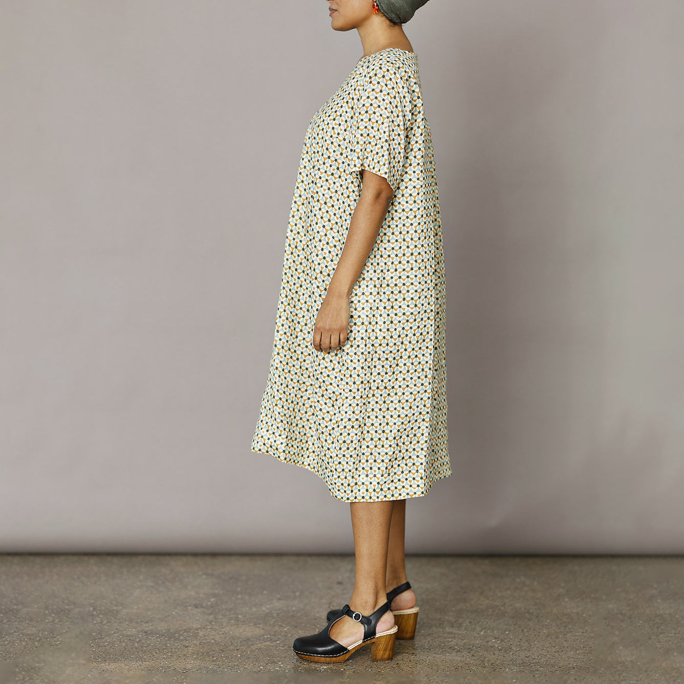 Enkel och tidlös sommarklänning i en fantastisk linnekvalitet med grafiskt tryck i turkos och currygula nyanser. En ledig och bekväm linneklänning för alla tillfällen och som passar de flesta kroppsformer. Från danska märket McVERDI.