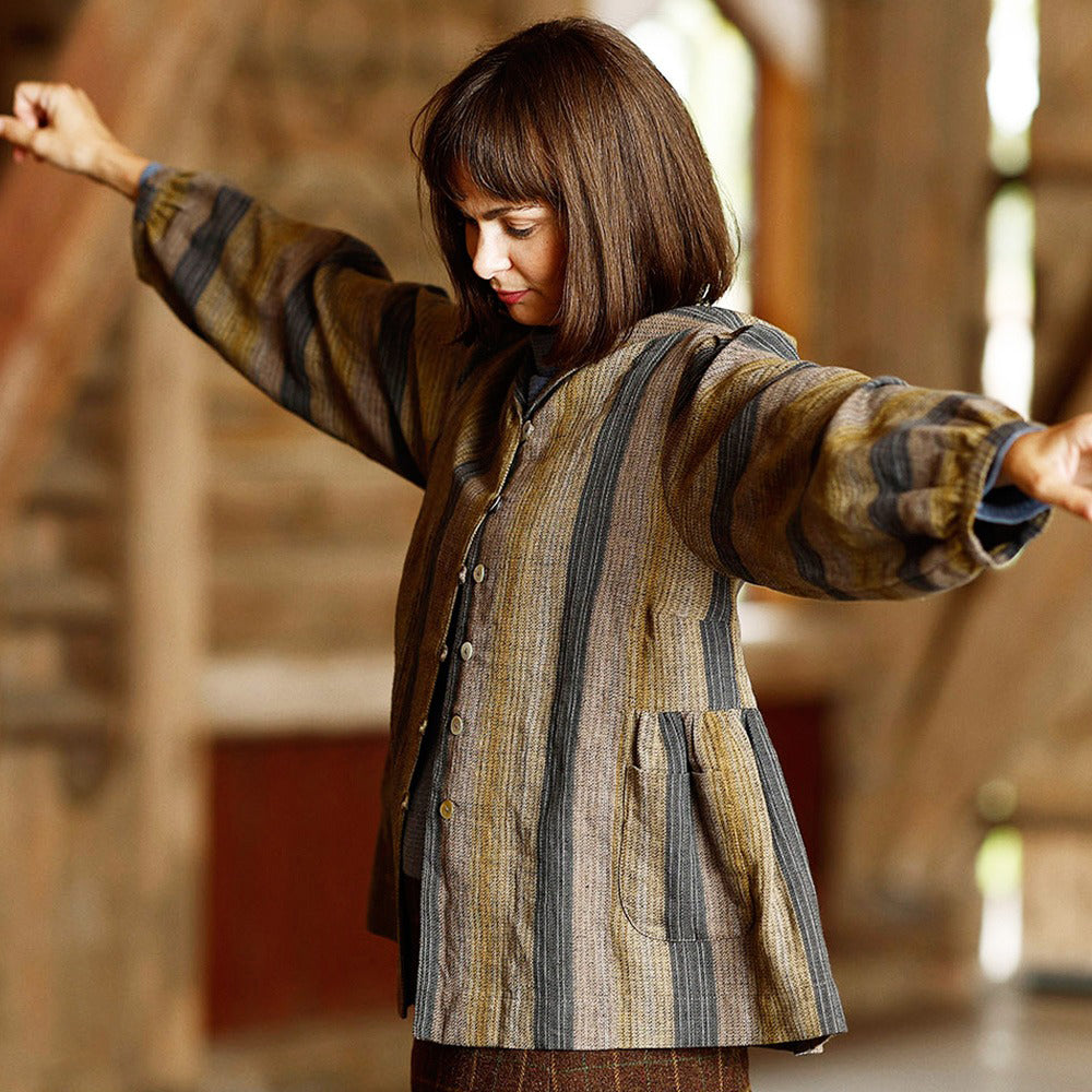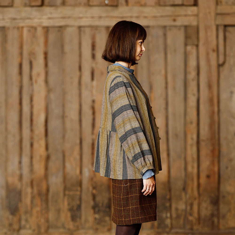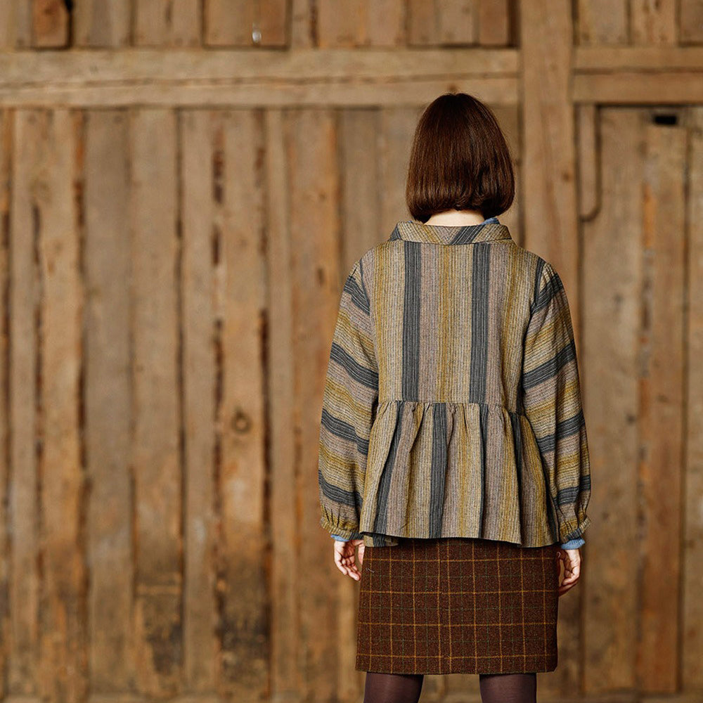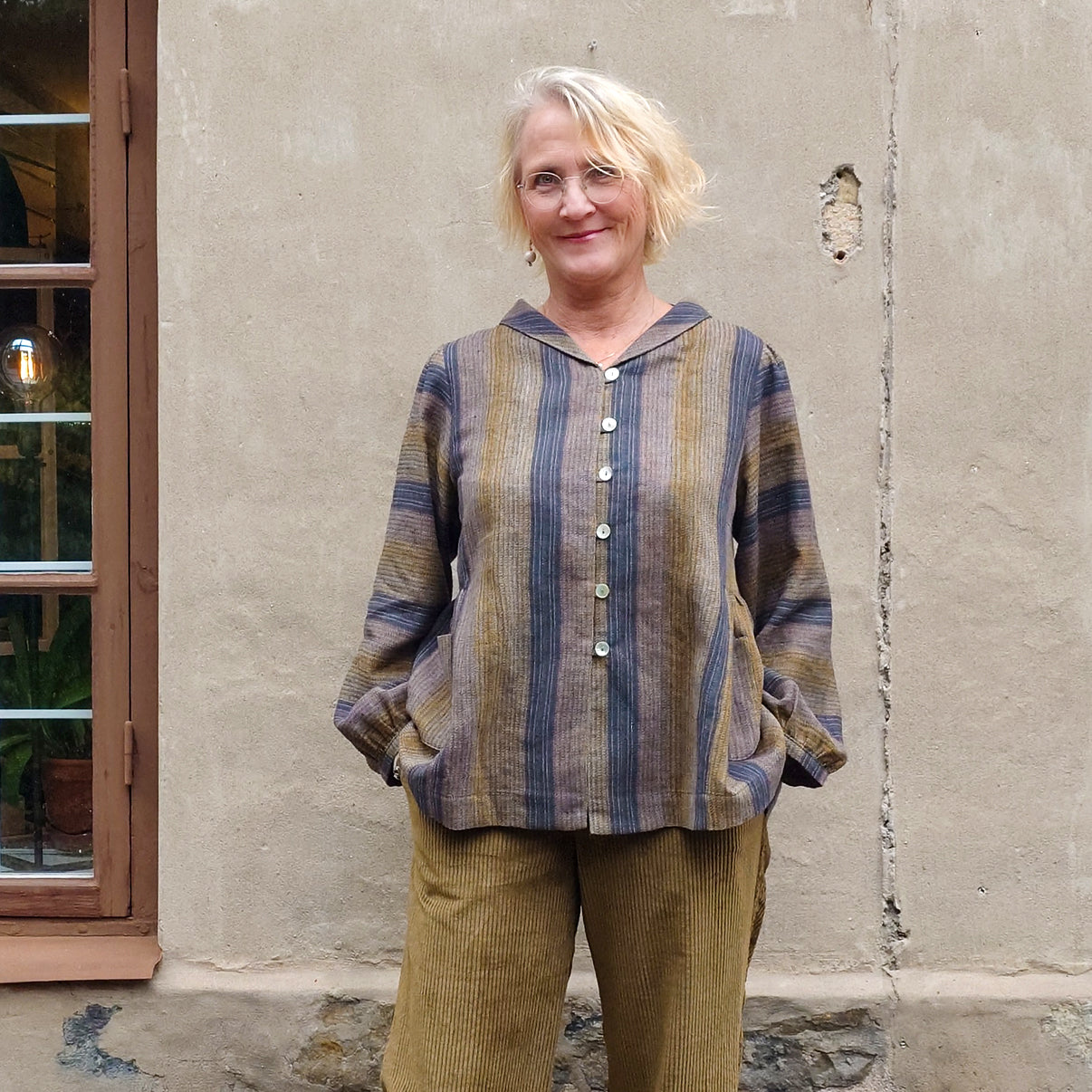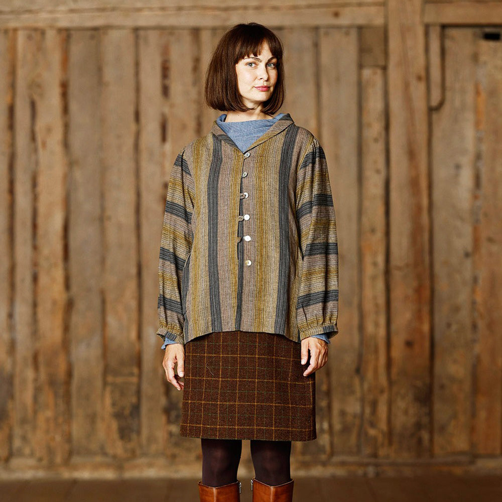 Sydd i ett gråbeige tyg i bomull och ull med dämpat blå och senapsgula ränder. Tyget har en elegant vävning och exklusiv struktur som gör skjortblusen intressant och annorlunda.