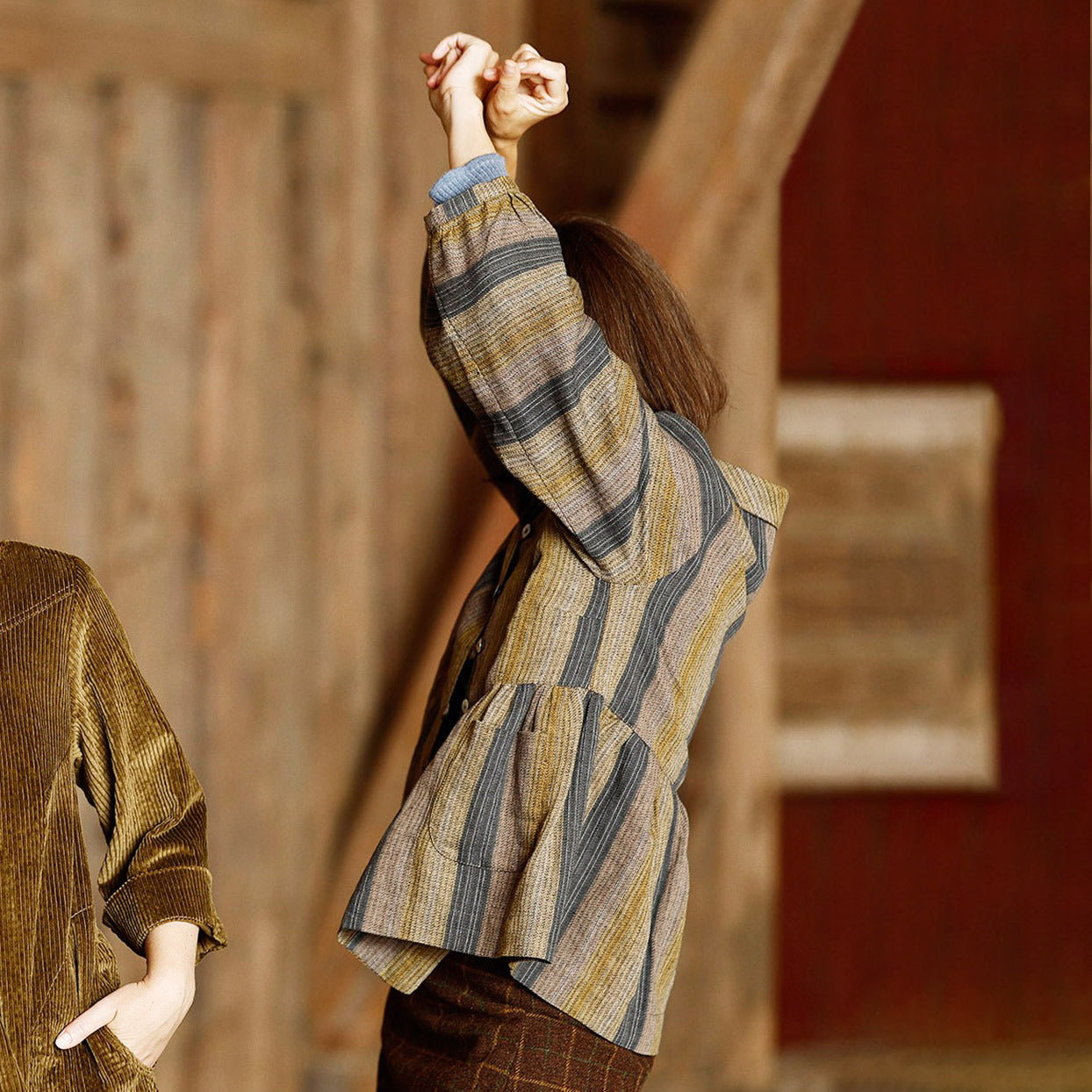 Söt liten randig skjortblus med knappar och sjalkrage i linne/bomull.