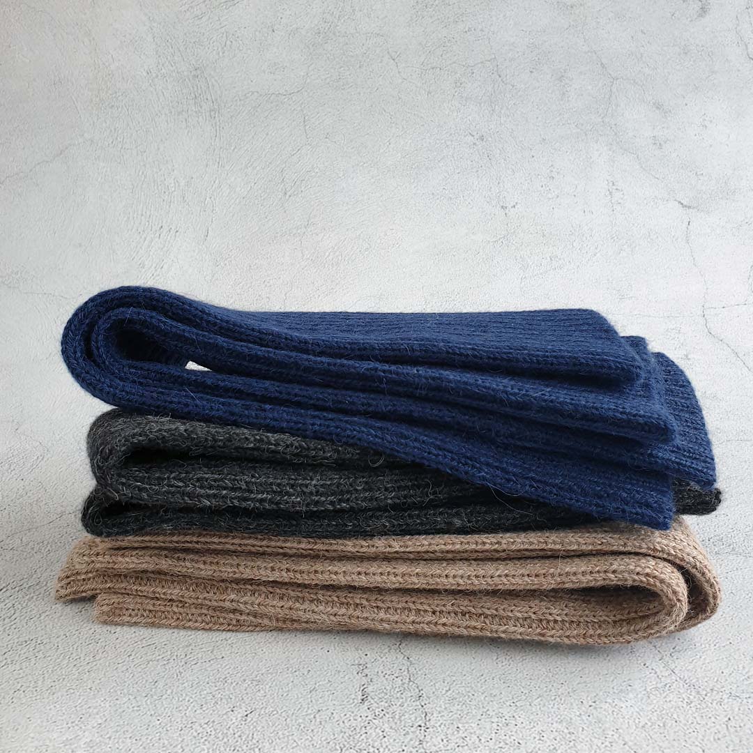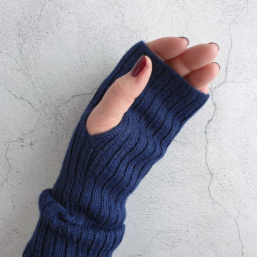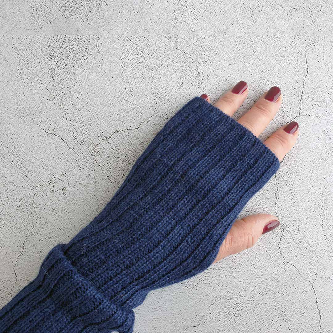 Ribbstickad armvärmare i otroligt mjuk och silkeslen alpackaull. Med hål för tummen.