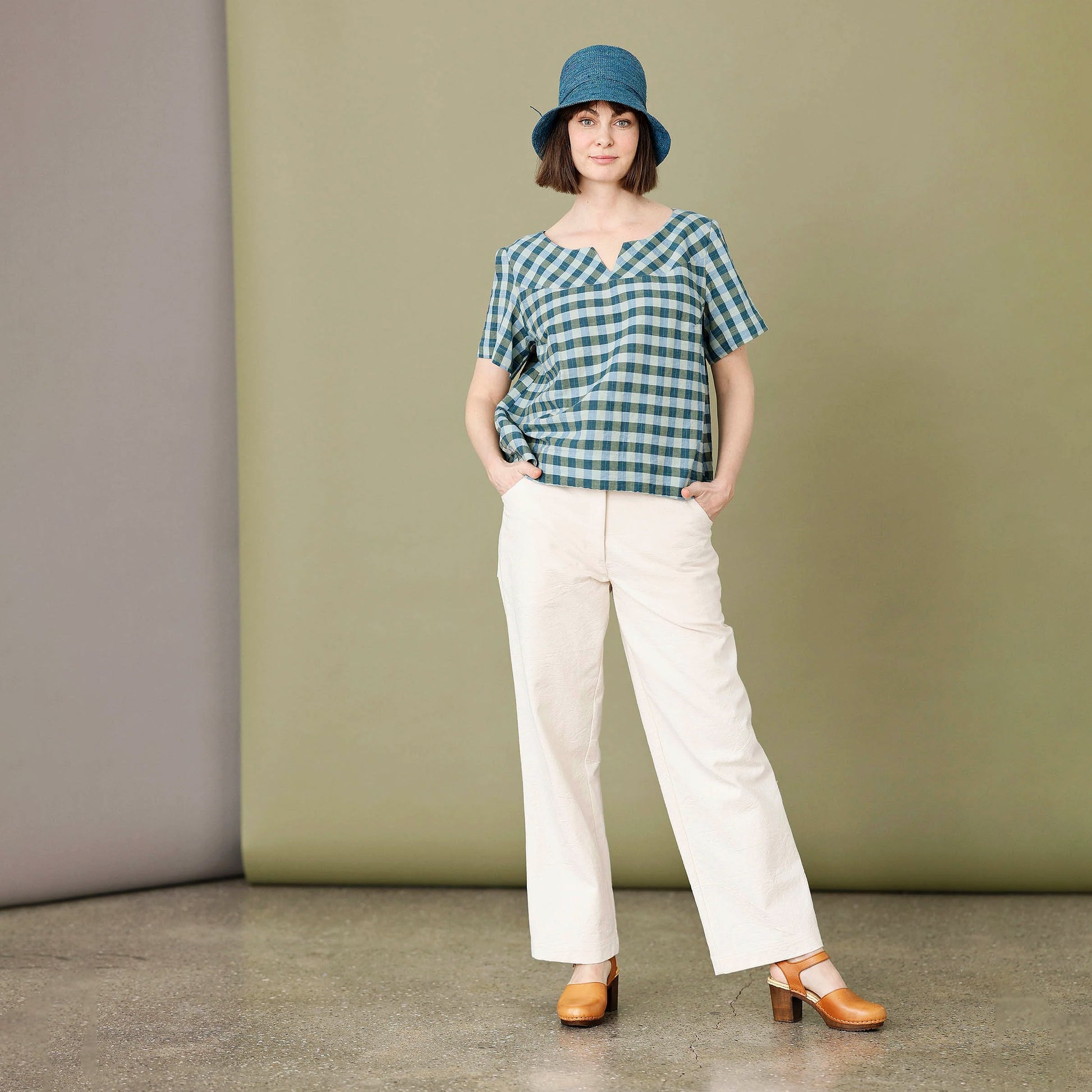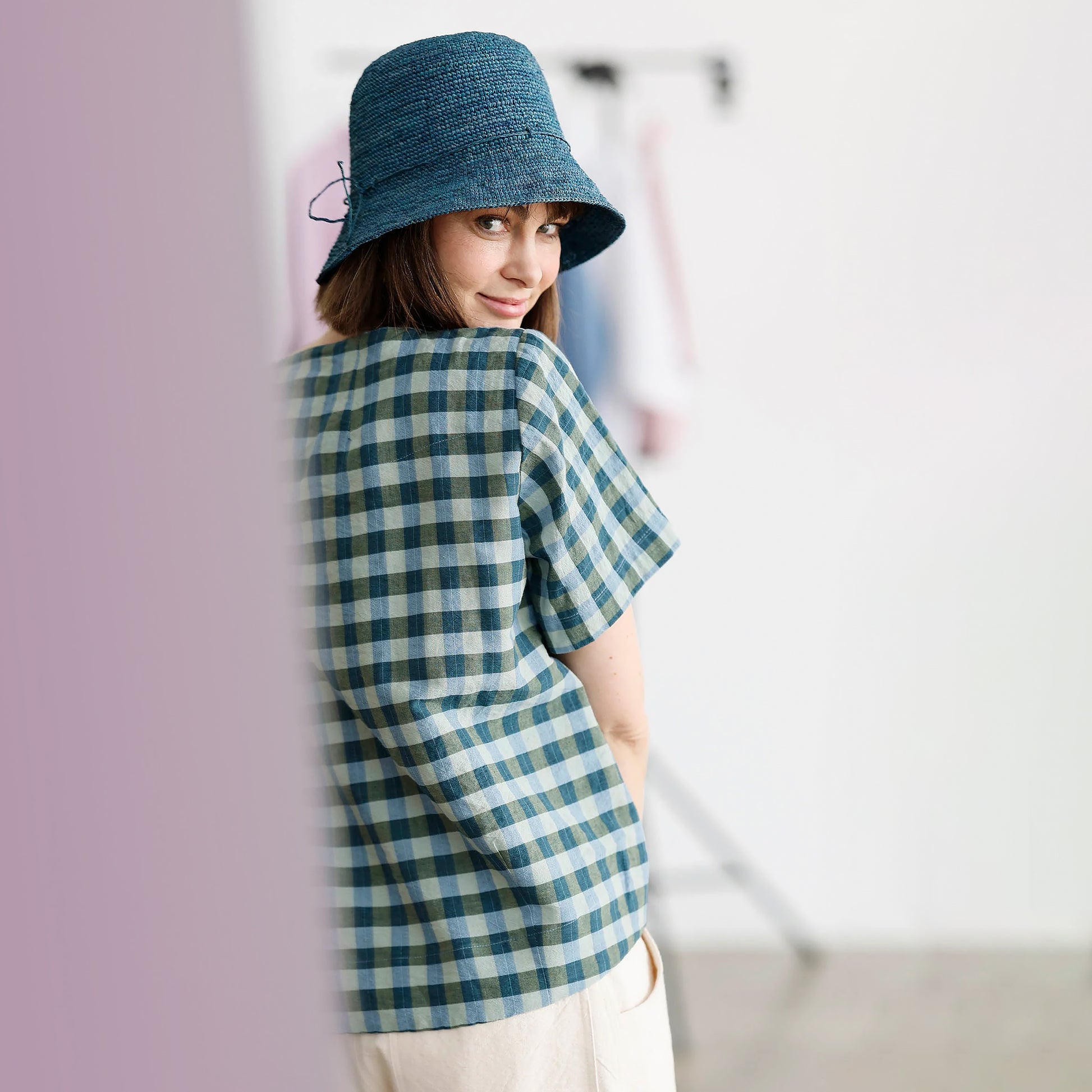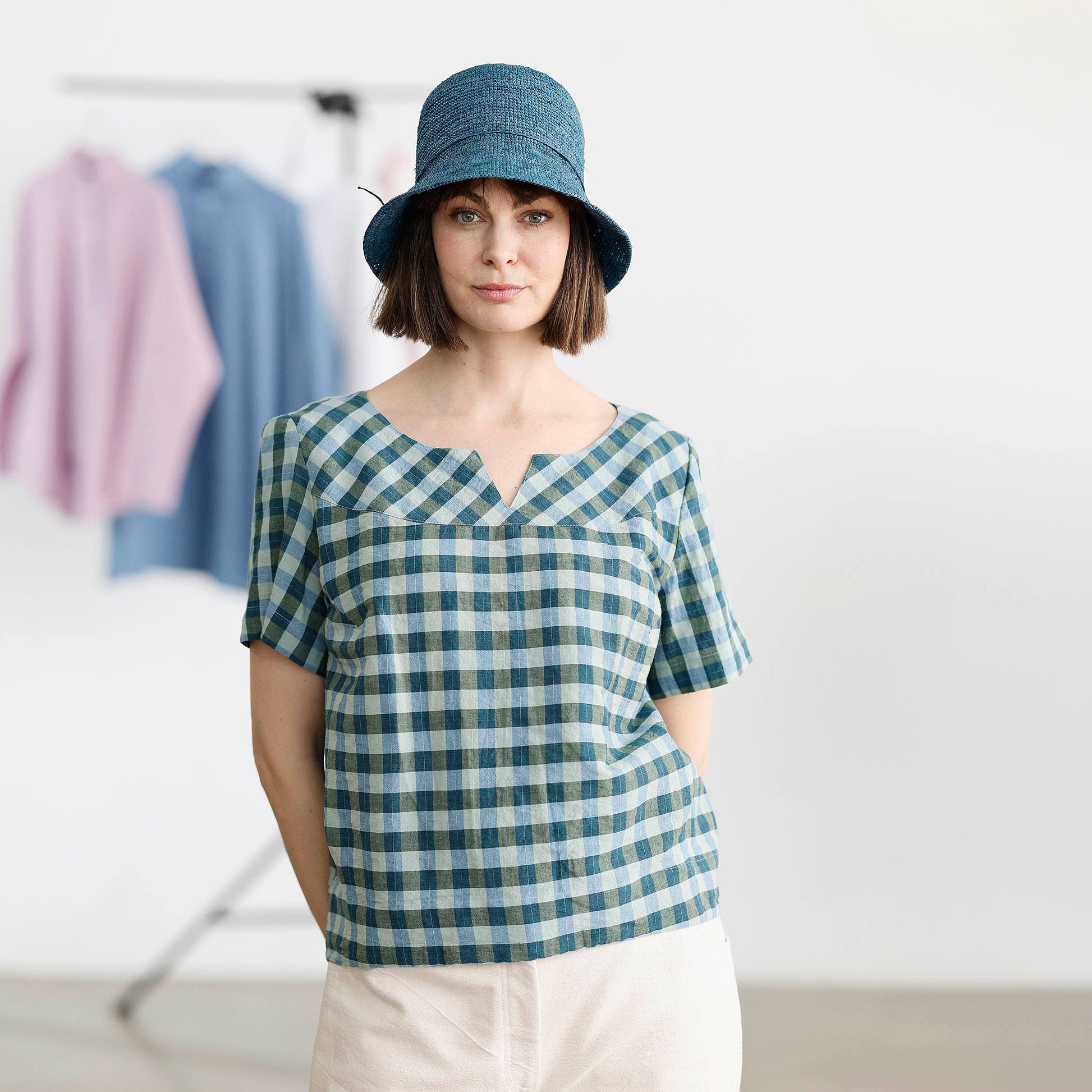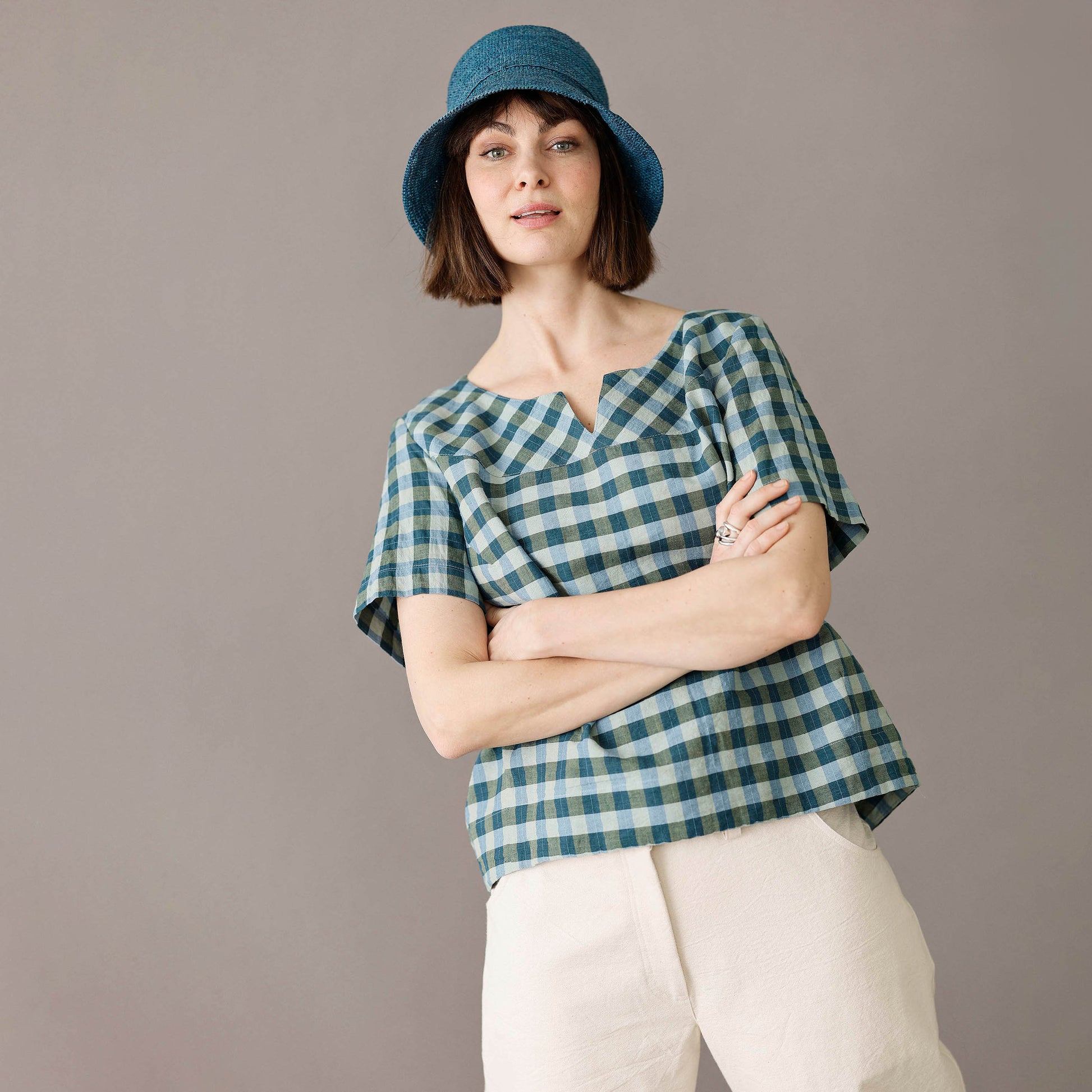 Blusen är sydd i en exklusiv blandning av bomull och linne som ger den en lätt och luftig känsla – perfekt för både vardag och lite finare tillfällen. Det rutiga tyget går i gröna och blå nyanser – en mångsidig färgkombination som är lätt att matcha.