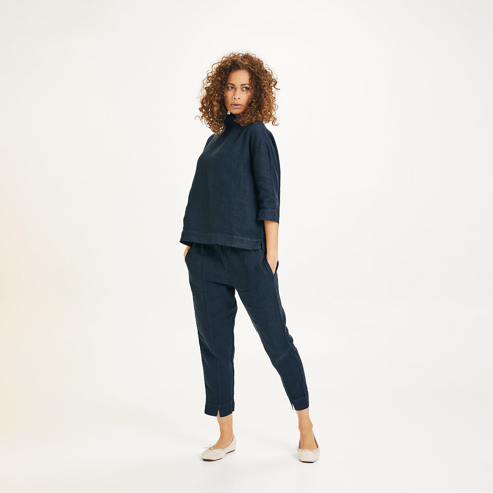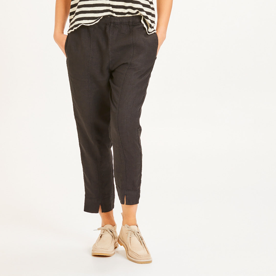 Smala ankelkorta byxor i 100% lin. Släta fram med bekväm resår baktill. Fickor i sidorna och litet sprund i benslutet framtill. Otroligt mjuk linnekvalitet med fint fall.