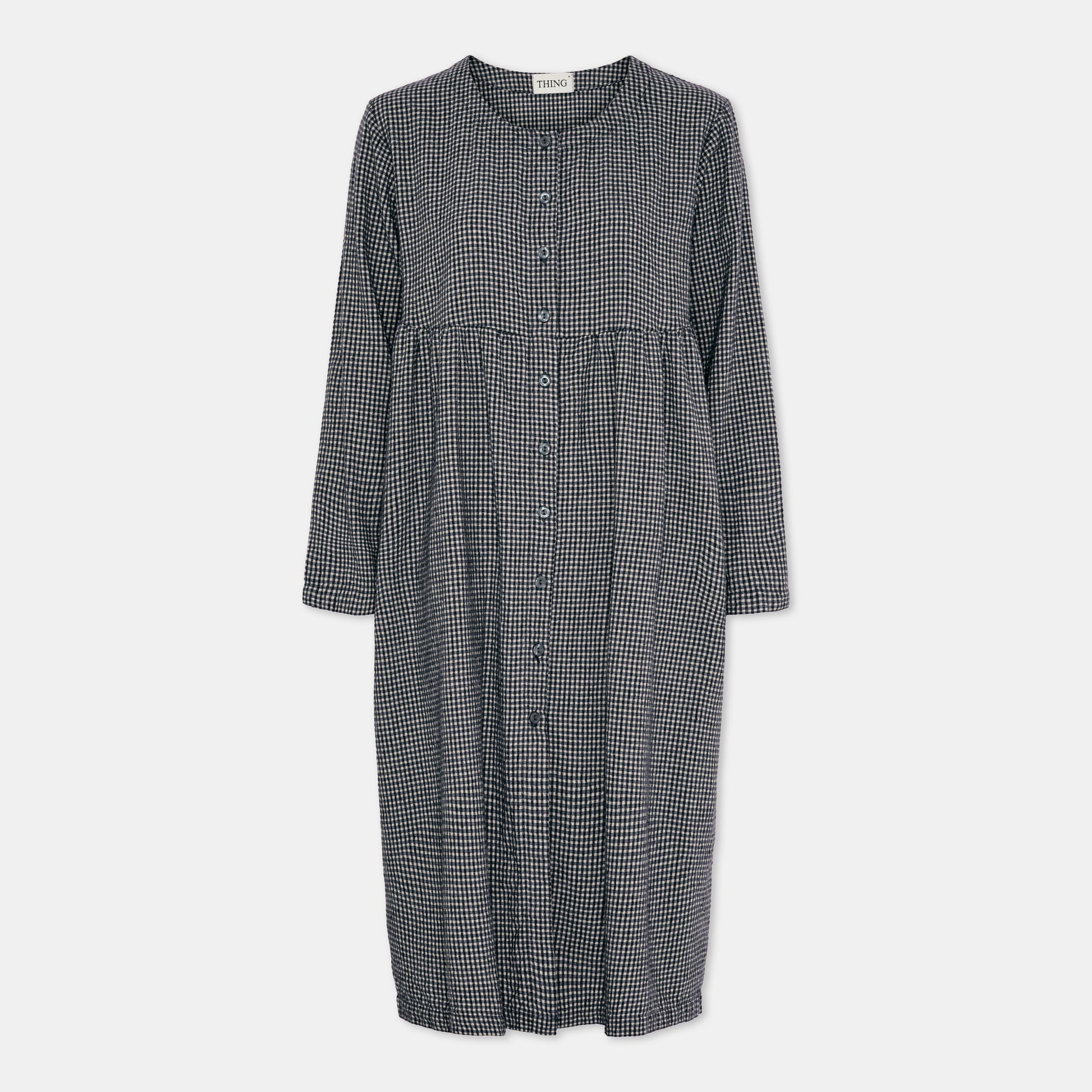 Helknäppt skjortklänning i mjuk och lätt bomullsmix som påminner om flanell. En mysig höst och vinterklänning, fin med ullstrumpbyxor eller tjocka raggsockar. Kan också bäras öppen till topp och byxor eller över en klänning.