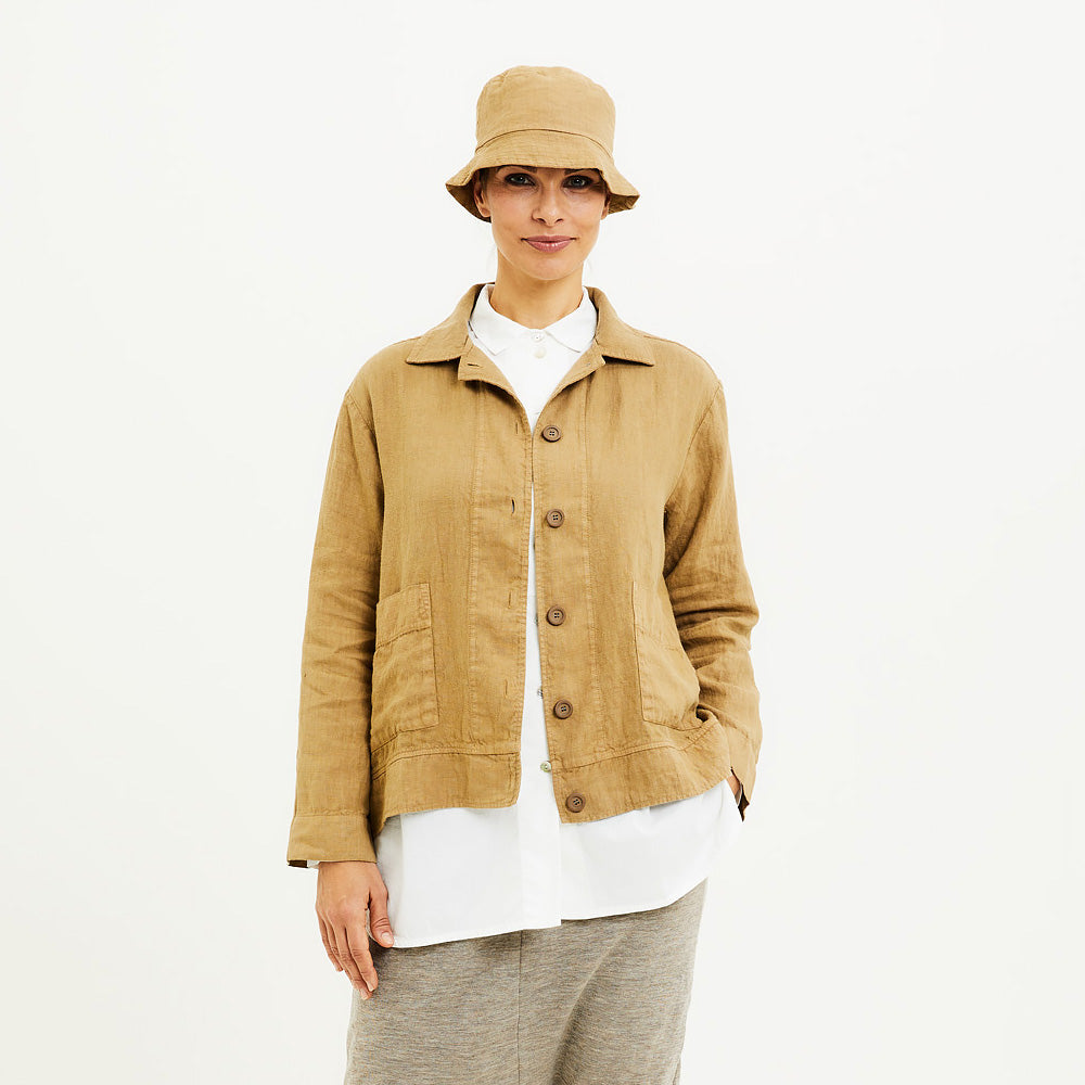 Kort jacka i mjuktvättat linne, från OWN by basics. Bekväm modell som påminner om en jeansjacka. Med enkel krage och påsydda fickor. Snygg vår- och sommarjacka men användbar även milda höstdagar med en lite tjockare ylletröja under.