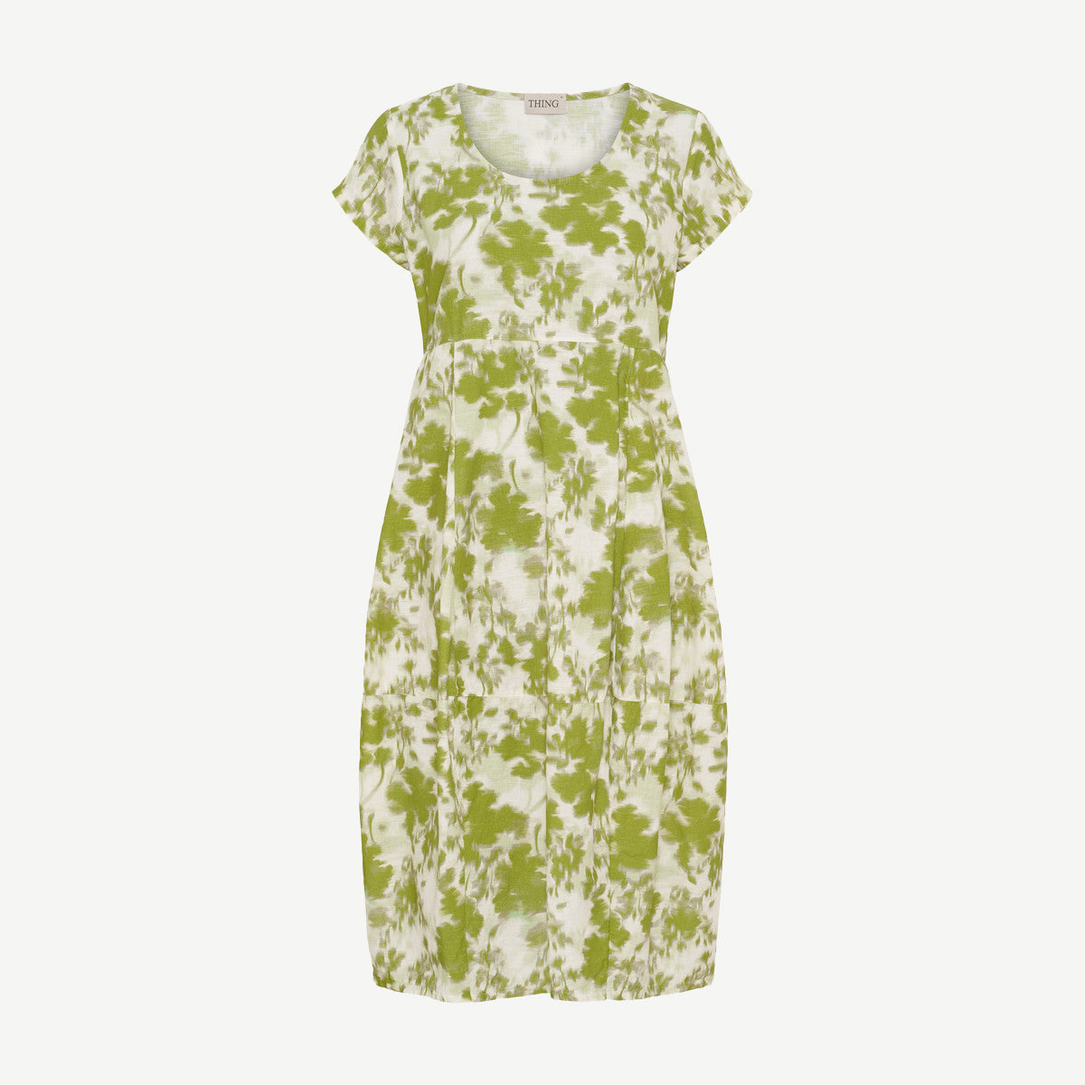 Klassisk ballongklänning i ekologisk bomull och lin med tryckt mönster i gröna toner, från Thing.