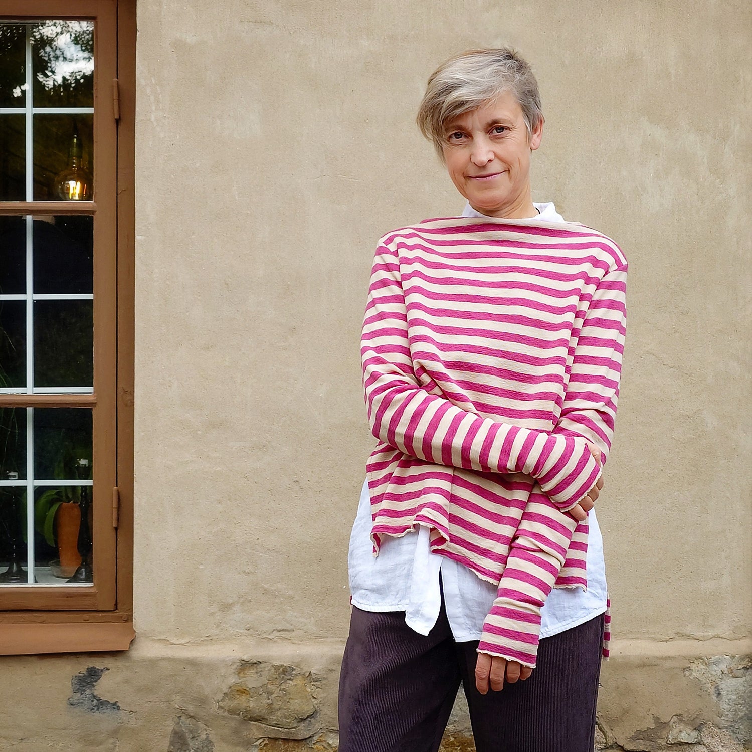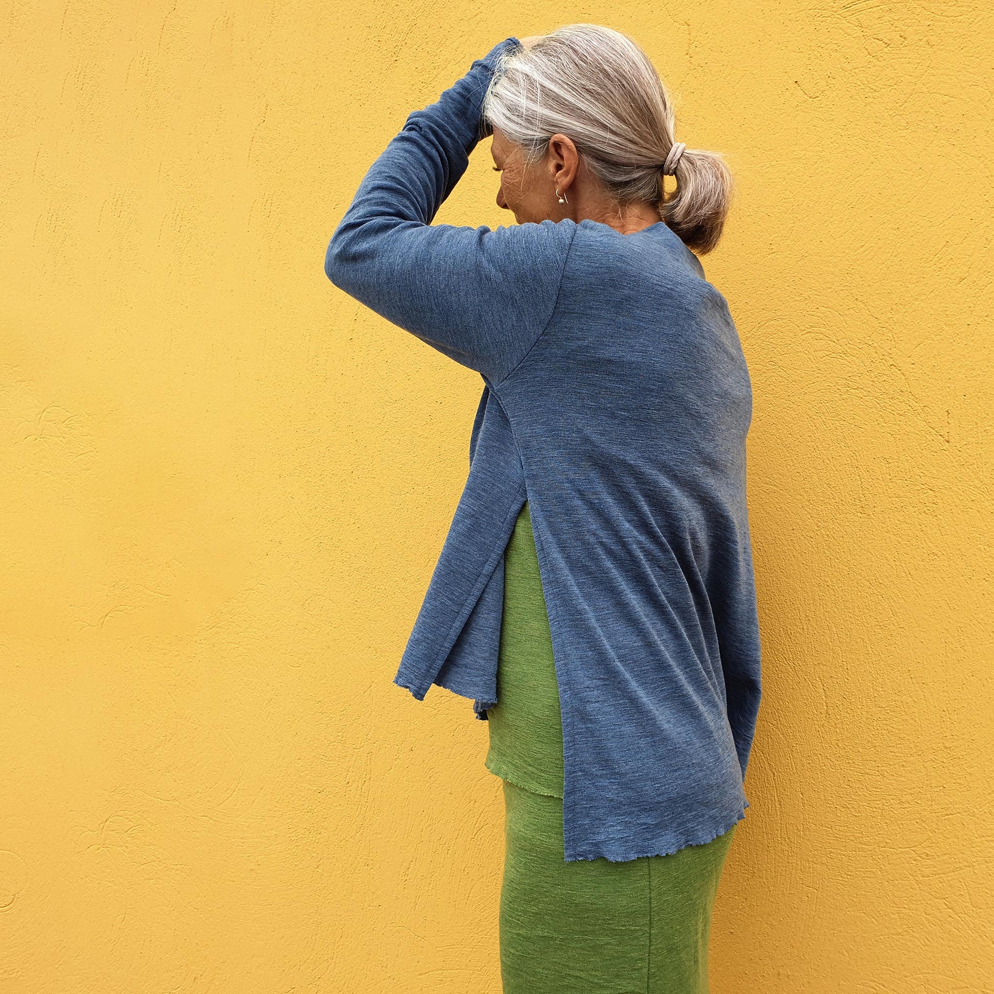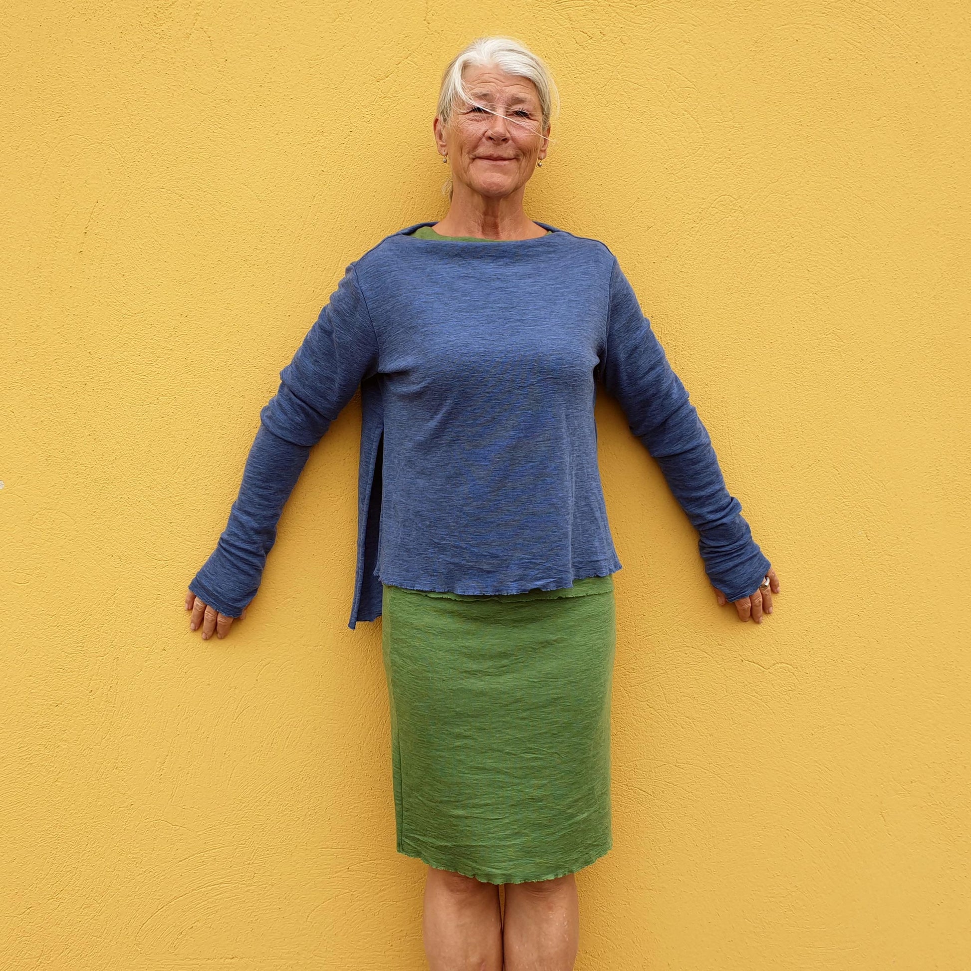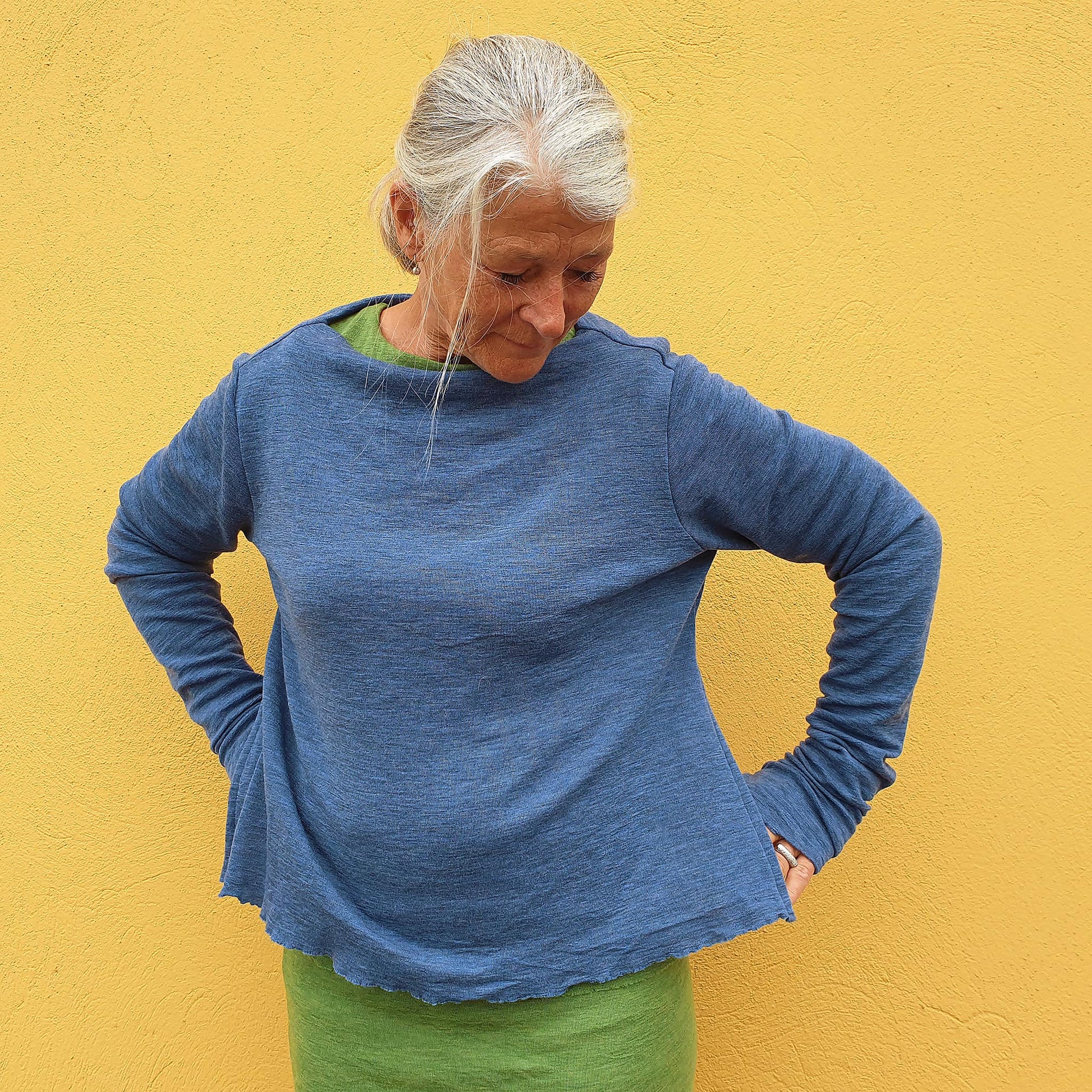 Tröja i 100 % merinoull från danska by basics. Tröjan har högt skuren båthals och höga slitsar i sidorna. Slitsarna gör att tröjan anpassar sig till kroppsformen och öppnar sig mer nedtill om det behövs. Bakstycket är lite längre än framstycket. De extra långa ärmarna har hål för tummen som gör att du får inbyggda pulsvärmare - smart!