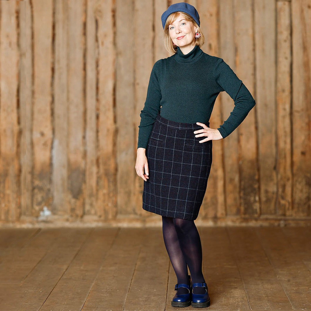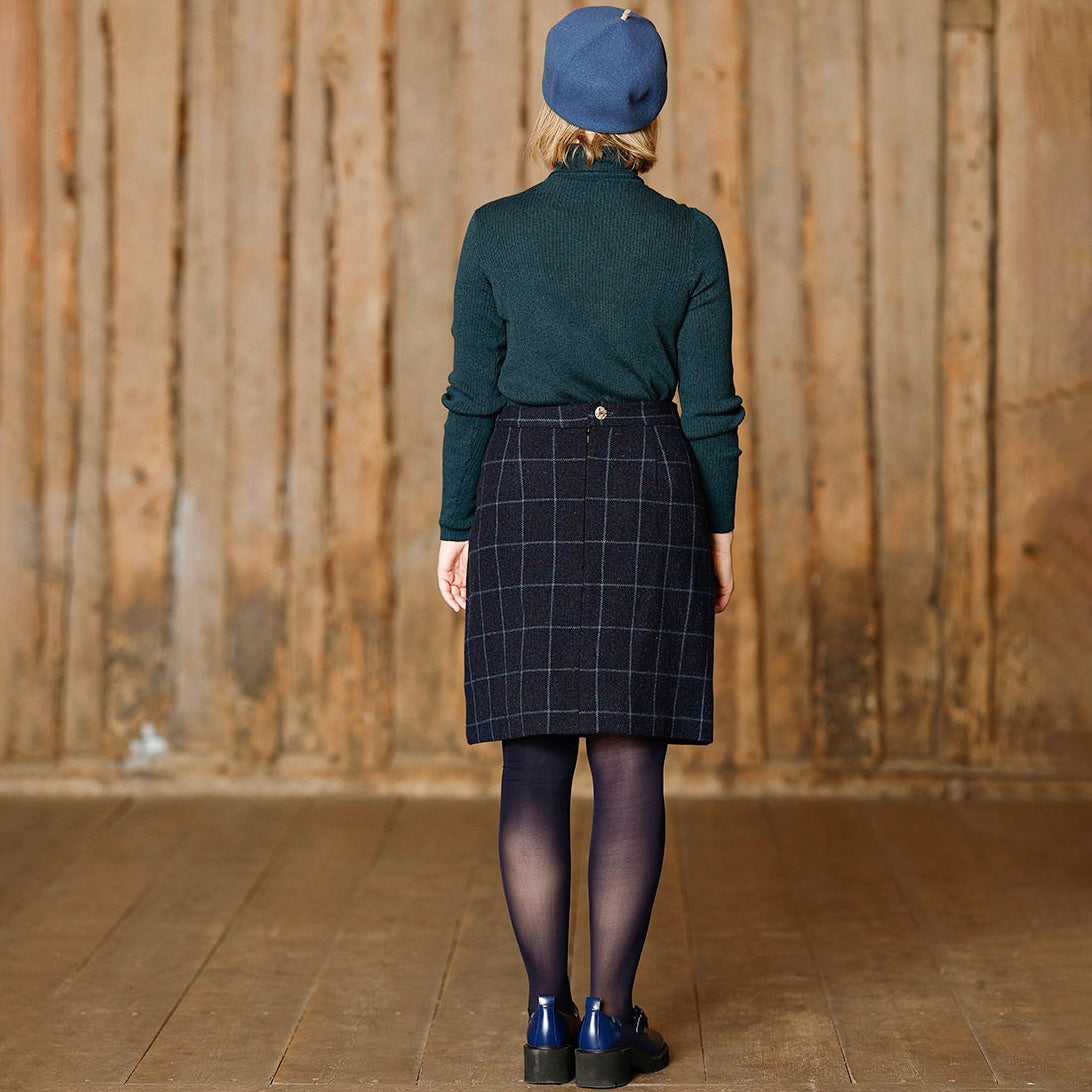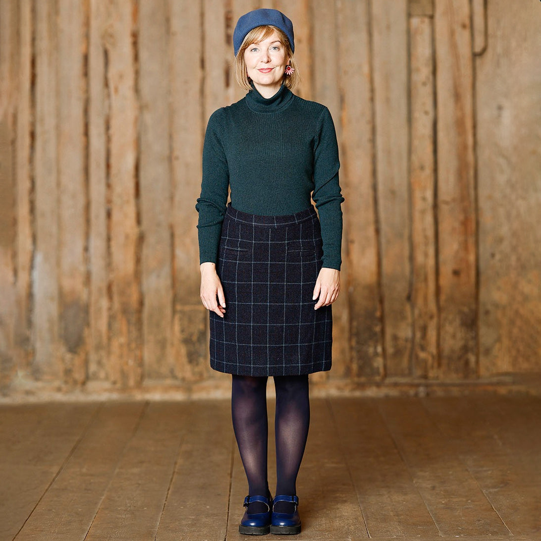 Tyget är snyggt rutigt i mörkblå med smala ränder i ljusblått och vinrött. Färgerna gör det enkelt att matcha kjolen med By basics tunna stickade tröjor och koftor i merinoull.