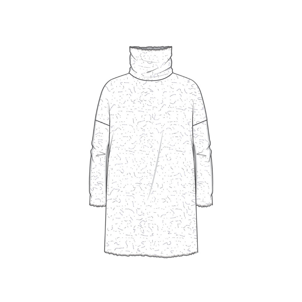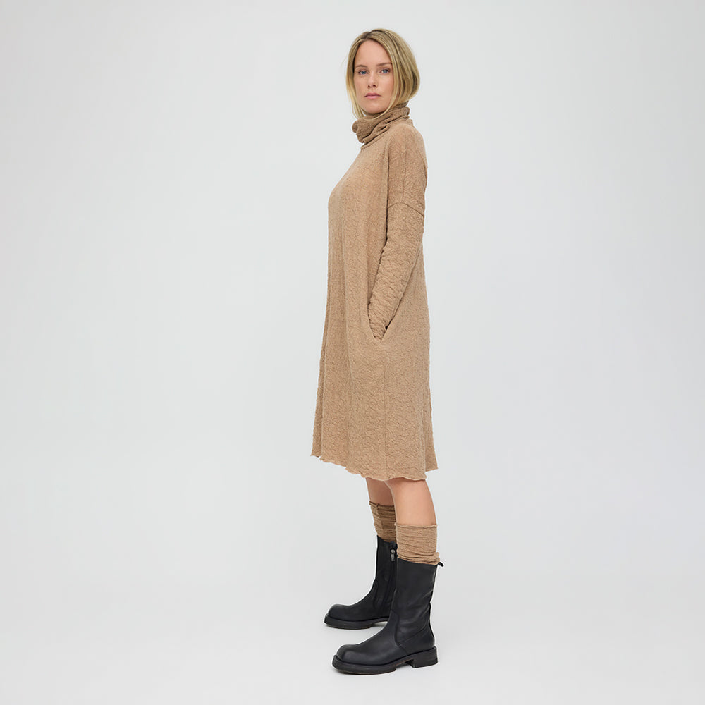 Klänning i tunn jacquardstickad merinoull med struktur. En klänning som är både snygg och otroligt bekväm, och som tack vare den fina strukturen även fungerar i lite festligare sammanhang. Den långa ärmen med hål för tummen gör den extra varm och mysig.